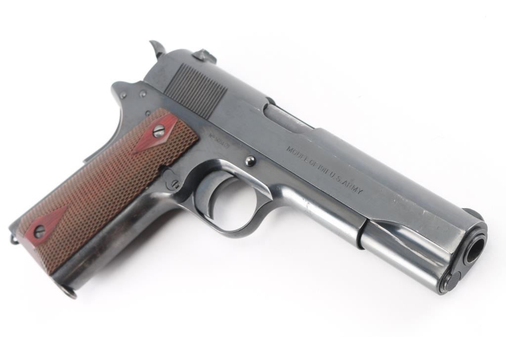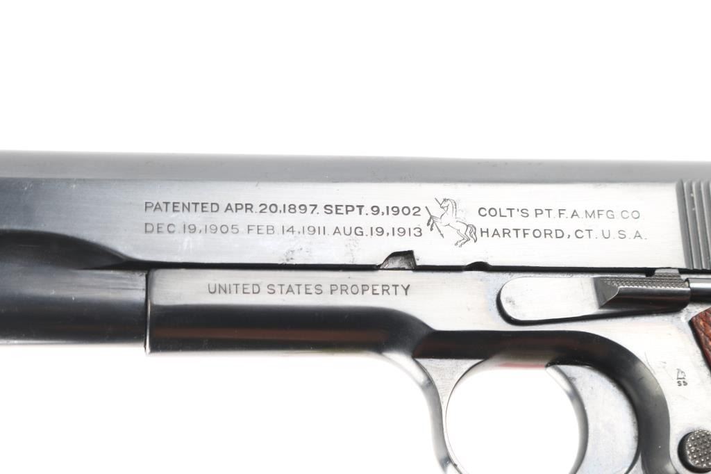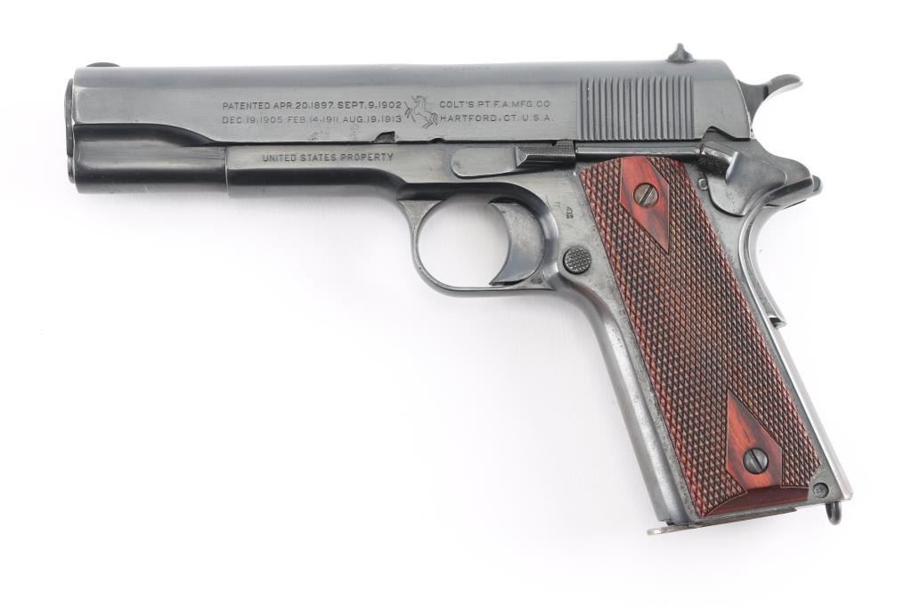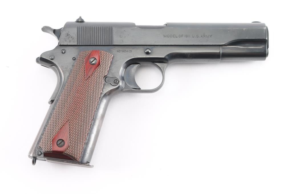 U.S. Military Issued sidearm. WW1 pistol manufactured 1918. "S5" eagle head proof above magazine release, "45" stamped on left triggerguard. Right Slide stamped "Model of 1911. U.S. Army" Colt's Patent's and Address in two lines on left slide with "Rampant Colt". "United States property" on left frame. "H" stamped on the rear of the slide above the firing pin stop plate, "8" under plate. Smooth, flat mainspring housing. Grip safety. Lanyard ring. Re-blued finish. Brown checkered wood "Diamond" grips, appear to be newer replacements. Bore appears good bright with some frosting in the grooves. Grips are very good. Action is crisp/tight. Re-blued finish is about 90% with handling loss to the straps, edge wear & minor scratches. Comes with one two-tone 8-rd magazine, unmarked.