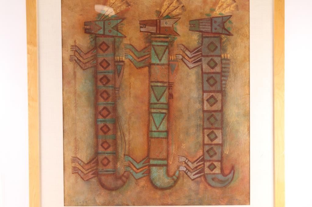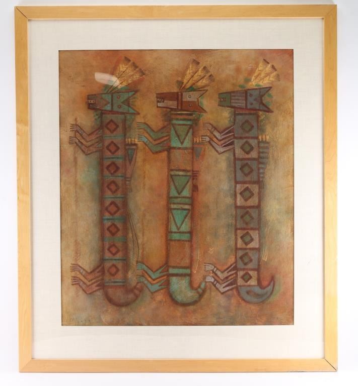 by famous Hopi artist David Dawangyumptewa, hand- signed and dated 1998, depicts three kachinas with rust colored background with maple frame. Measures 32"x28".