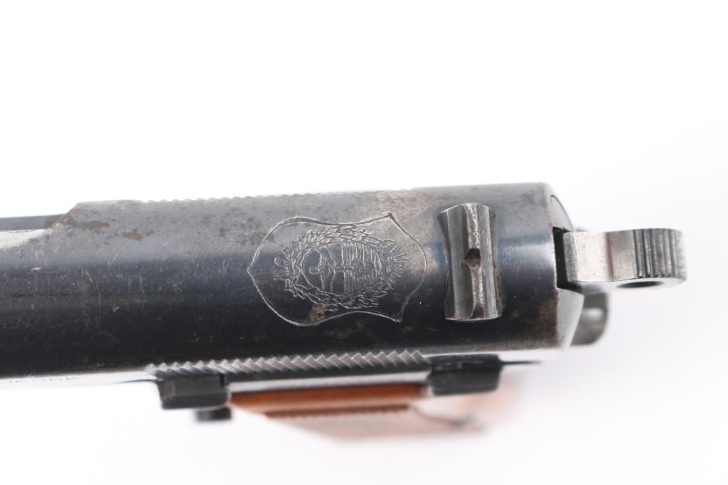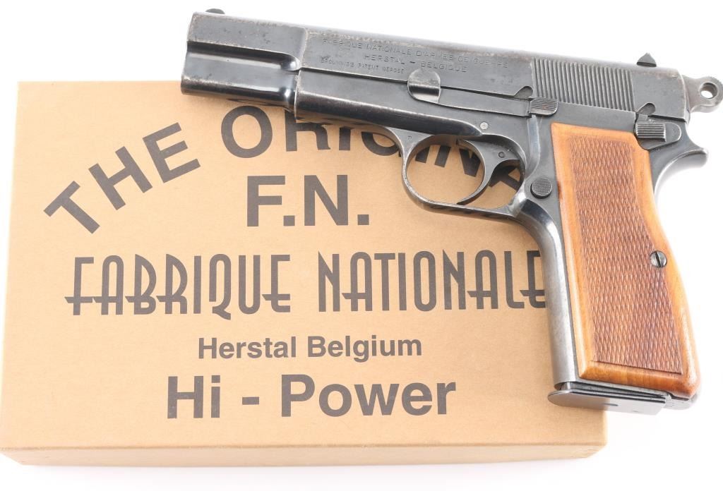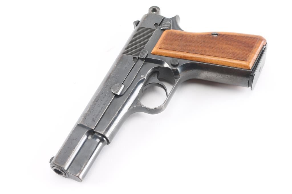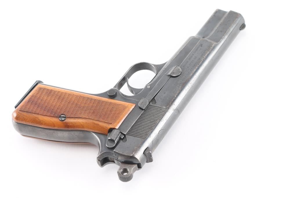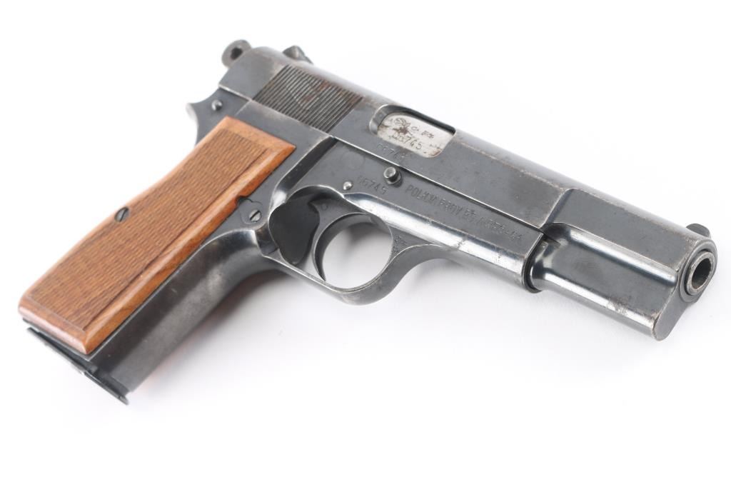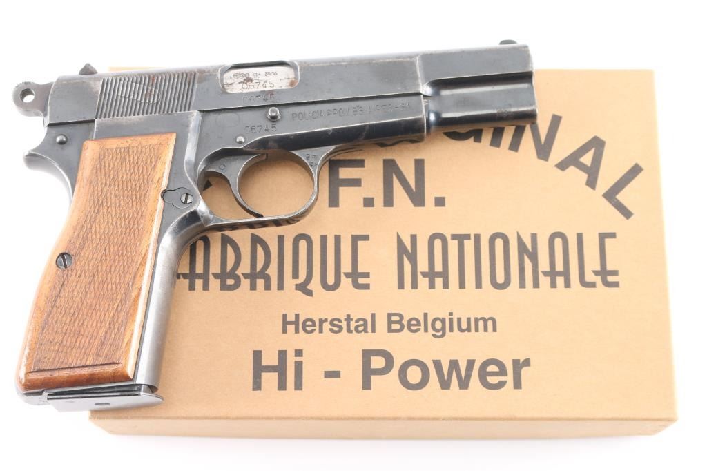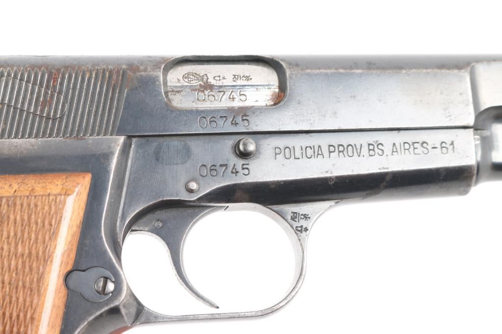 Early "Browning Hi Power" service pistol sold to Buenos Aires Police in Argentina, circa 1961. Roll die marking on right side of frame "POLICIA PROV. BS. AIRES-61". Argentinean crest stamped on top of slide. Features a blued finish, 4.75" barrel, round blade front sight, dovetailed rear sight with ‘u’ notch, smooth trigger, serrated rowel hammer spur, manual safety/slide catch on the left side of the frame, magazine safety, push button magazine release. Bore is serviceable, good rifling, with frosting and some erosion. Pistol has 85%-95% coverage of old arsenal type re-blue with sharp markings. Minor rust and erosion may clean. Wood grips with pressed checkering are almost fine condition, are of a later period than manufacture of the pistol. Numbers match on barrel, frame, slide. Mechanically sound. Includes one magazine, and importer cardboard box.