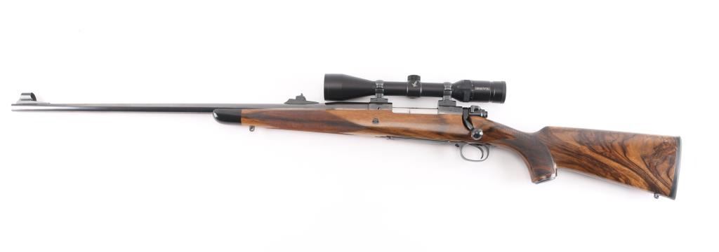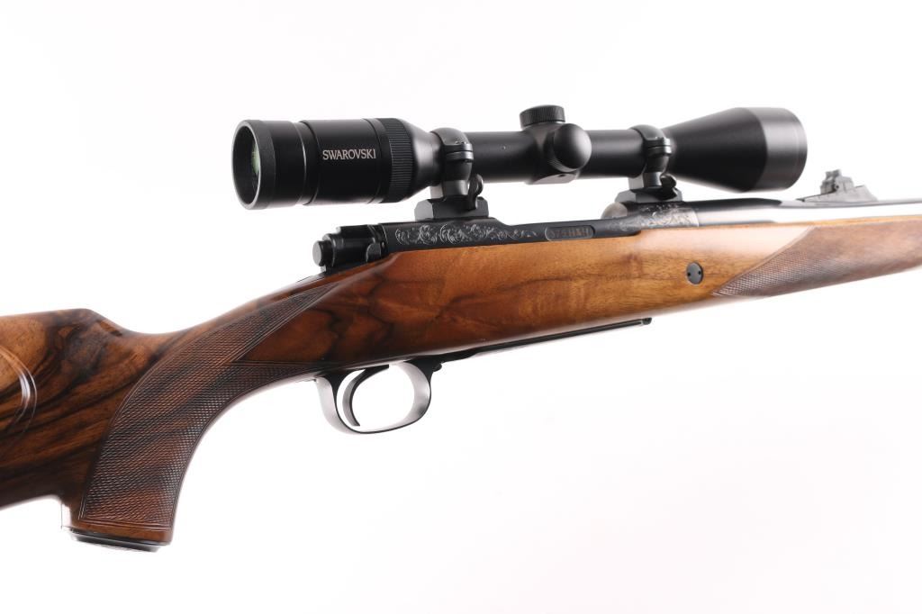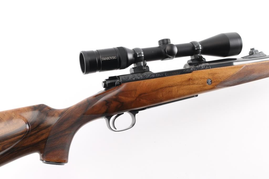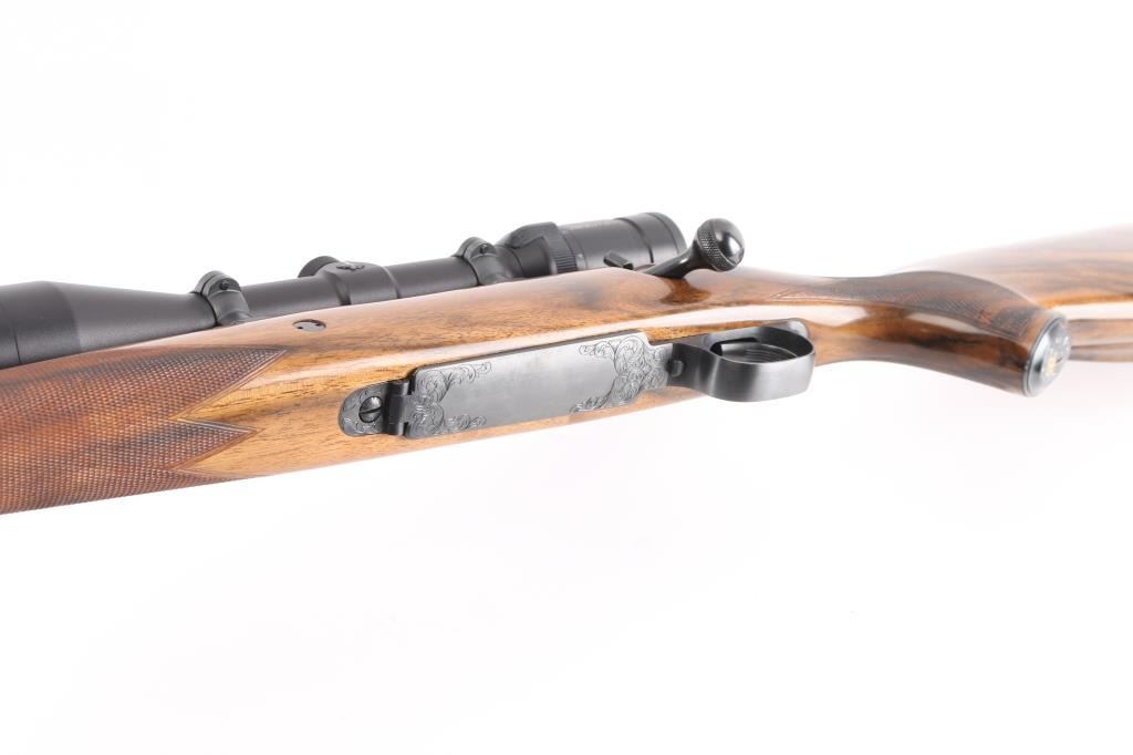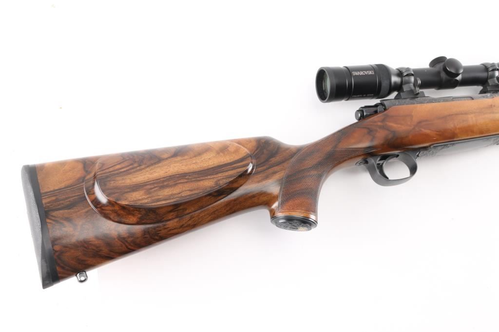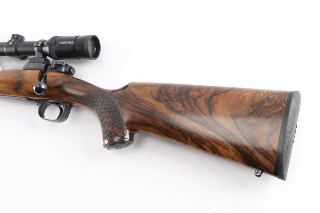 Stunning engraved & gold inlaid left handed bolt action sporting rifle chambered in .375 Holland & Holland Magnum. Manufactured in Paso Robles, California circa 1998-2013 utilizing a Winchester Model 70 Classic receiver. Features a blued finish, light coverage hand engraved floral scroll on the receiver & floorplate, 26.75” tapered round barrel, ramped & hooded bead top blade front sight, fully-adjustable sliding rear sight, Swarovski Habicht 3-10x 42mm scope mounted with Leupold QR rings & two-piece base, engine turned bolt, curved serrated trigger, three-position safety on the rear of the bolt, 3 round internal box magazine with hinged floorplate and highly figured Walnut semi-pistol grip shoulder stock with hand-cut multi-point checkering, ebony forend tip, shadowline cheekpiece, engraved steel grip cap, Old English recoil pad & 13 ?” LOP. Markings: Barrel - “John Rigby & Co.” gold inlaid Olde English and “Paso Robles, CA.” engraved. Receiver - “375 H&H” gold inlaid Olde English and “G279054” stamped. Grip Cap - [Rigby insignia] gold inlaid. Rifle retains approximately 99%+ of its original blued finish showing little to no visible wear. The action is mechanically sound, the bore is pristine and the fancy walnut stock is excellent with minor handling marks.