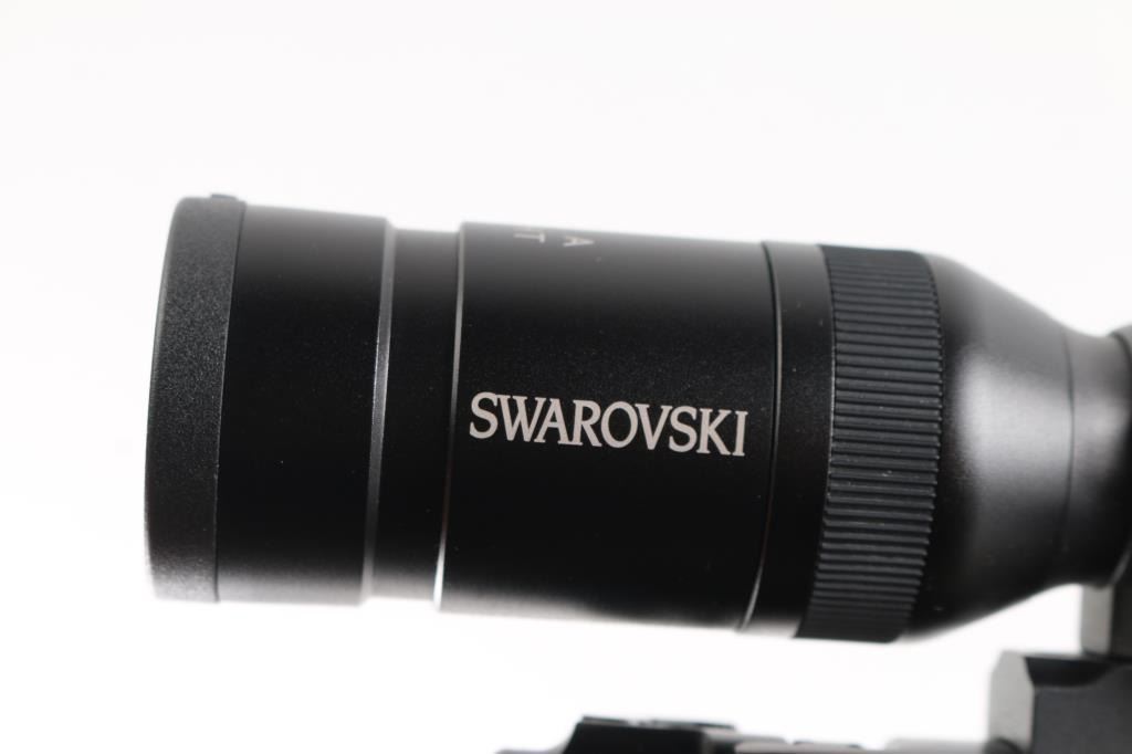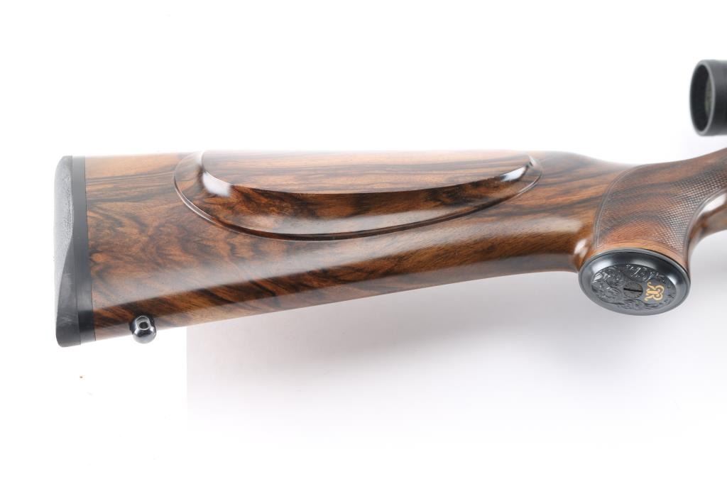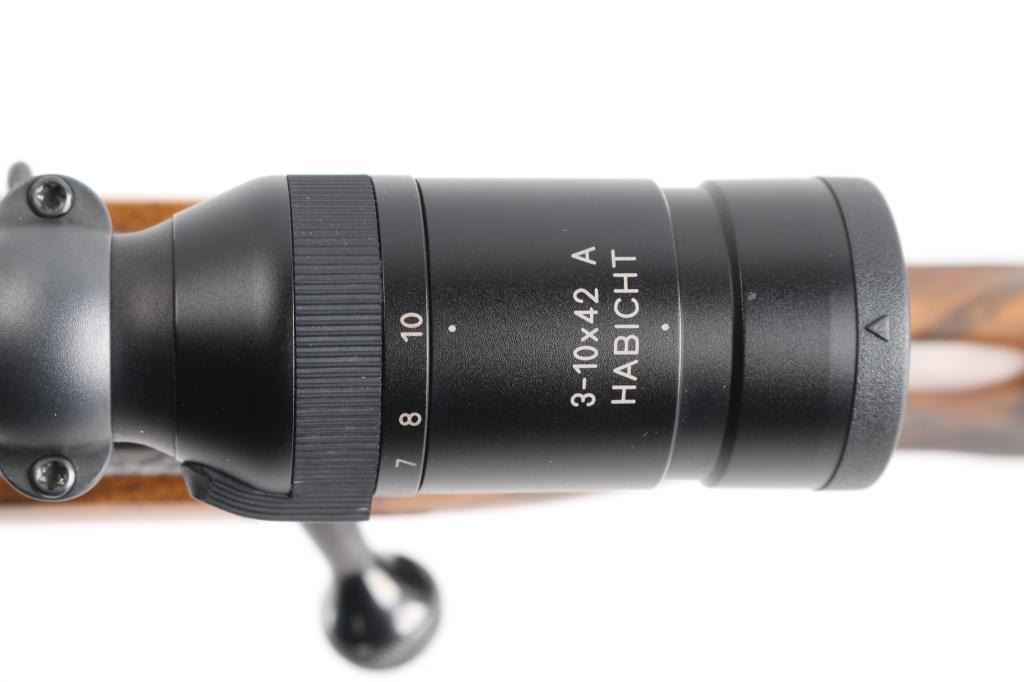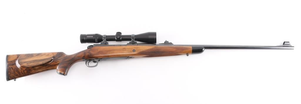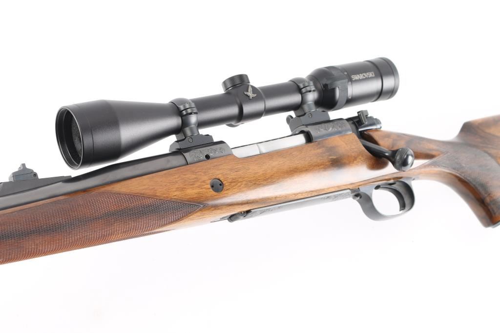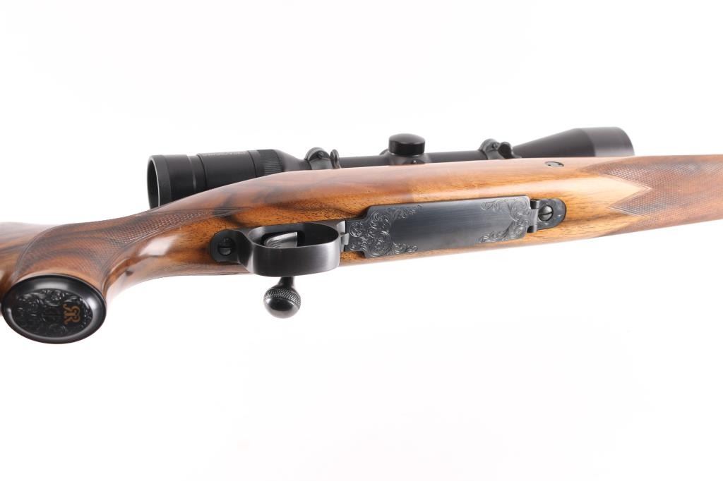 Stunning engraved & gold inlaid left handed bolt action sporting rifle chambered in .375 Holland & Holland Magnum. Manufactured in Paso Robles, California circa 1998-2013 utilizing a Winchester Model 70 Classic receiver. Features a blued finish, light coverage hand engraved floral scroll on the receiver & floorplate, 26.75” tapered round barrel, ramped & hooded bead top blade front sight, fully-adjustable sliding rear sight, Swarovski Habicht 3-10x 42mm scope mounted with Leupold QR rings & two-piece base, engine turned bolt, curved serrated trigger, three-position safety on the rear of the bolt, 3 round internal box magazine with hinged floorplate and highly figured Walnut semi-pistol grip shoulder stock with hand-cut multi-point checkering, ebony forend tip, shadowline cheekpiece, engraved steel grip cap, Old English recoil pad & 13 ?” LOP. Markings: Barrel - “John Rigby & Co.” gold inlaid Olde English and “Paso Robles, CA.” engraved. Receiver - “375 H&H” gold inlaid Olde English and “G279054” stamped. Grip Cap - [Rigby insignia] gold inlaid. Rifle retains approximately 99%+ of its original blued finish showing little to no visible wear. The action is mechanically sound, the bore is pristine and the fancy walnut stock is excellent with minor handling marks.