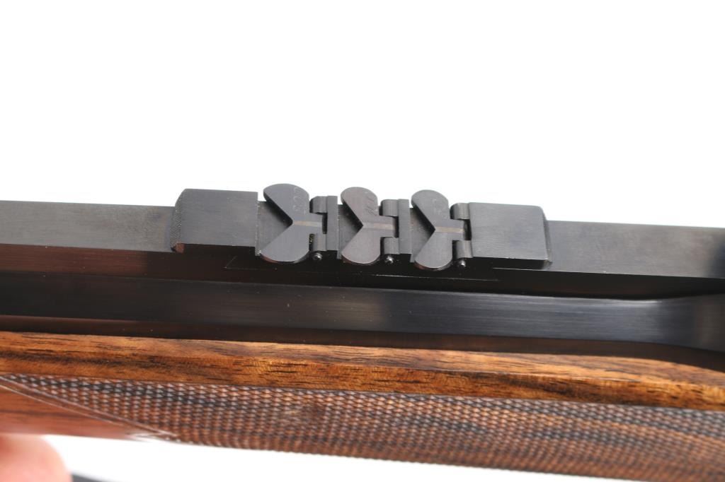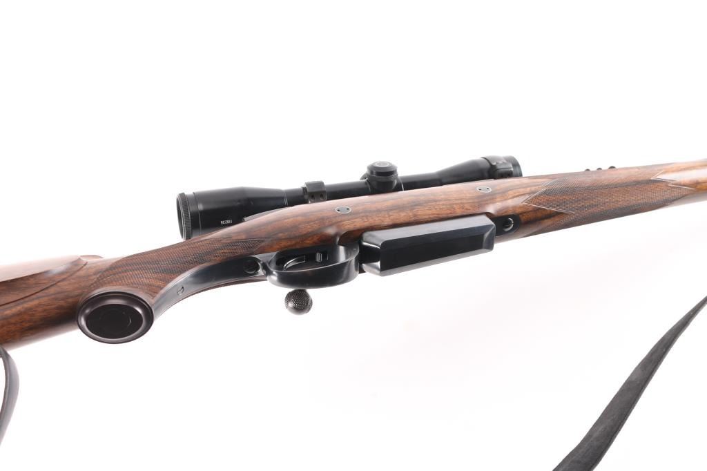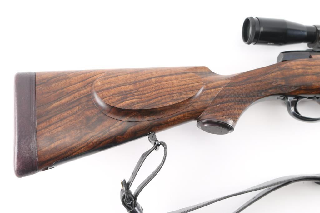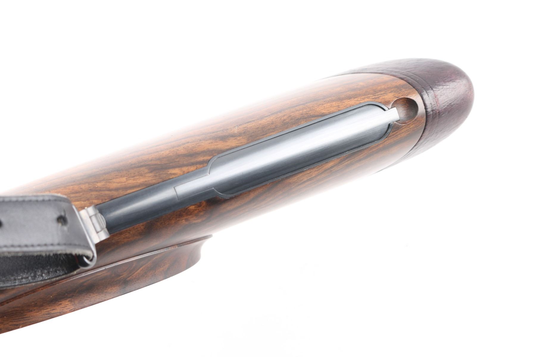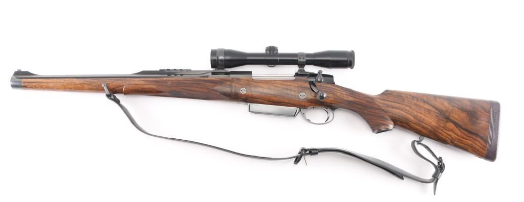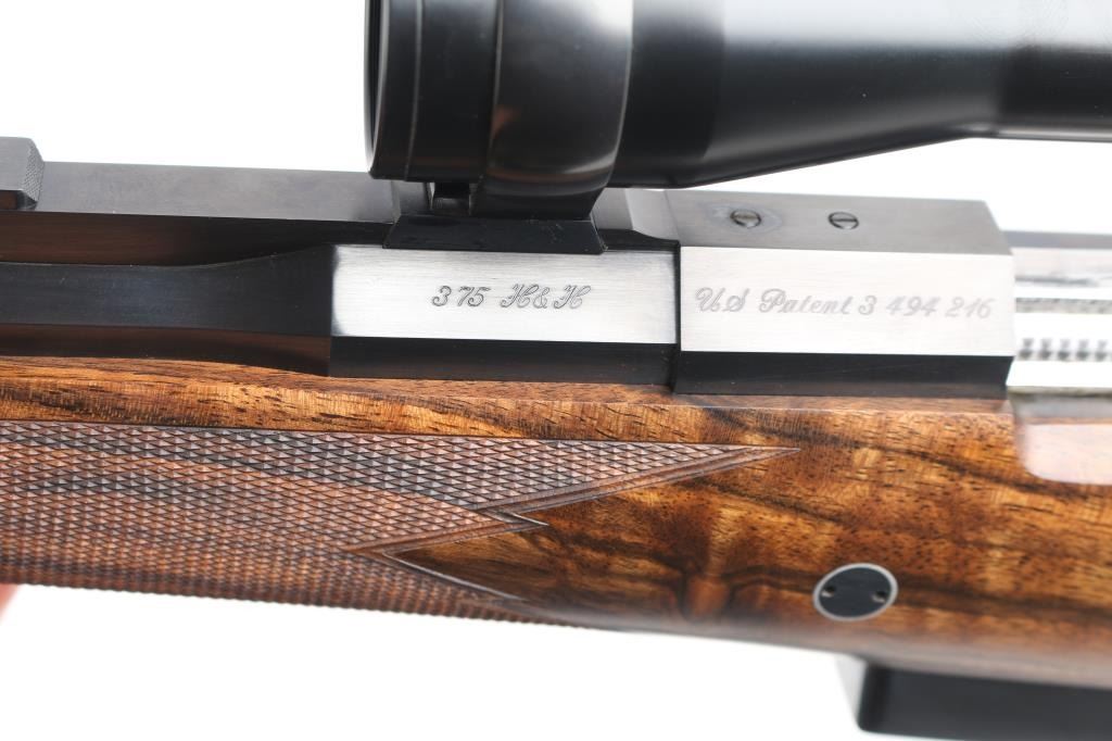 SN: VRF1-92843 Superb quality left handed bolt action sporting rifle chambered in .375 Holland and Holland Magnum. Manufactured in Enid, Oklahoma. Features a blued finish, 18.25” tapered octagon barrel with integral front sight ramp & quarter rib, dovetailed blade front sight with brass bead, gloaming sight, triple drop-leaf express sight, Schmidt & Bender 4x 36mm scope mounted with bell ring/claw mount, machine turned bolt body with swept-back handle & four panel checkered knob, machine turned follower, extended box magazine with hinged floorplate, rounded curved trigger, extended upper tang with knurled sliding safety, two-position pivoting safety on the left side of the bolt shroud, smooth black leather sling, and stunning full-length near exhibition quality figured walnut stock with metal nose cap, schnabel flare, fine hand-cut multi-point checkering with scalloped border, shadowline cheekpiece, semi-pistol grip with steel grip cap containing an additional front sight/tool, inlet four round steel cartridge box near the toe, leather covered recoil pad & 13 9/16” LOP. Rifle retains approximately 99% of its original high quality finish showing minimal contact wear and a single bright scratch on the top of the extended upper tang. The action is mechanically sound, the bore is excellent, the optics are clear/sharp with #4 reticle and the high grade walnut stock is fine with some blemishes.