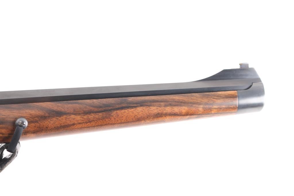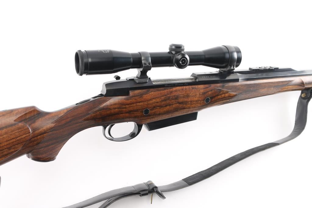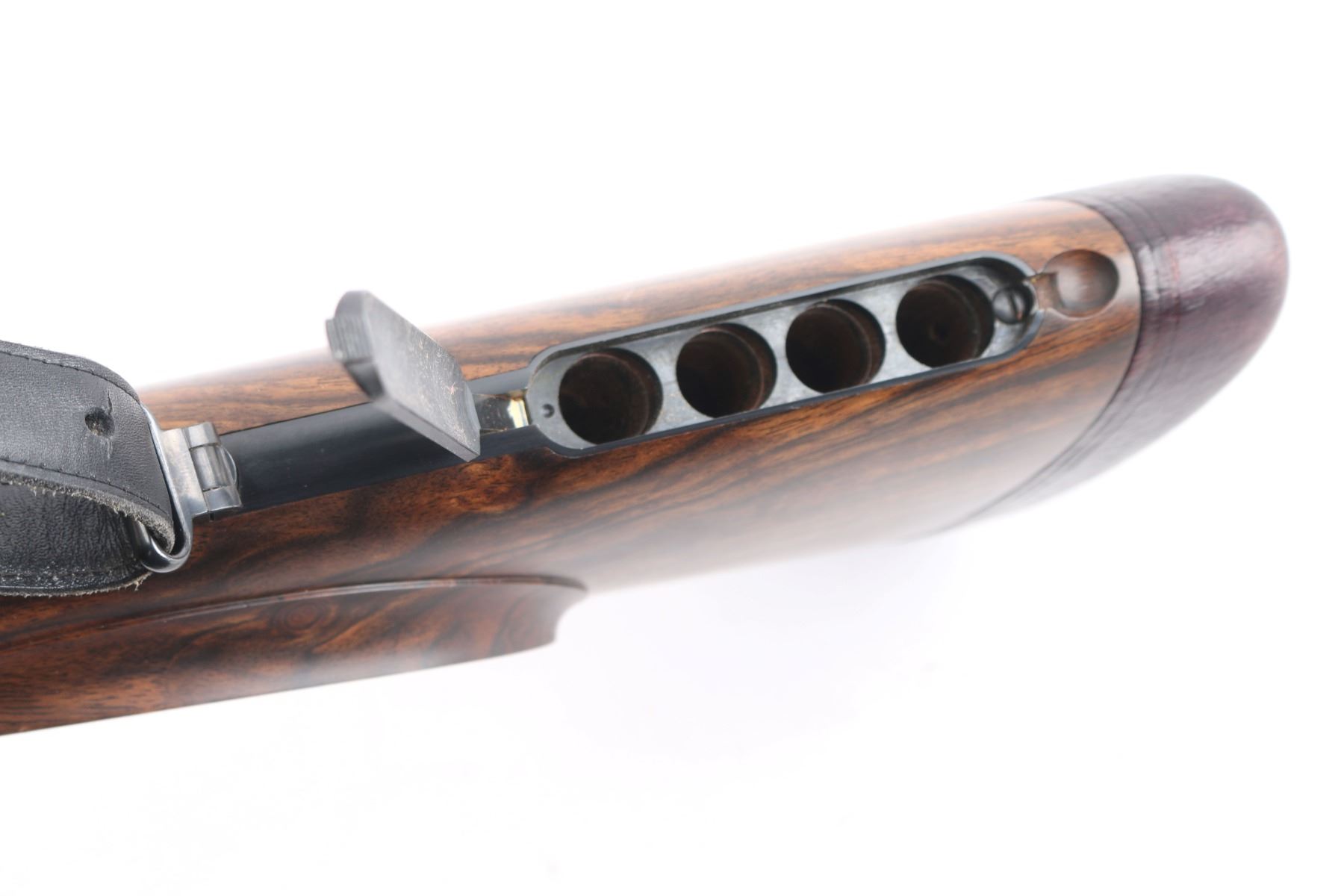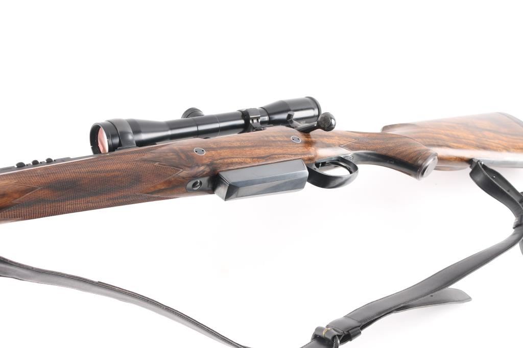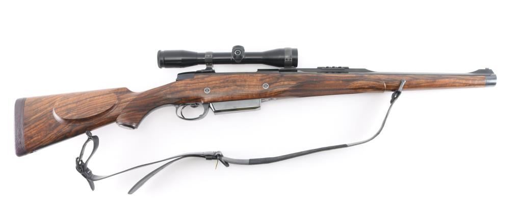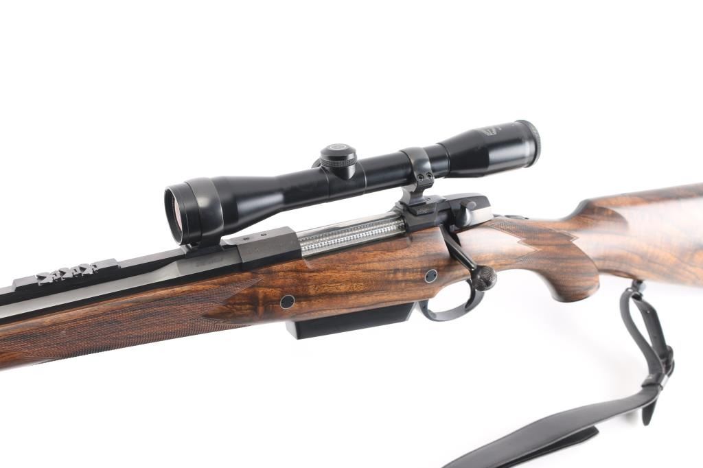 SN: VRF1-92843 Superb quality left handed bolt action sporting rifle chambered in .375 Holland and Holland Magnum. Manufactured in Enid, Oklahoma. Features a blued finish, 18.25” tapered octagon barrel with integral front sight ramp & quarter rib, dovetailed blade front sight with brass bead, gloaming sight, triple drop-leaf express sight, Schmidt & Bender 4x 36mm scope mounted with bell ring/claw mount, machine turned bolt body with swept-back handle & four panel checkered knob, machine turned follower, extended box magazine with hinged floorplate, rounded curved trigger, extended upper tang with knurled sliding safety, two-position pivoting safety on the left side of the bolt shroud, smooth black leather sling, and stunning full-length near exhibition quality figured walnut stock with metal nose cap, schnabel flare, fine hand-cut multi-point checkering with scalloped border, shadowline cheekpiece, semi-pistol grip with steel grip cap containing an additional front sight/tool, inlet four round steel cartridge box near the toe, leather covered recoil pad & 13 9/16” LOP. Rifle retains approximately 99% of its original high quality finish showing minimal contact wear and a single bright scratch on the top of the extended upper tang. The action is mechanically sound, the bore is excellent, the optics are clear/sharp with #4 reticle and the high grade walnut stock is fine with some blemishes.