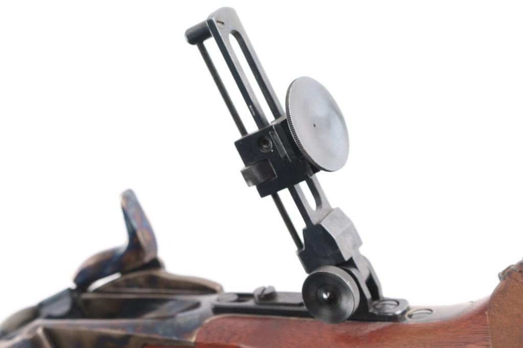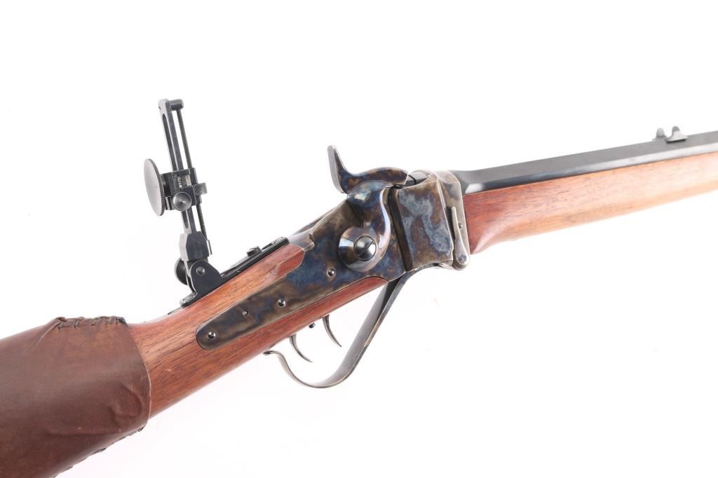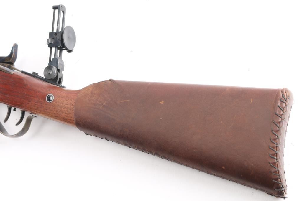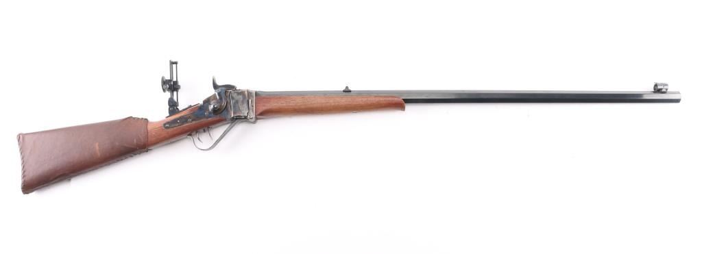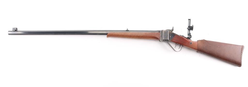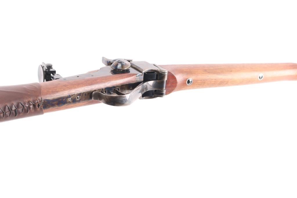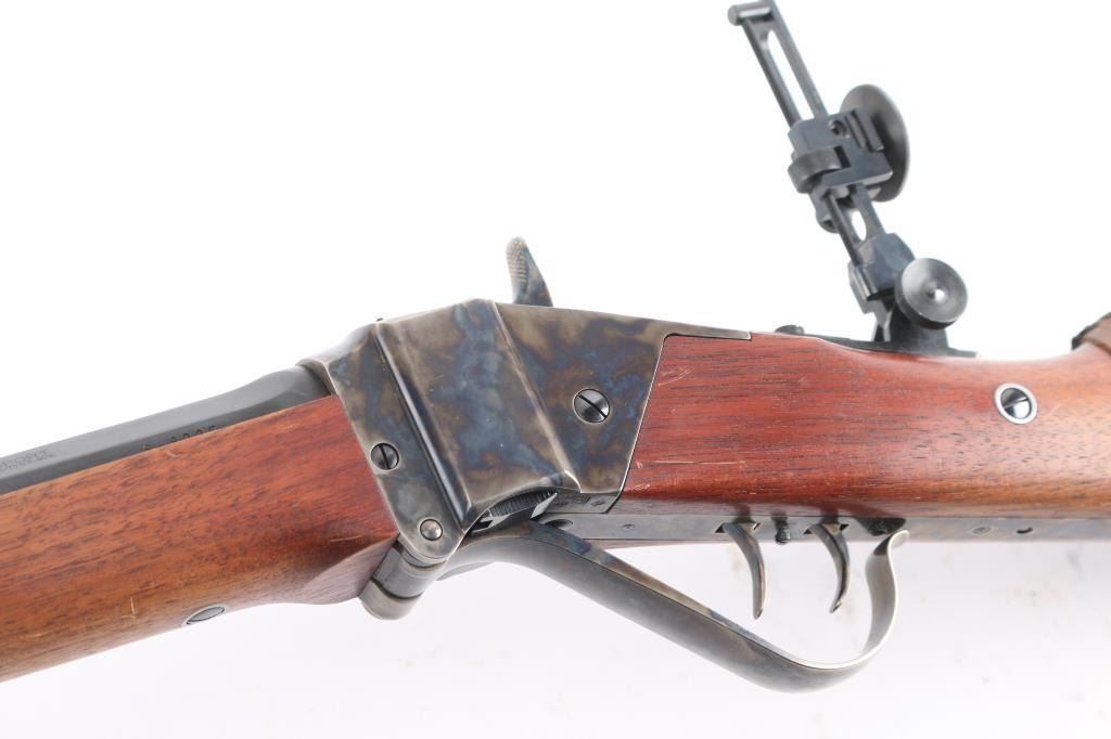 Sn: Sh8235. Single-shot, breech block action. Italian made (Armi Sport) copy of the classic Sharps long rifle. 32" octagonal barrel, dovetailed globe/post front sight, missing rear barrel sight, tang mounted adjustable eye cup peep sight. Blue finish on the barrel. Case-hardened receiver, hammer, triggerguard, and butt plate. Smooth straight grip walnut stock, and forearm. Checkered hammer spur. Smooth steel butt plate. Triggerguard action lever. firing pin Double set triggers. Import marks "Taylor's & Co." on top barrel flat, and Italian proofed. Date code "CB", 2020. Bore appears excellent/bright. Metal finish is excellent, with a couple of very minor scratches. Wood is excellent with a few very minor scratches/rubs. Action is crisp/tight. Brown leather sleeve on buttstock. Would be excellent if not for sight missing. Comes in factory box with matching label.