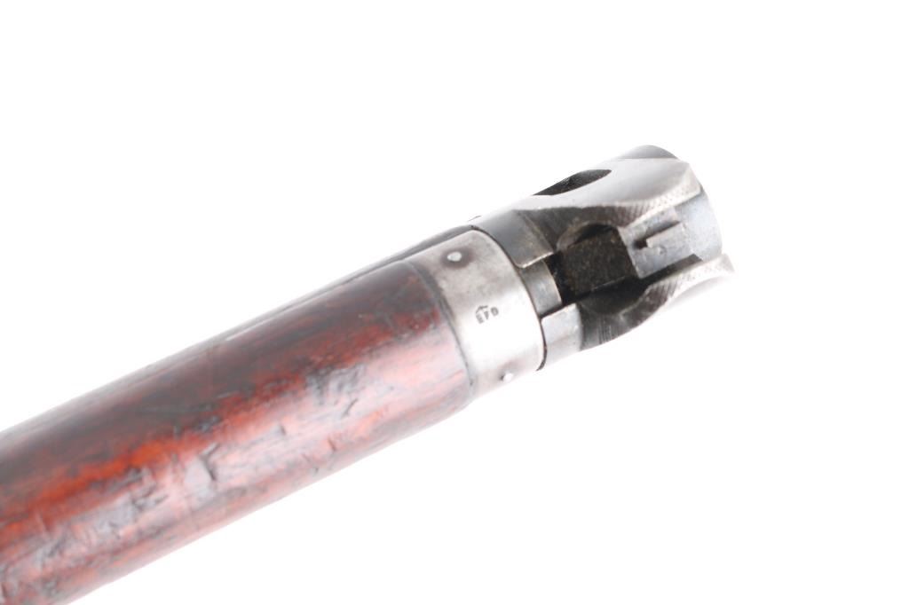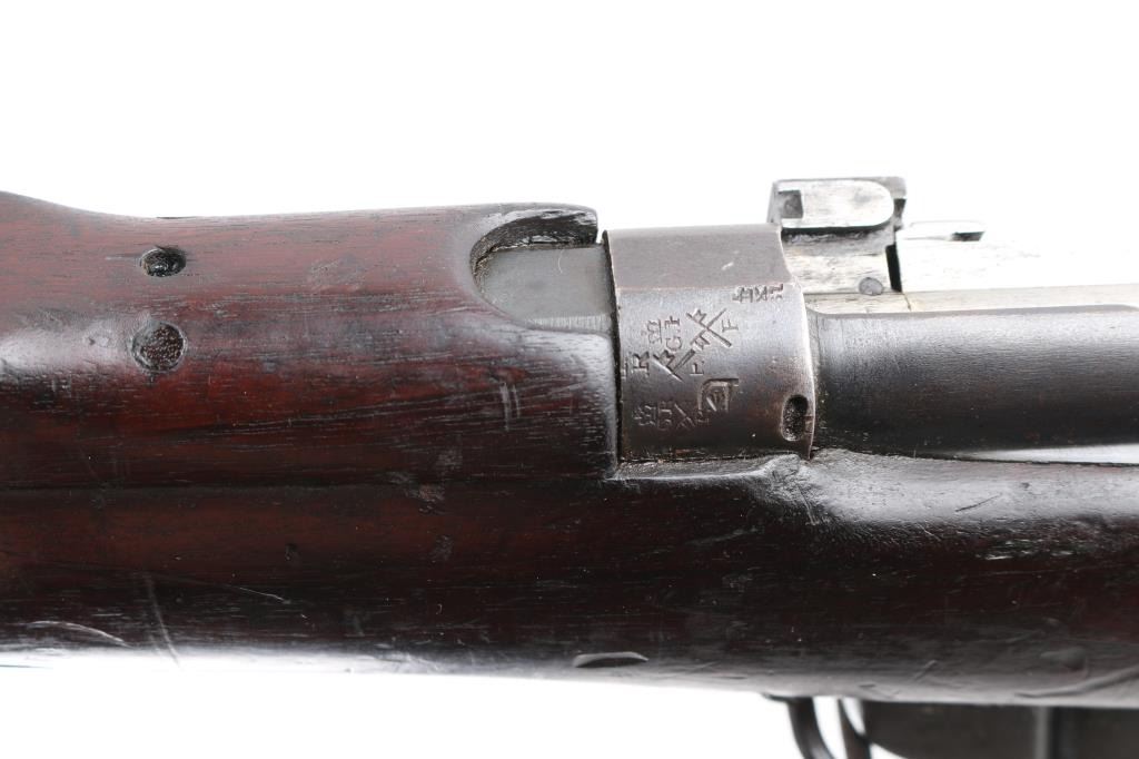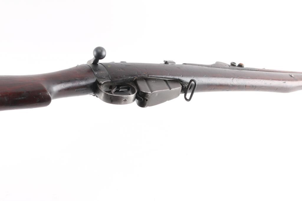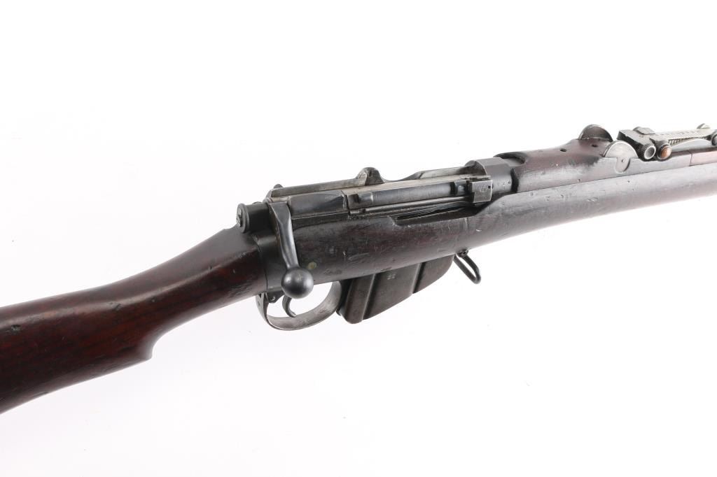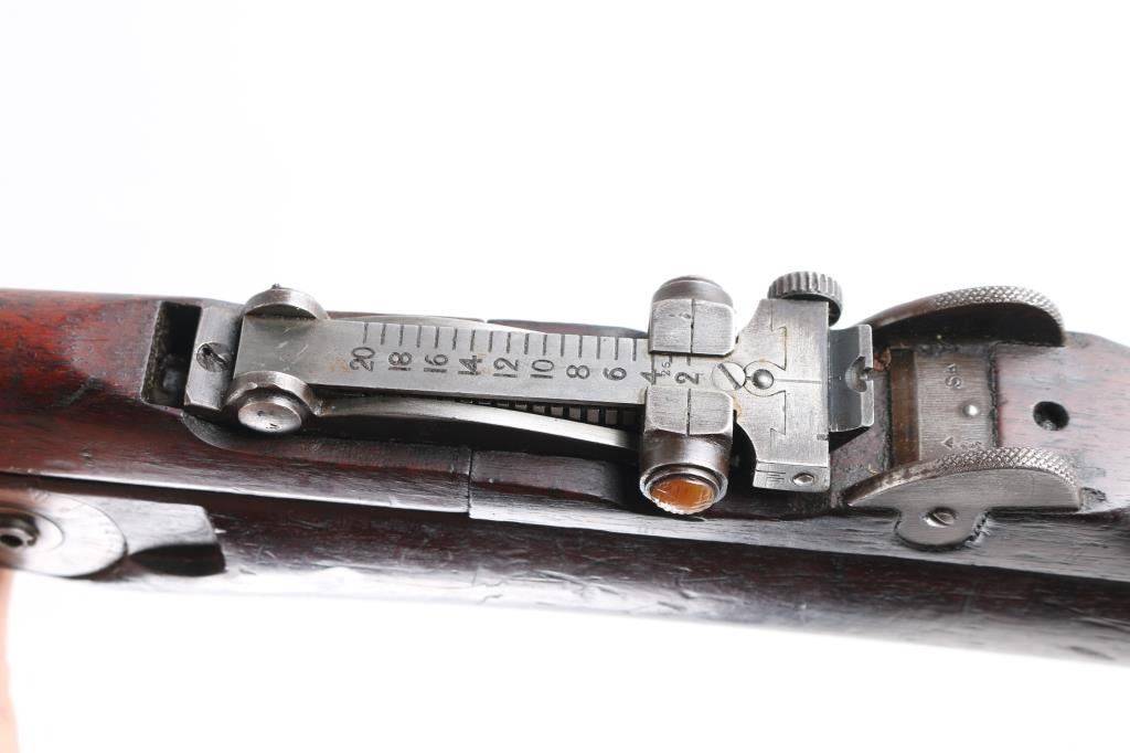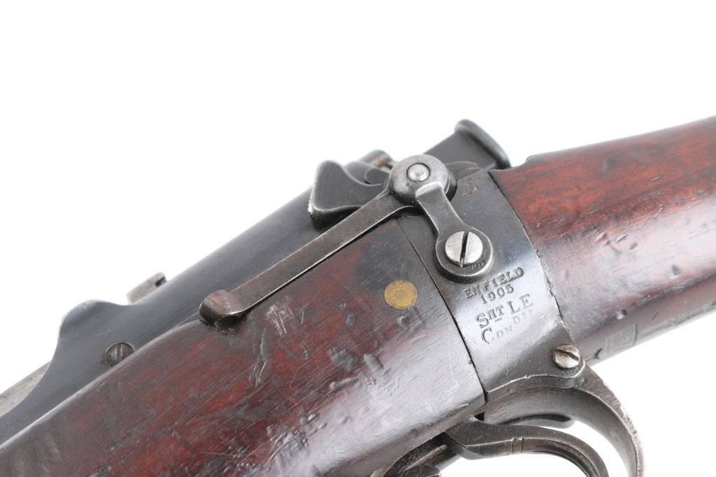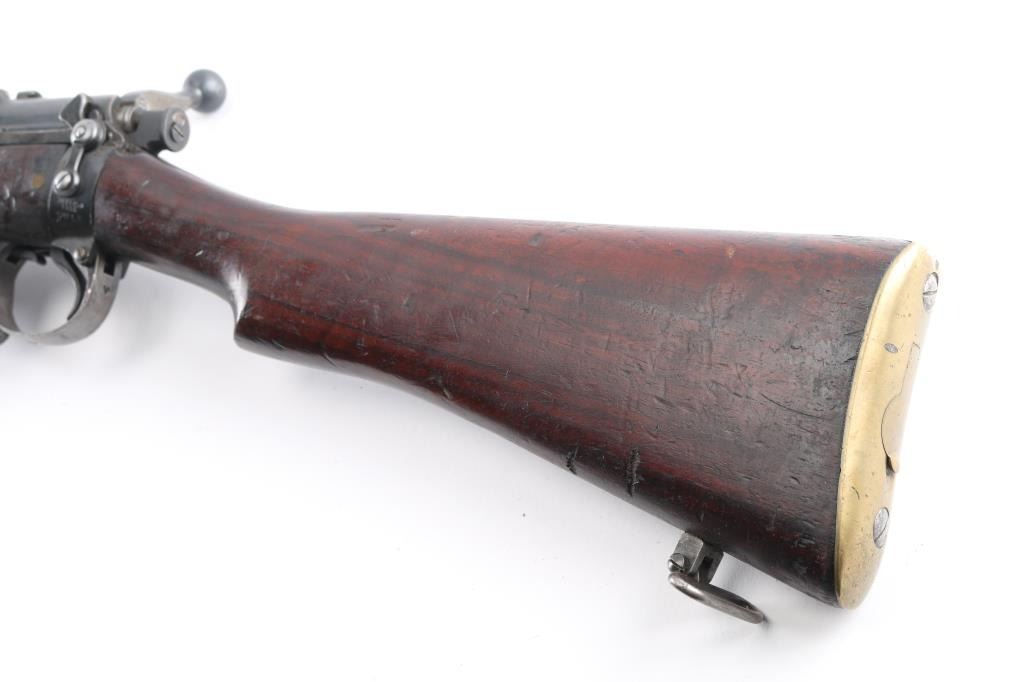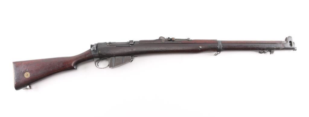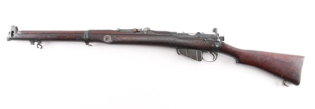 British military single shot bolt action training rifle chambered in .22 caliber rimfire. Marked on right stock collar. A.G. PARKER & CO / BIRMINGHAM” & "22 PATT '14 No 1". The left side of the stock collar is marked “ENFIELD / 1905 / SHT LE / COND II”. These are markings from the previous Arsenal conversion to a SMLE Condition 2 configuration, 25.2" barrel, raised patridge front sight, leaf style rear sight graduated to 2,000 yards with a 25 yard mark, metal nose cap with protective front sight ears, bayonet lug & piling swivel, serrated trigger, "22" marked hollowed magazine that acts as a brass collector, manual safety on the left side of the receiver, smooth full-length wood handguard & forend and straight grip shoulder stock with brass trapdoor buttplate, brass disc inletted in left butt stock, volley sight base in left fore stock. Rifle retains approximately 90% of it's dark blue finish showing handling/edge wear. Action is smooth, the bore is excellent and the wood stocks are very good+. Rare.