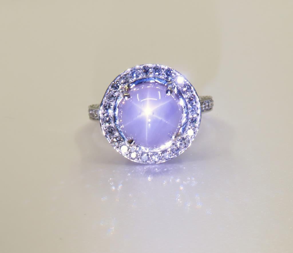 and Diamond Ring featuring a G.I.A. Certified Natural NO HEAT, NO TREATMENT Sri-Lankan cabochon Star Sapphire weighing 7.71 carats beautifully framed and encrusted with 107 round Diamonds weighing approx. 0.98 carats with G-H colors and VS clarity. Masterfully designed and crafted in a custom 14 karat white gold setting, Size 7. Full Retail Appraisal - $10,500.00