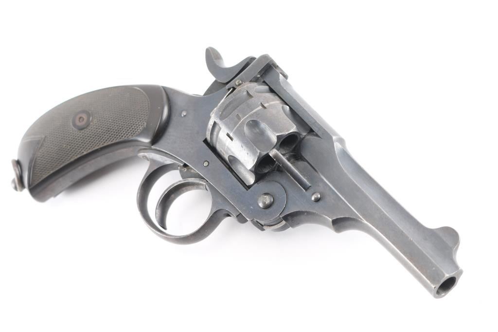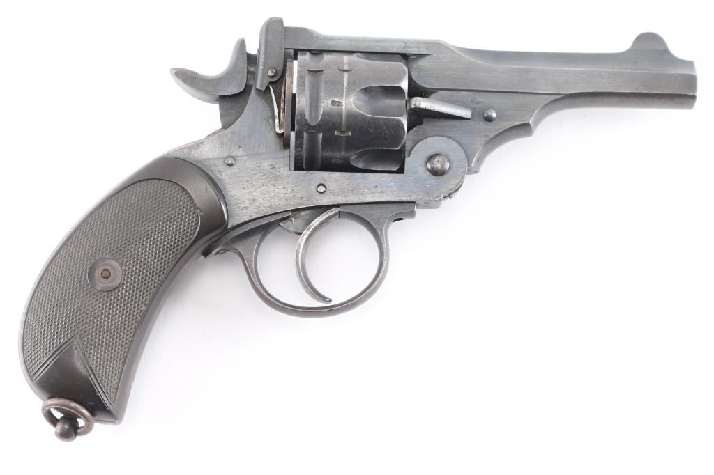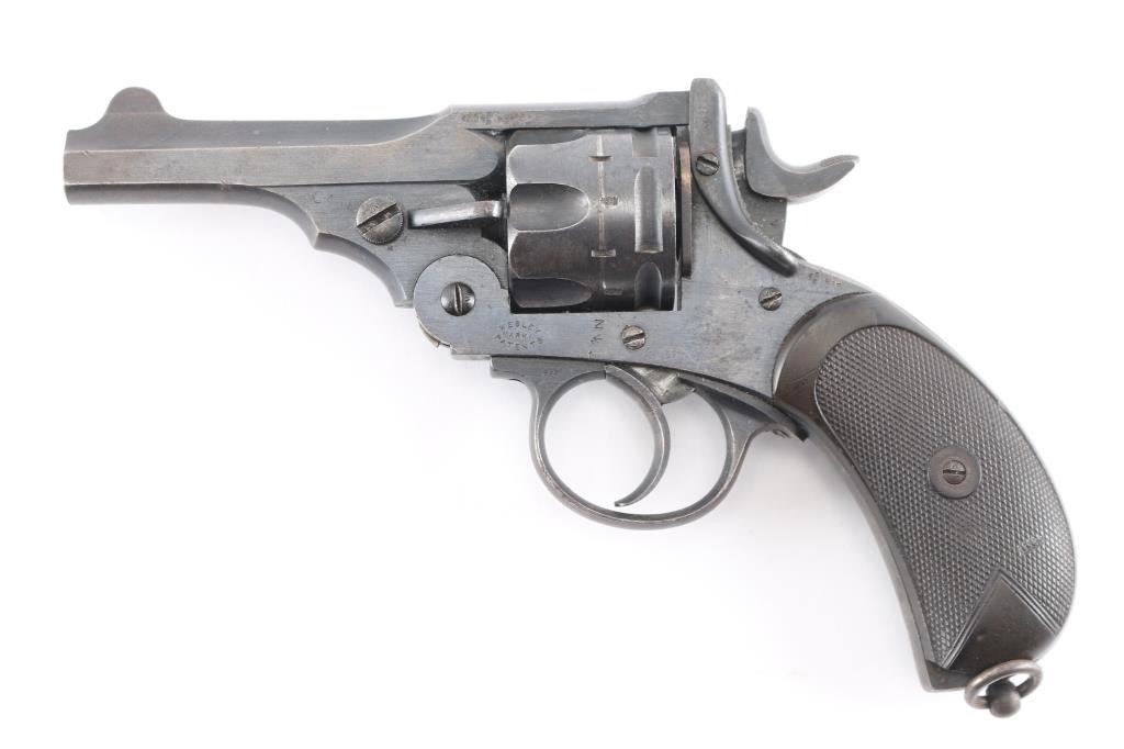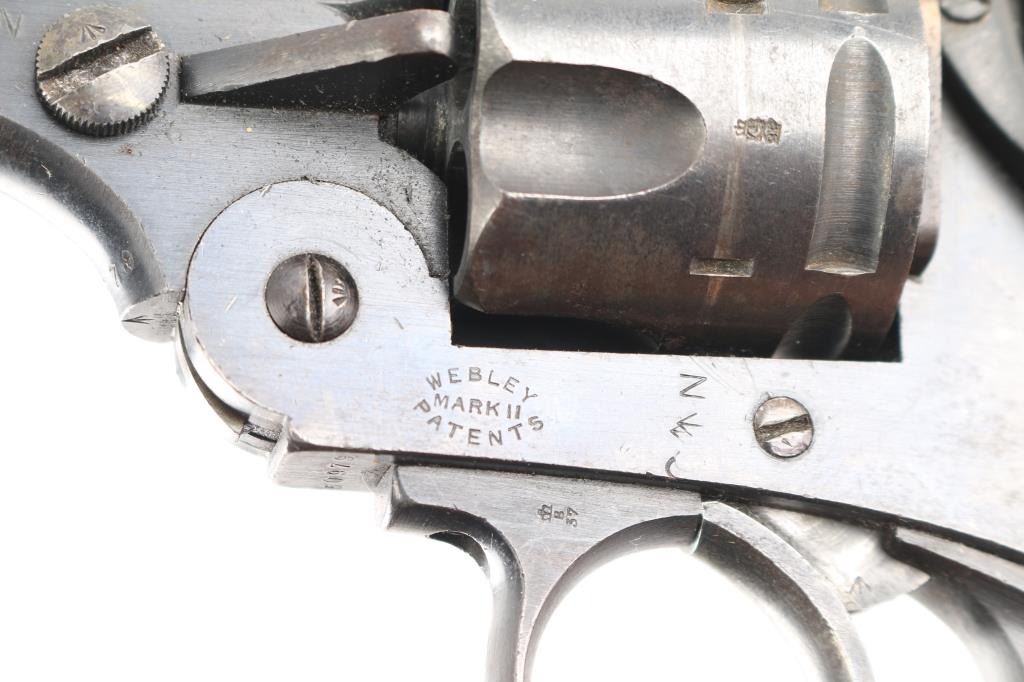 British military top-break double action revolver chambered for .455 Webley. Features a blued finish, 4" barrel, forged round blade front sight, notched rear sight on the barrel catch, fluted six-shot cylinder, automatic extractor, smooth trigger, knurled hammer spur, lanyard ring on the bird's head shaped butt, two-piece checkered brown hard rubber grips. Serial numbers match on the barrel, frame & cylinder. British proof marks are observed on the barrel and over every charge hole on the cylinder. Other markings include broad arrow marks with "WD", crown over "B 9", "WEBLEY/MARK II/PATENTS" on the frame, "N" over "3" on backstrap. "P.M." scratched into bottom of front strap. Cylinder appears not shaved, with proofs and other marks visible on rear face. Bore is good condition, overall bright with strong rifling, dark streaks in grooves might clean out. Retains 75% finish, color looks right, no obvious blemishes in the metal to indicate re-finish, some thinning and fading where handled and at muzzle, some dings to sharp edges. Two tone look on sides of frame from polishing direction to work around the recoil shield. Grips are good, small chip missing from left panel at point, with handling marks throughout. Action is smooth, has good lock-up. Cylinder turns freely with trigger at rest. Extractor operation is strong.
