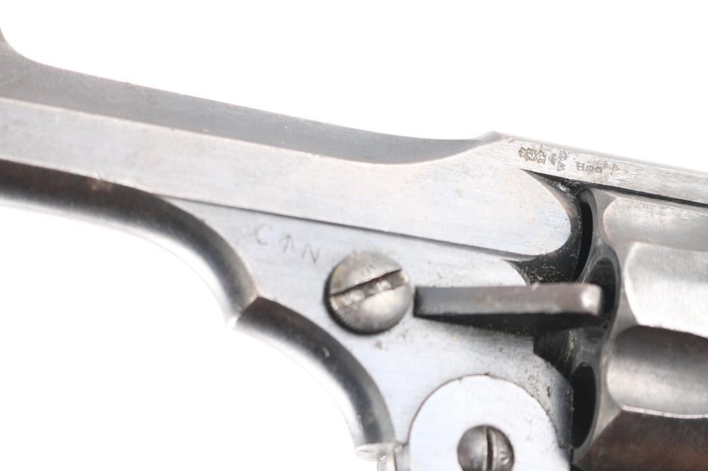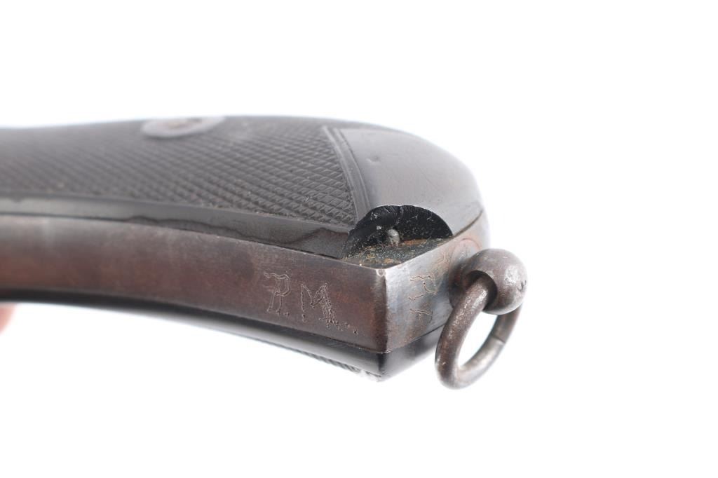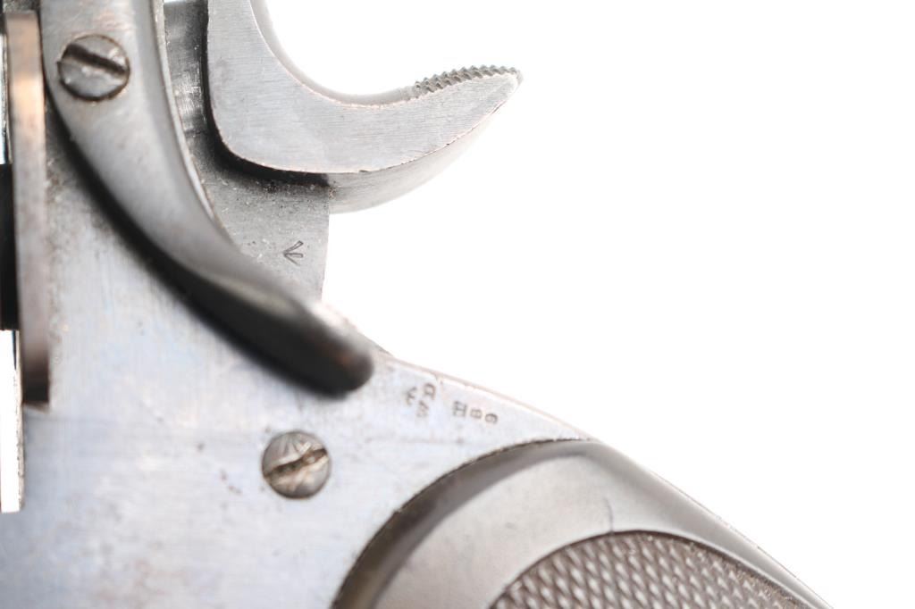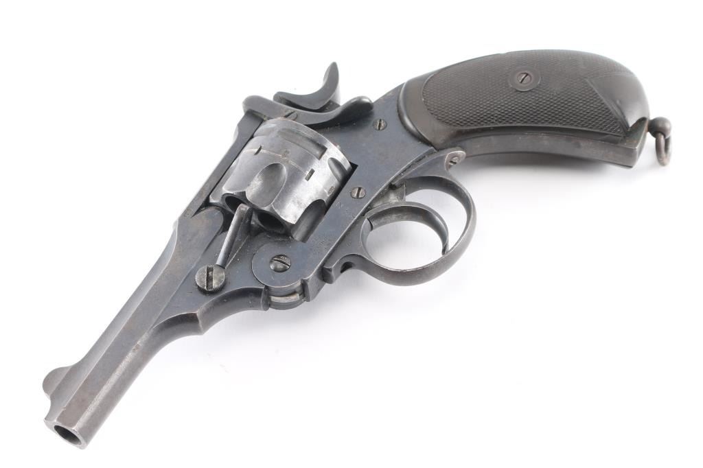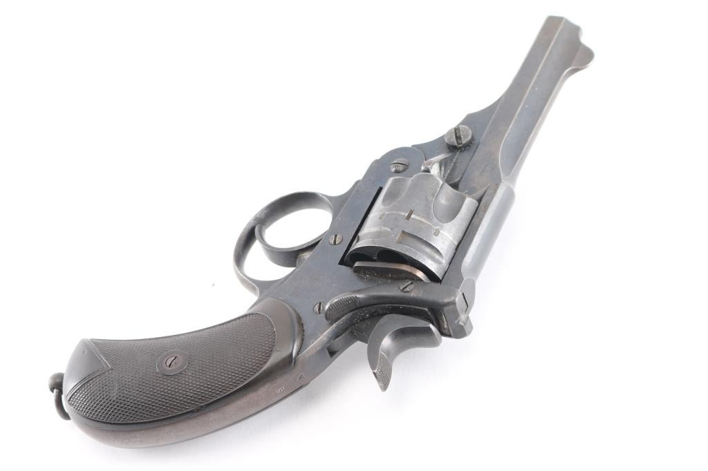 British military top-break double action revolver chambered for .455 Webley. Features a blued finish, 4" barrel, forged round blade front sight, notched rear sight on the barrel catch, fluted six-shot cylinder, automatic extractor, smooth trigger, knurled hammer spur, lanyard ring on the bird's head shaped butt, two-piece checkered brown hard rubber grips. Serial numbers match on the barrel, frame & cylinder. British proof marks are observed on the barrel and over every charge hole on the cylinder. Other markings include broad arrow marks with "WD", crown over "B 9", "WEBLEY/MARK II/PATENTS" on the frame, "N" over "3" on backstrap. "P.M." scratched into bottom of front strap. Cylinder appears not shaved, with proofs and other marks visible on rear face. Bore is good condition, overall bright with strong rifling, dark streaks in grooves might clean out. Retains 75% finish, color looks right, no obvious blemishes in the metal to indicate re-finish, some thinning and fading where handled and at muzzle, some dings to sharp edges. Two tone look on sides of frame from polishing direction to work around the recoil shield. Grips are good, small chip missing from left panel at point, with handling marks throughout. Action is smooth, has good lock-up. Cylinder turns freely with trigger at rest. Extractor operation is strong.