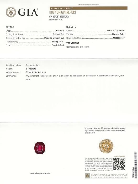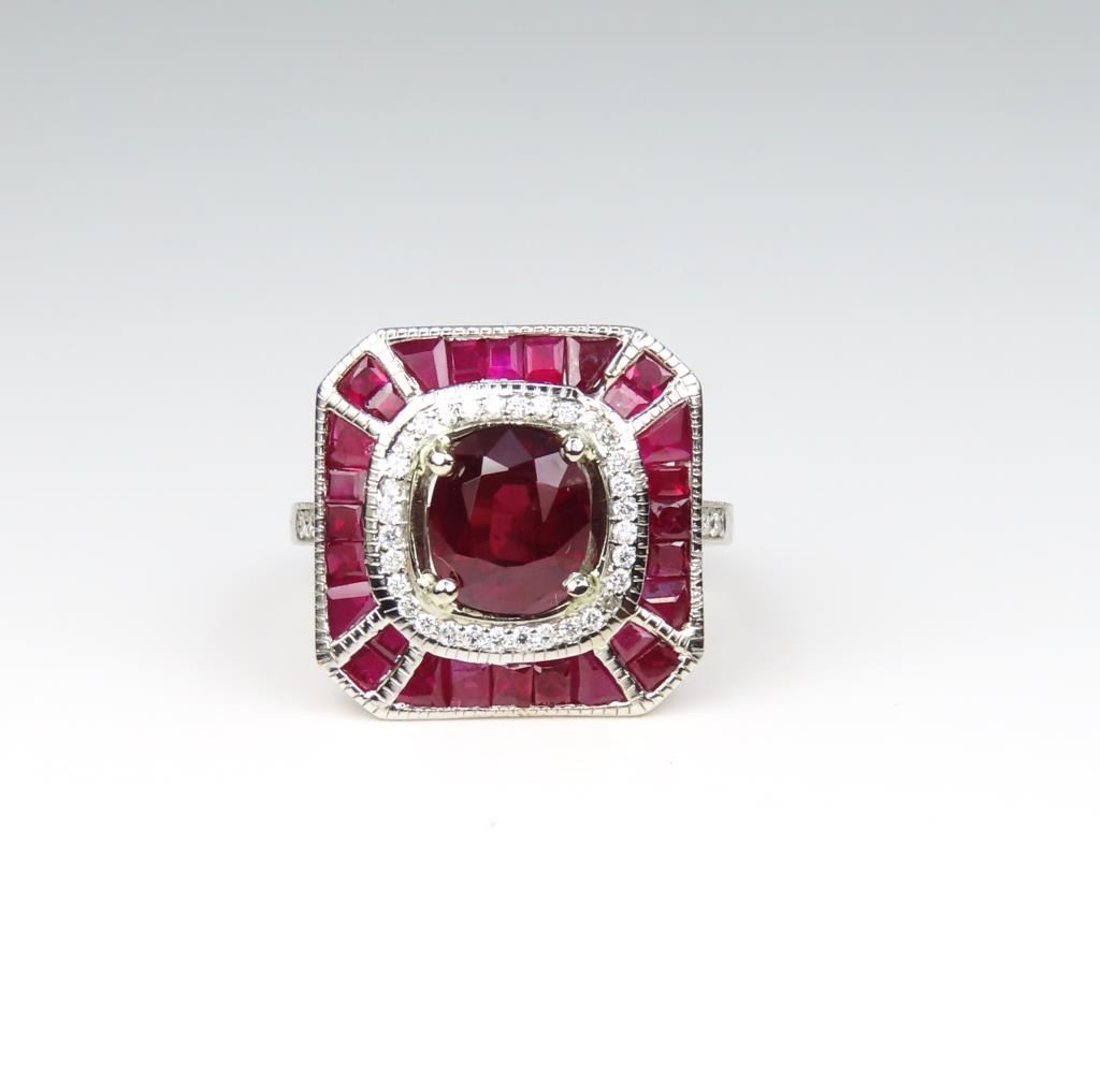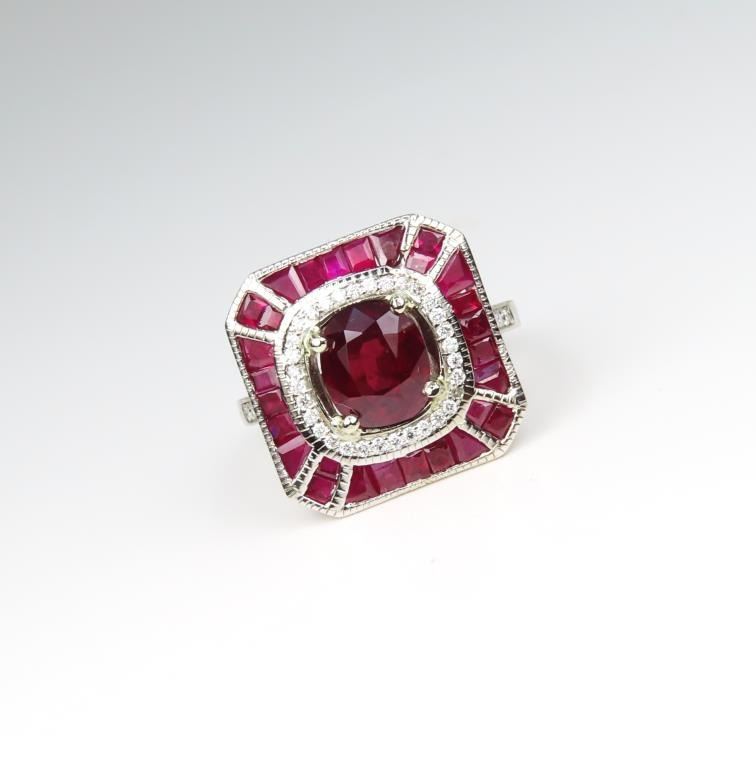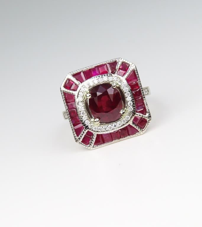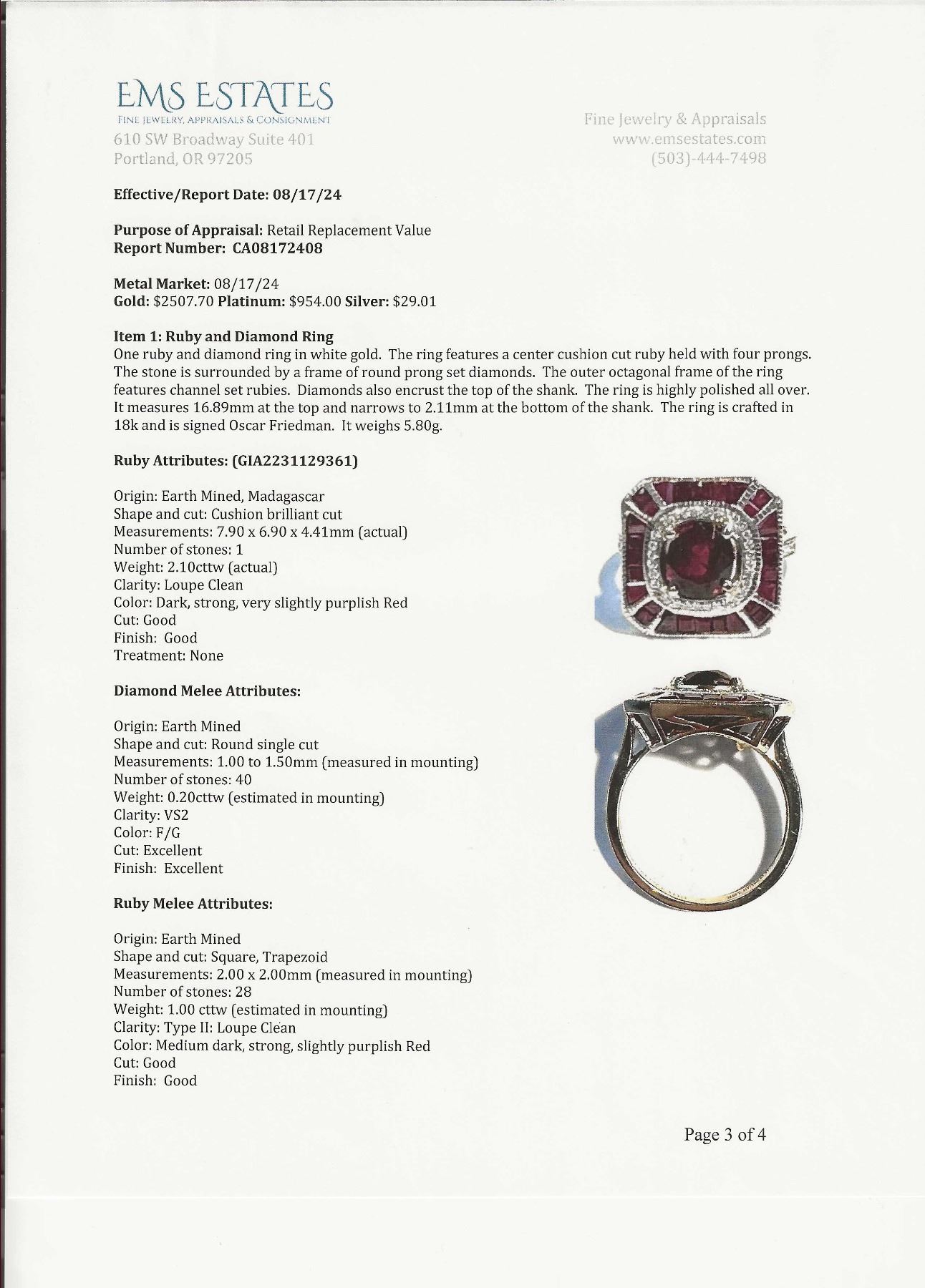 featuring a G.I.A. Certified NO HEAT No Treatment cushion cut 2.10 carat Ruby beautifully framed with 28 channel set Princess and custom cut Rubies weighing (Stamped) 1.75 carats and 40 round cut Diamonds meticulously set in a finely detailed ‘OSCAR FRIEDMAN’ setting with stamped Hallmark, crafted in 18 karat white gold, Size 5 ¾. Retail Estimate at $23,500.
