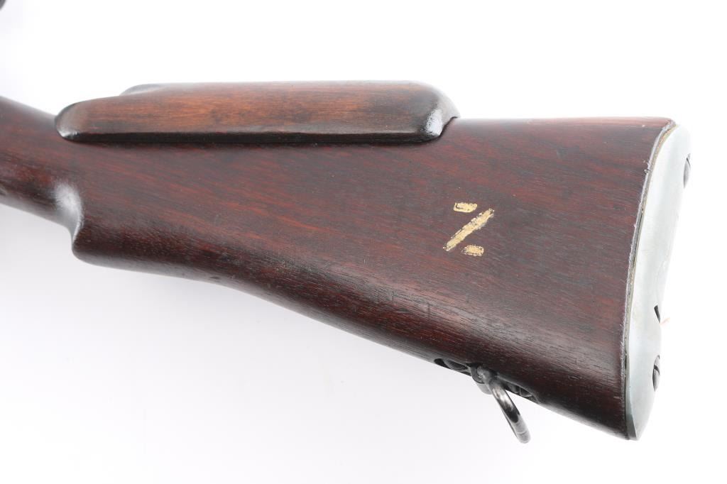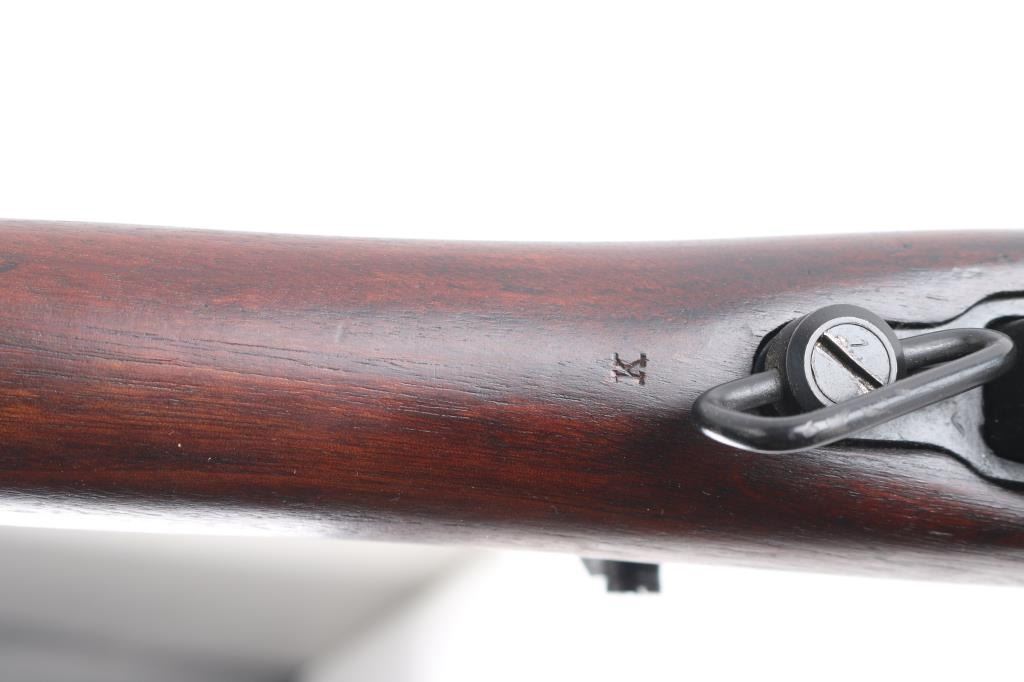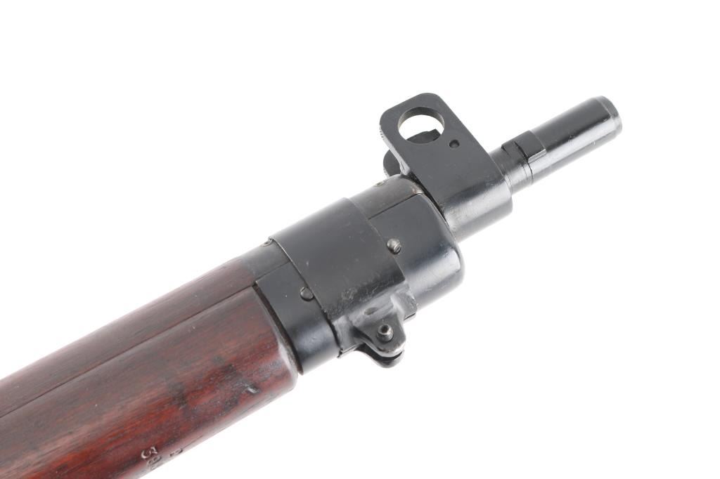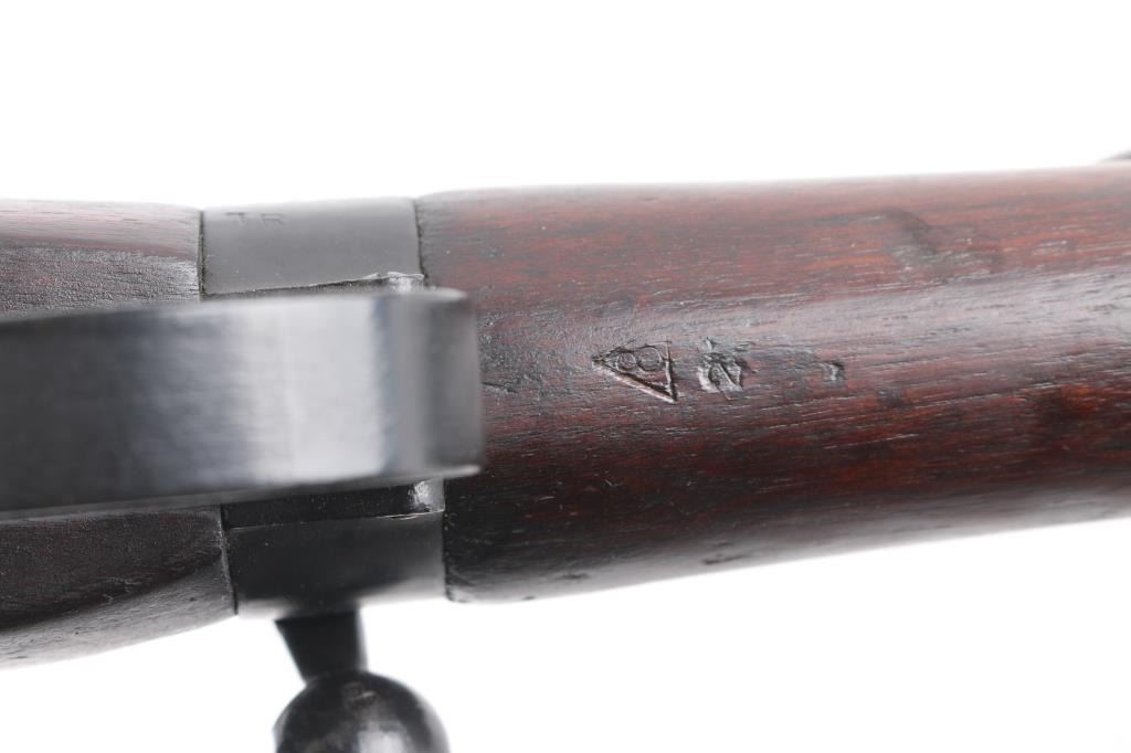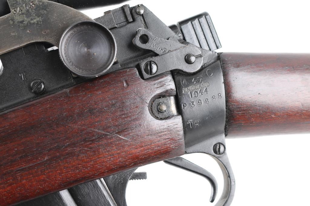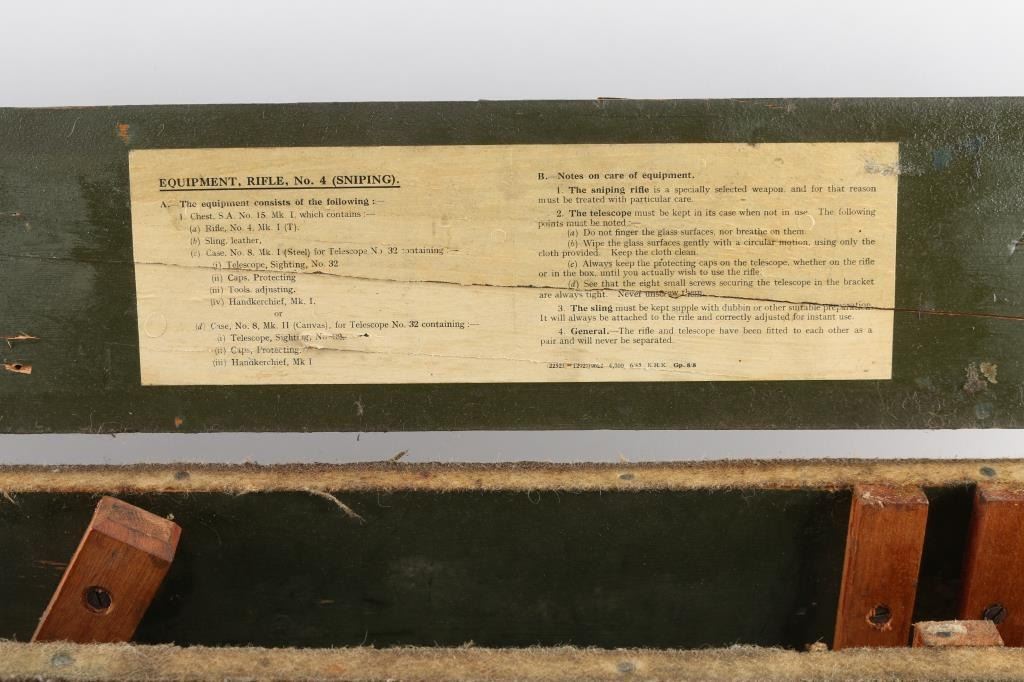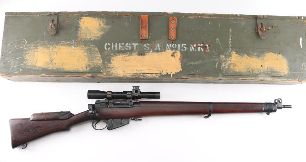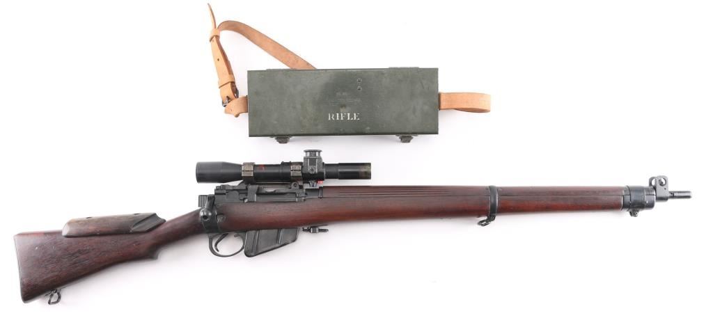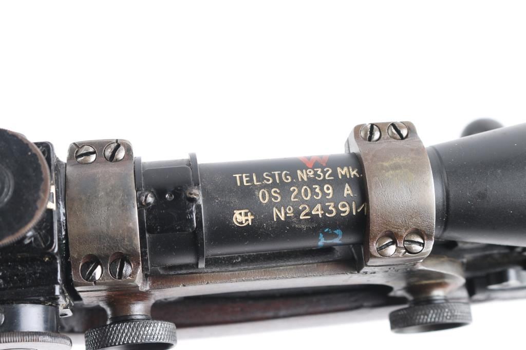 SN: P39888. WW2 British 1944 dated bolt action sniper rifle with No. 32 Mk III scope and mount. Used from WW2 into the early 1960's until they were replaced by the L42 series sniper rifles. The left butt-socket is marked 'm47 C, England 1944 P39888 TR, the left receiver side wall is marked 'T'. The sniper scope is marked 'Tel. Stg. No.32 MkIII OS. 2039 A. C&H No 24391/broad arrow. There is a "B' stenciled in blue paint beneath this, and red painted "W" above, a lower adjustment screw is also painted red.. The scope has the standard British post and cross hair reticle pattern, and the brown leather lens cover. The mount is marked 'N34936". The rings are stamped 'N337', 'N338'. The underside of the buttstock is stamped with proofs and acceptance marks. The top flat of the wrist is stamped with scope number '20153'. The underside of the fore stock is stamped with matching serial number, with various proofs and Broad Arrow. Matching serial number on the bolt handle, & magazine. Safety lever stamped M/47C. The comb is fitted with a wood cheekpiece secured with two wood screws. 10 rd magazine, aluminum buttplate with trapdoor. Absolutely correct, rifles came to Holland & Holland after giving better than average zeroing groups after test firing at the B.S.A and Maltby factories, then earmarked as possible sniper rifles by having the 'TR' stamp. Once it passed the final test it was stamped with the 'T'", No 'S51 on the underside of the buttstock, Holland & Holland's wartime code. The metal fore cap is marked VNS (Maker-Viners). The bore is excellent/.bright, action is crisp/tight, the matte black/blue finish is very good overall, with some scratches/edge wear, and the wood is very good with a few very minor dings, the cheek piece has some wear/loss. Some minor edge wear/scuffs on the scope, very clear optics. Comes with the No.15 Mk I green painted wood transit chest with broken leather carrying straps, labels, metal No. 8 scope case with carrying strap.