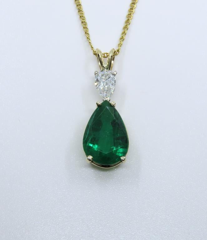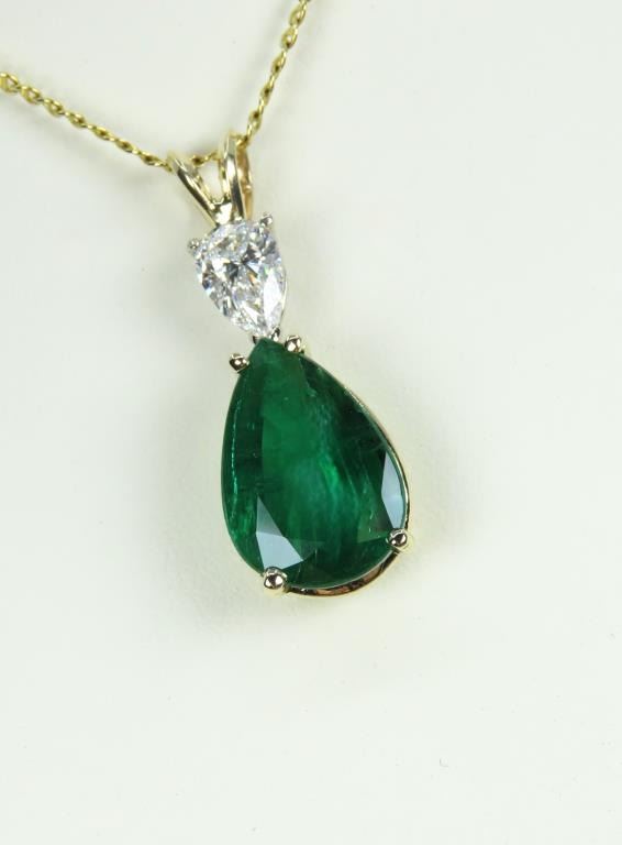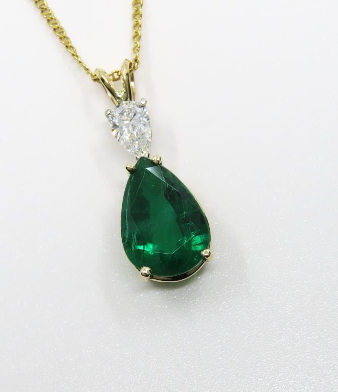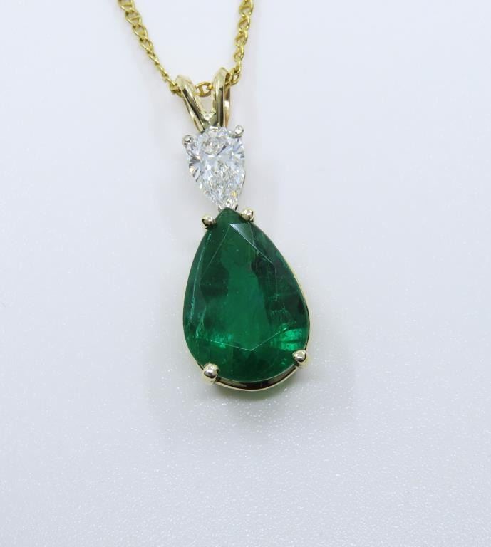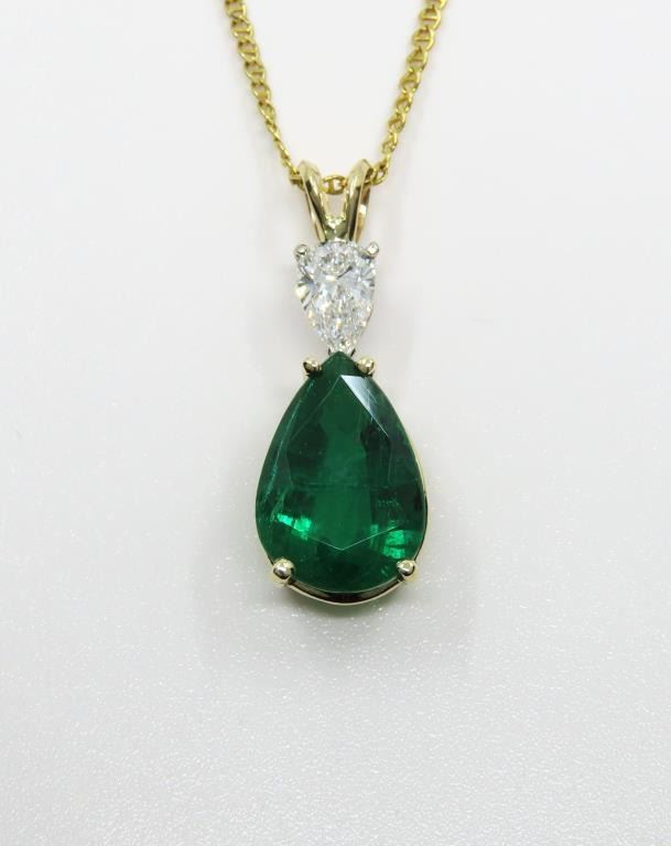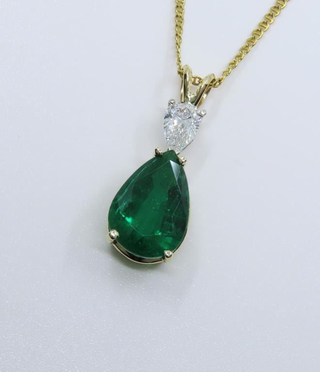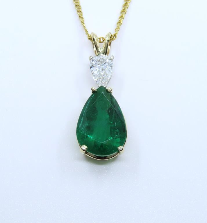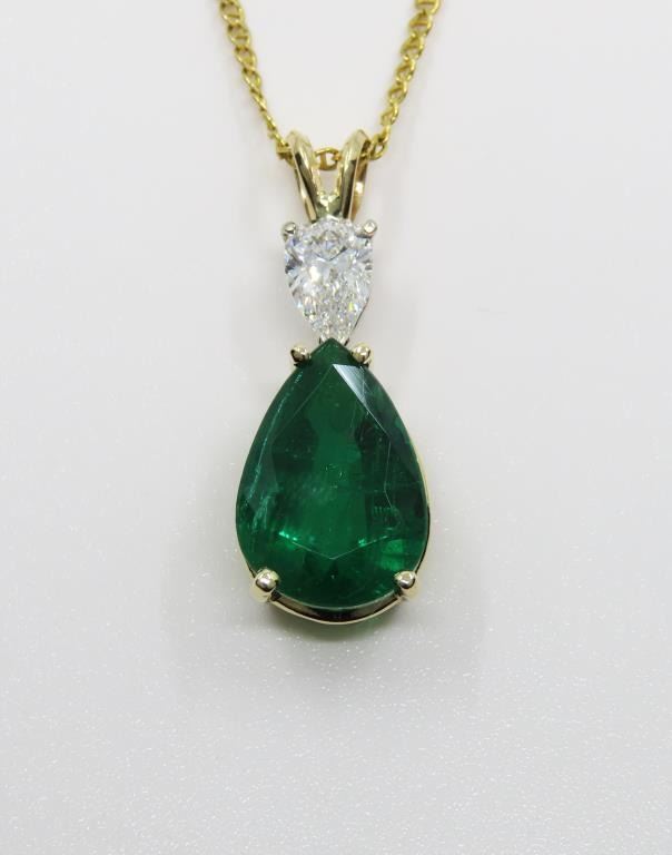 Pendant featuring a stunning, Vivid Green color 5.23 carat pear shape Emerald perfectly accented with a 0.75 carat pear shape Diamond with G-H color and VS clarity set in a 14 karat yellow gold custom crafted setting. Exceptional Luxury Piece for Jewelry Collectors and Investors. Retail Estimate at $30,000-$40,000