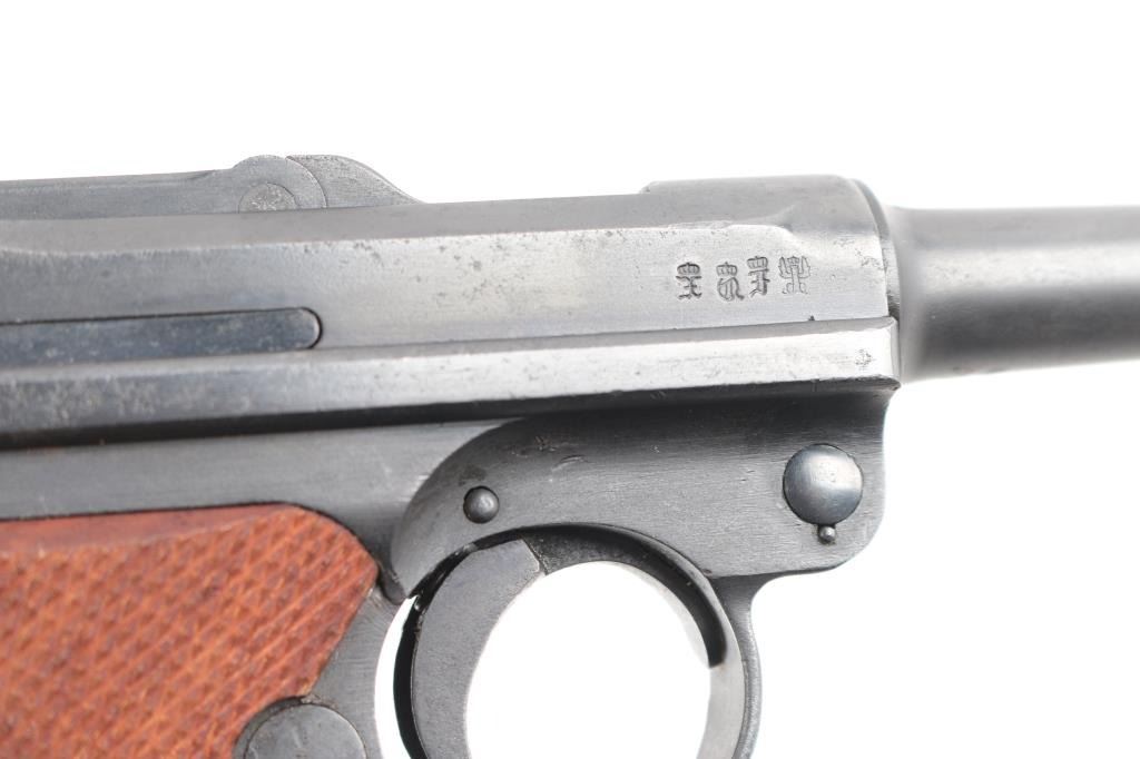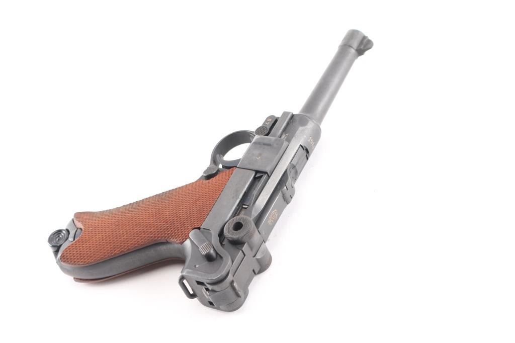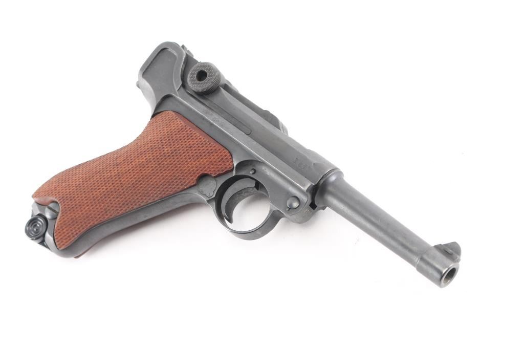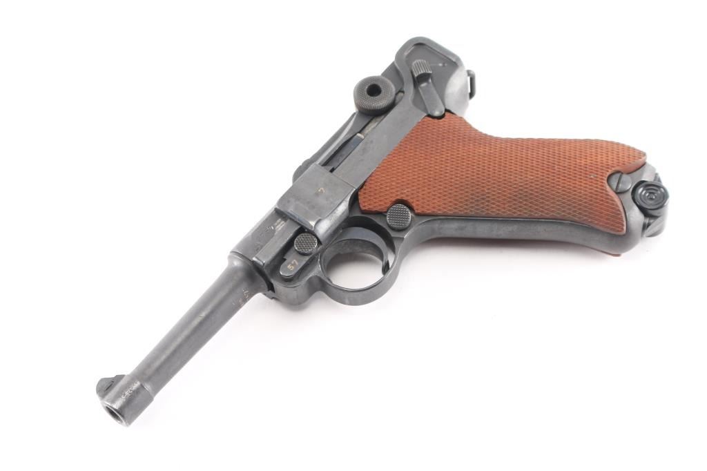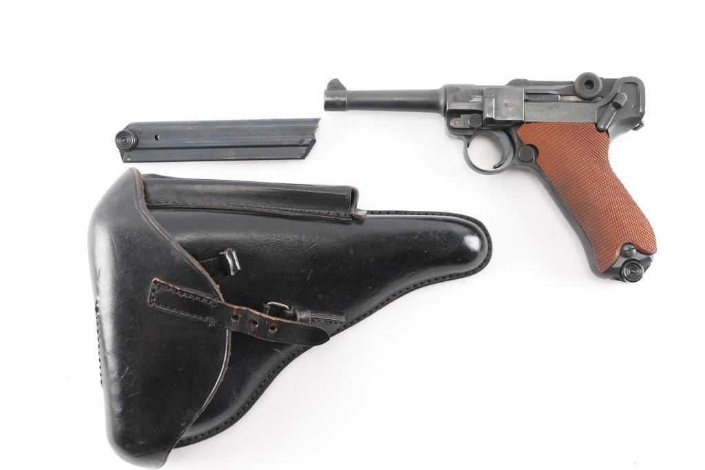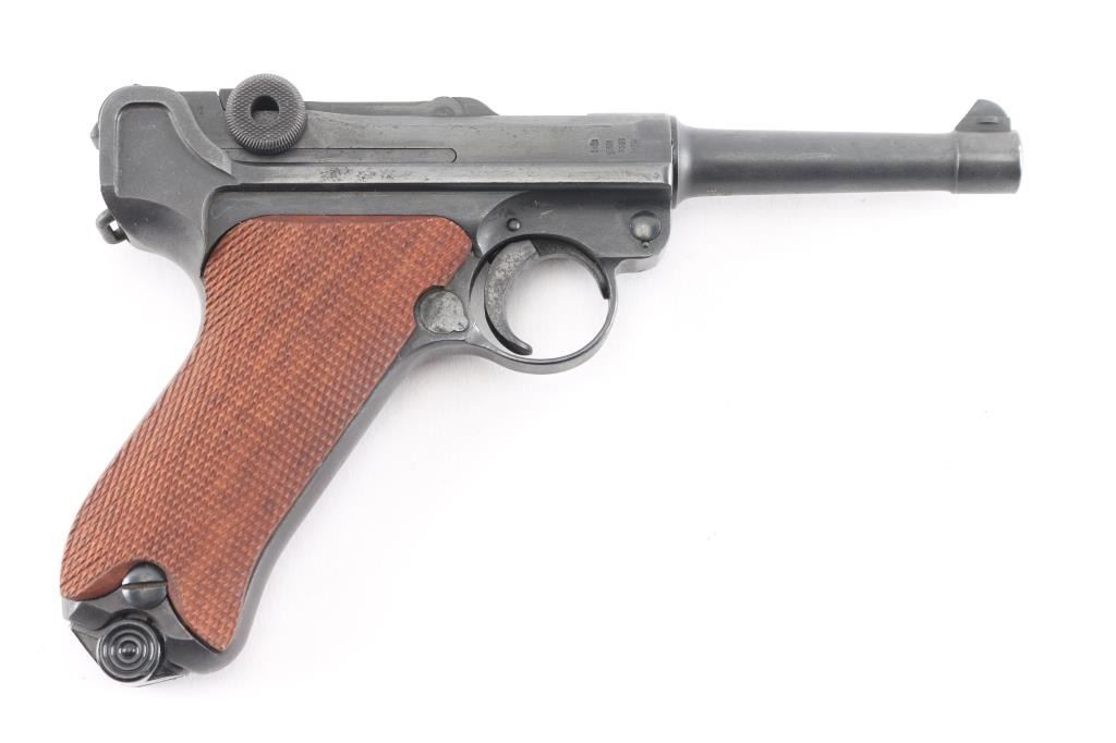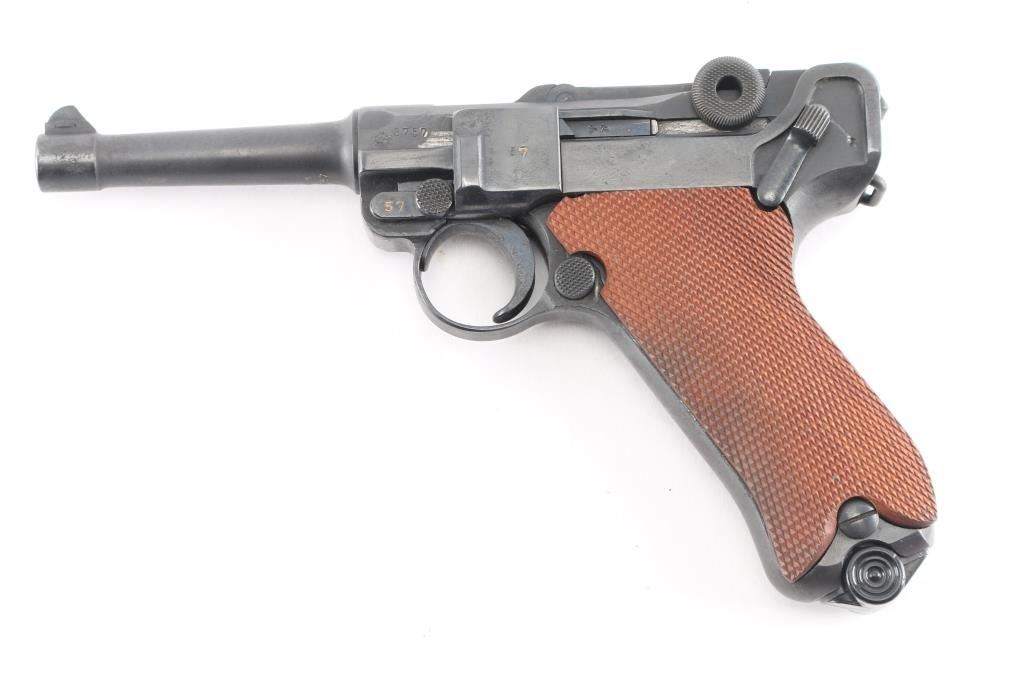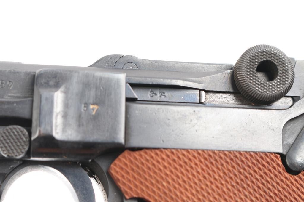 WWI era (1913 dated) German toggle locked recoil operated semi-automatic pistol chambered in 9x19mm. No import marks observed. Features blued finish, 4" barrel, dovetailed inverted 'V' front sight with witness-marks, 'v' notched rear sight, smooth crescent trigger, knurled charging knobs on the rear toggle link, manual safety on the left side of the frame, knurled push button magazine release, steel frame with lanyard loop, stock lug ground off, aftermarket replacement two-piece finely checkered walnut grips. Barrel numbered to frame, "57" observed on all small parts. Imperial proofs retained. Small marking on left side of slide has been obliterated with punch marks. Bore is fair to good condition, dark grooves and some pitting. Reworked and refinished, with some areas of pitting visible under current finish. Shows slight patina in several places. Overall 80% coverage of current finish. Grips are like new, good fit, sit proud of frame slightly in several places. Includes black leather hard shell full flap holster with tool, no markings observed. Two magazines appear aftermarket, with black plastic base plugs.