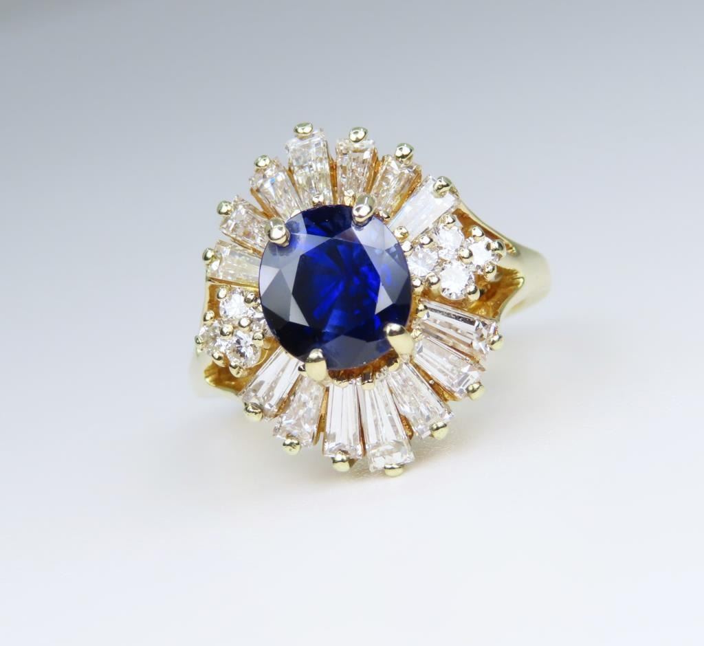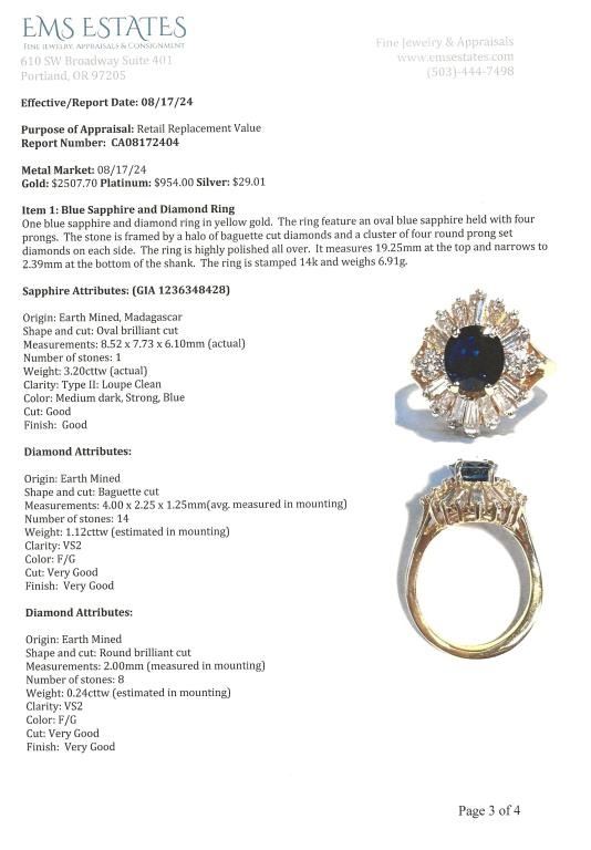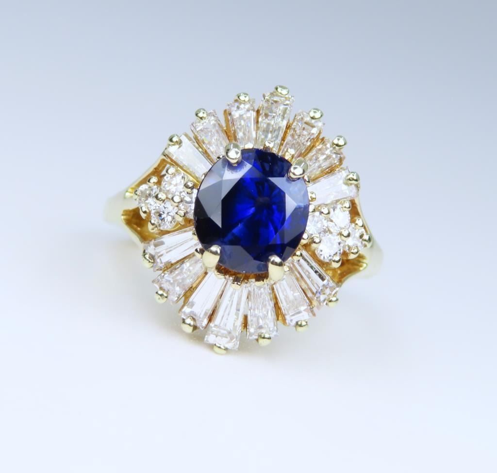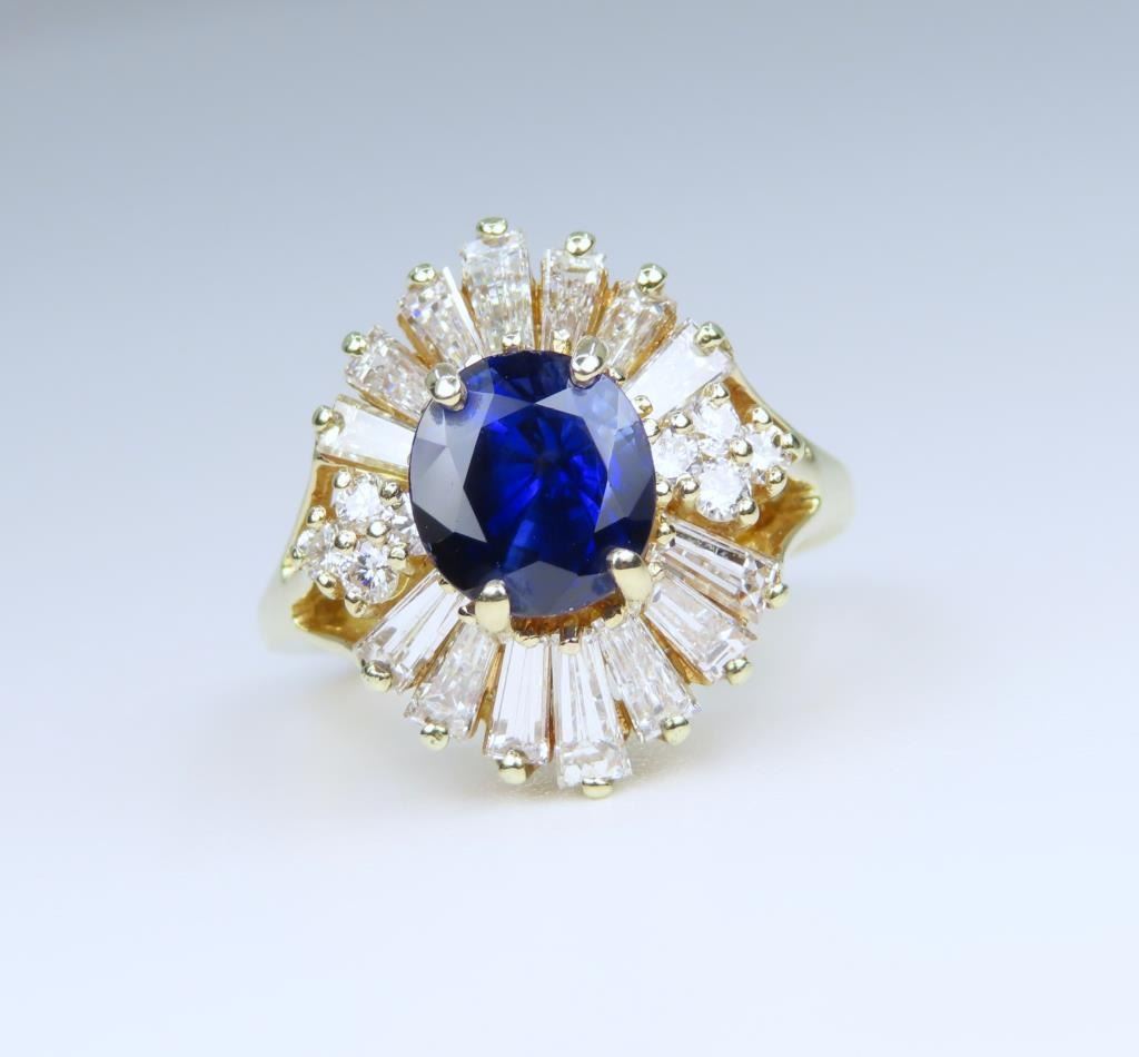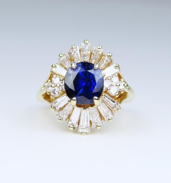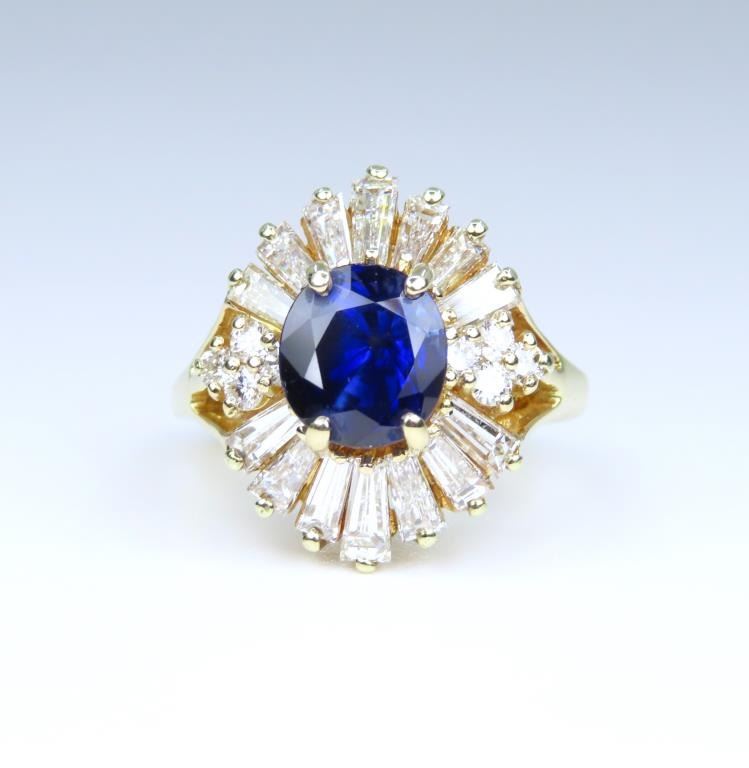 and Diamond Ring featuring an oval cut G.I.A. Certified Royal Blue Sapphire weighing 3.20 carats framed in a stunning Ballerina style setting with 22 tapered baguettes and round Diamonds weighing approx. 1.36 carats total with F-G colors and VS clarity crafted in 18 karat yellow gold, Size 7. Exceptional, Heirloom Quality Statement Piece. Full Retail Appraisal - $13,500.00