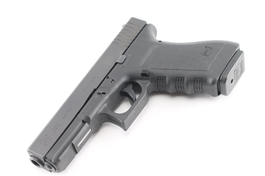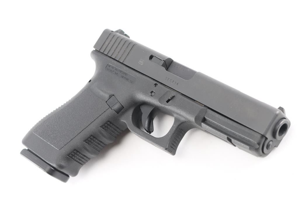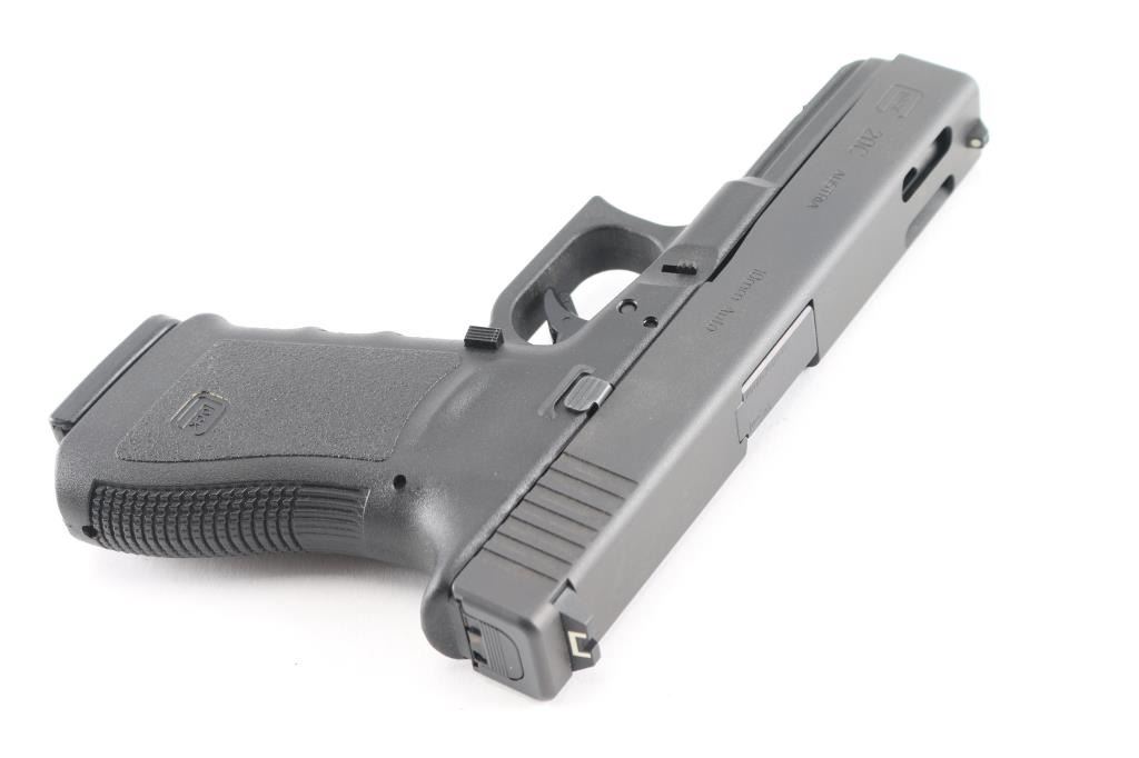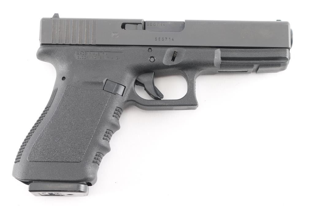 Austrian made full size safe-action semi-automatic pistol imported by Glock Inc, Smyrna GA. Features a black finished slide, 4.61" ported barrel with matching cuts in the slide, full-length guide rod, white dot front sight, dovetailed rear sight with white outlined square notch, trigger safety, push button magazine release, black polymer frame with integral accessory rail & finger groove grip. Bore is pristine. Retains 98% finish with few minor handling marks. Comes with its factory case & documents, total of four 15 rd magazines.