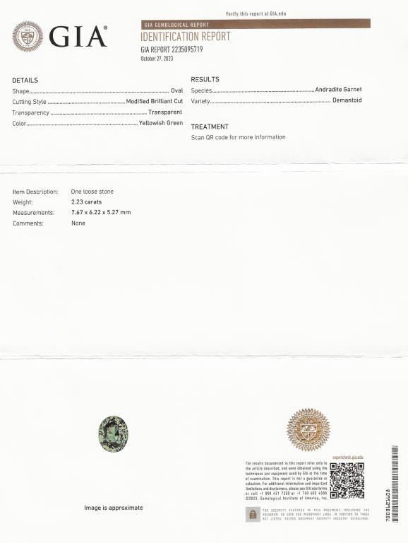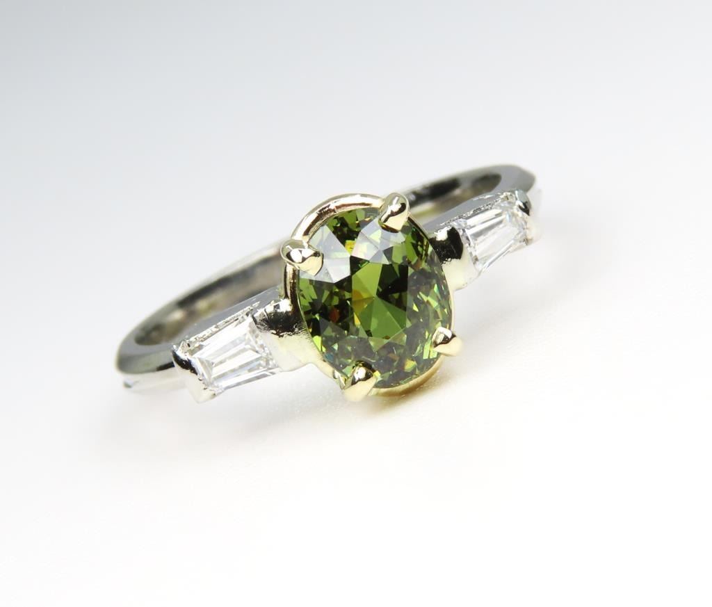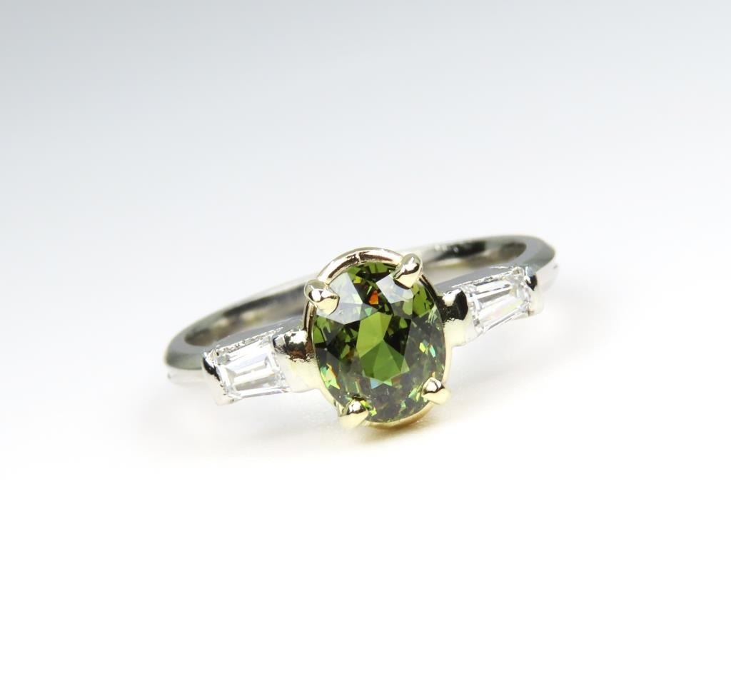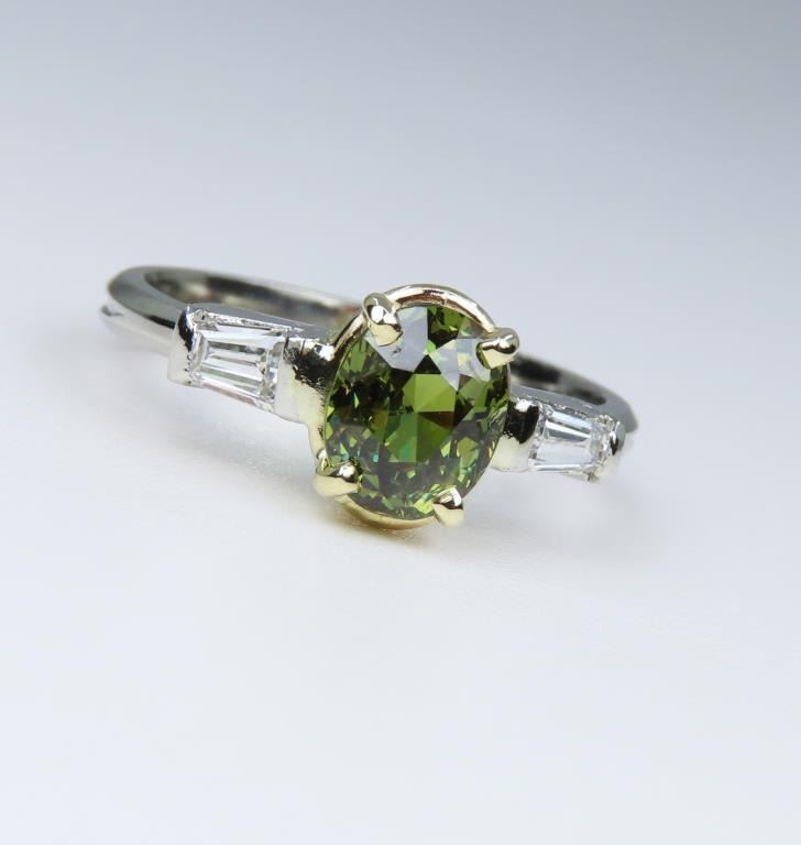 Ring featuring a Rare GIA Certified Green Demantoid Garnet weighing 2.23 carats accented with 2 baguette cut Diamonds weighing approx. 0.30 carats with F-G colors and VS clarity set in a custom Platinum and 14 karat yellow gold setting, Size 7 ¾. Retail Estimate at $15,000-$20,000