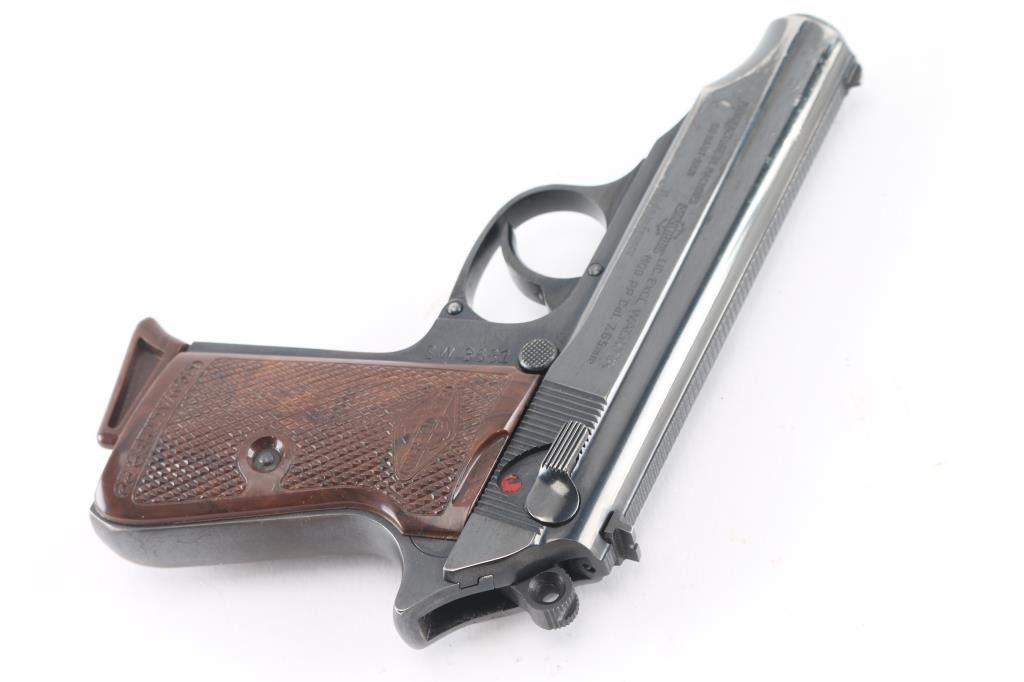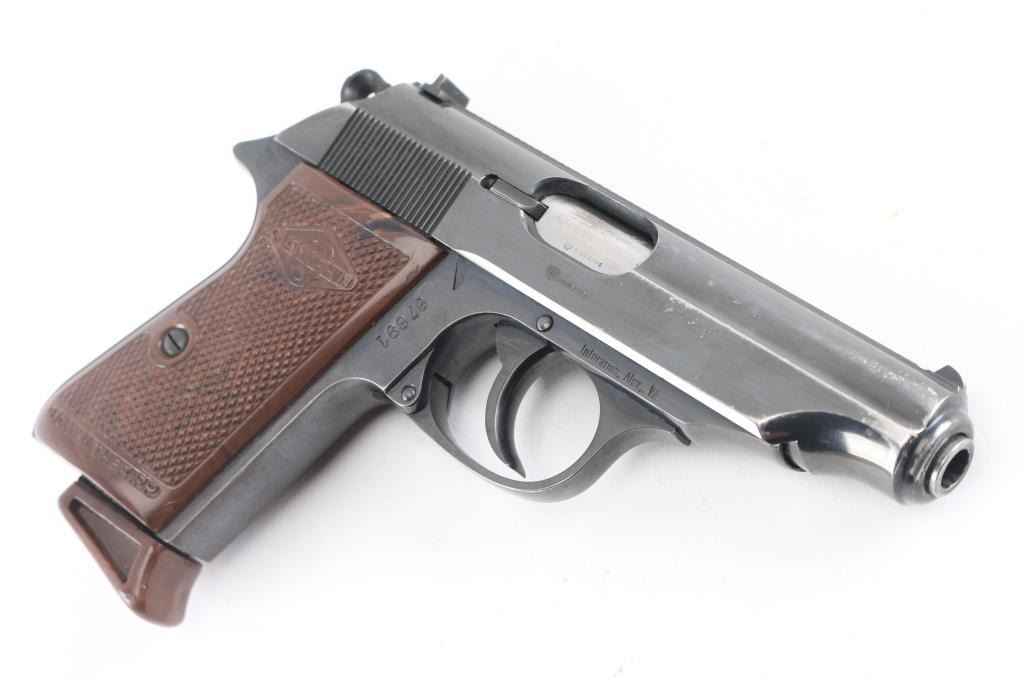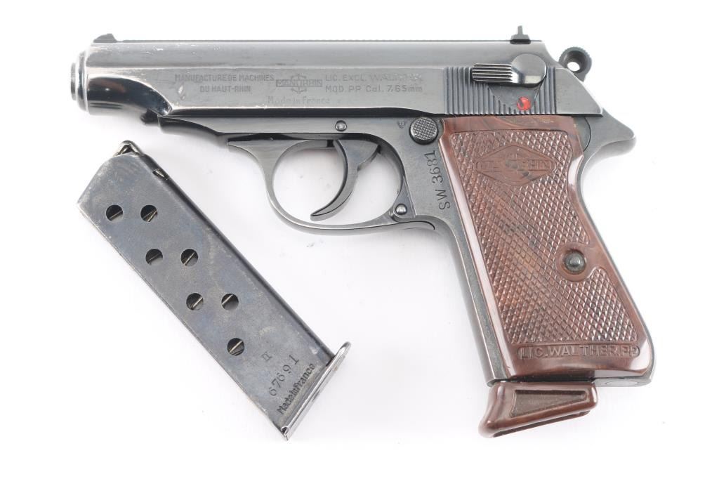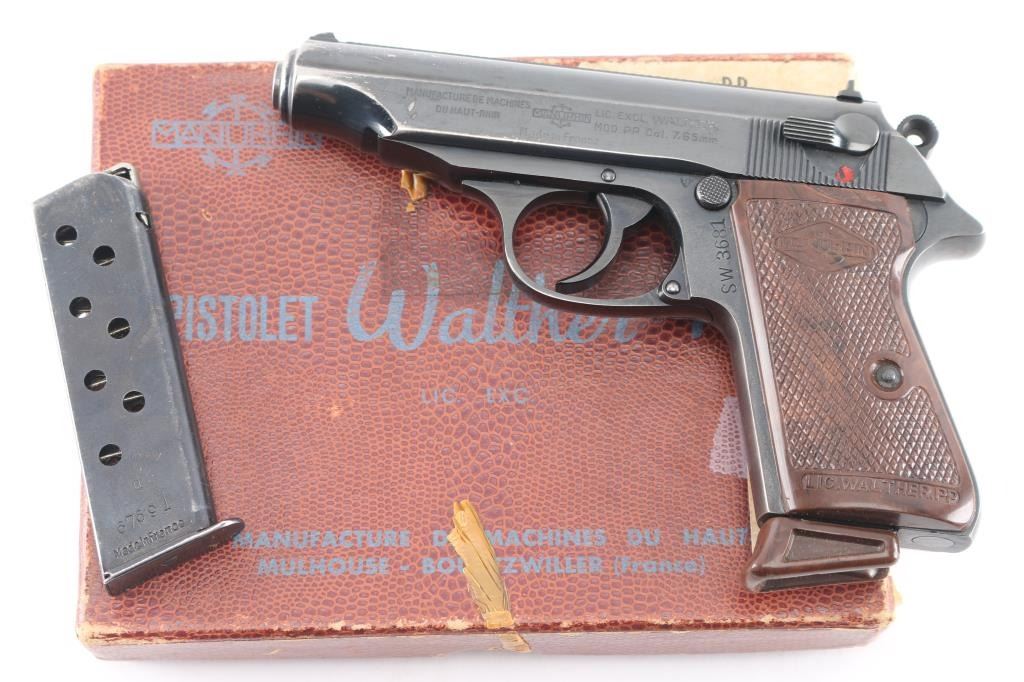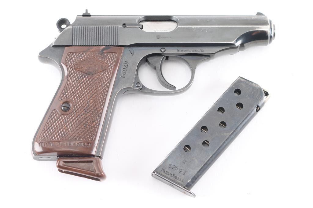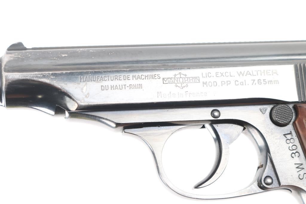SN: 67691. Police issued Pistol. French made licensed copy of the Walther PP chambered in .32 Automatic. Imported by Interarms of Va, with import stamp on the right side of the frame. This is an Austrian Police issued firearm, marked "SW 3681" on the left frame, (Sicherheits Wache = Police) Features all steel construction, a blued finish, 3.9" barrel, fixed front sight, dovetailed rear sight, thumb safety/decocker, push button magazine release, factory 8 round magazine with finger rest floorplate, smooth trigger. serrated round hammer spur, and checkered brown plastic grips. The magazine in the pistol is marked "Manurhin". Pistol exhibits approximately 92% of it's original finish with edge/muzzle wear, and minor scratches. Action is smooth, bore is pristine and grips are very good+ with some scuffs. Comes in the original factory box with manual, cleaning rod, and spare magazine. Both magazines have matching serial numbers to the pistol. Serial number range 1952-61.