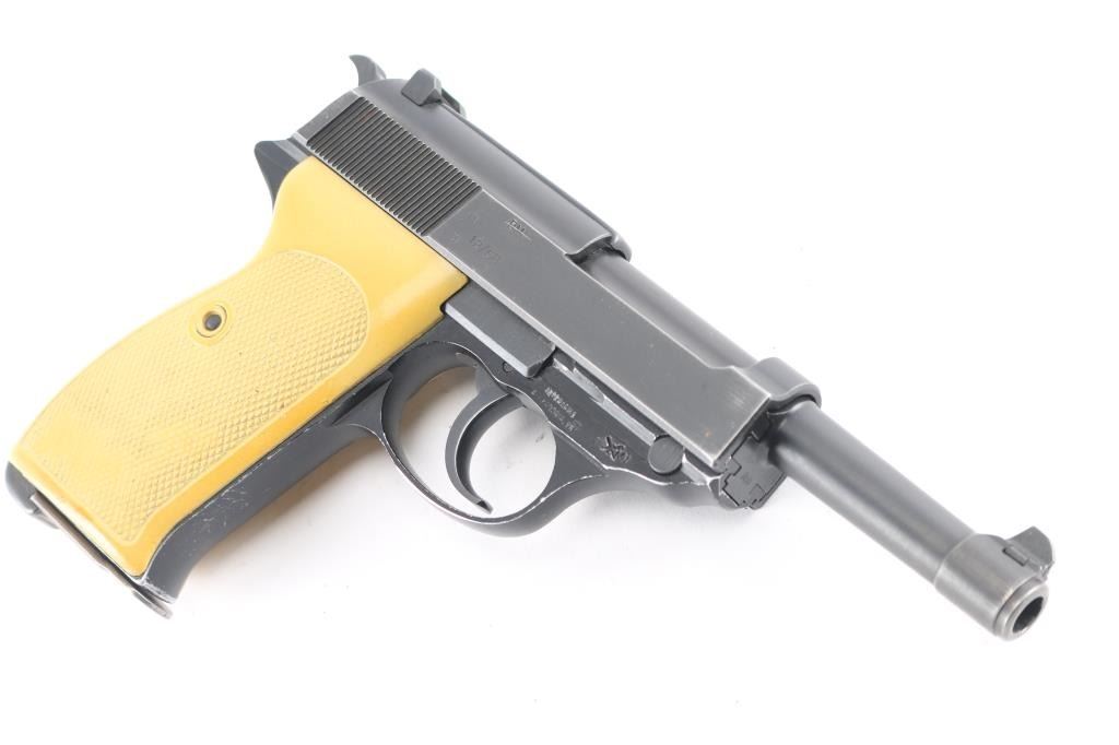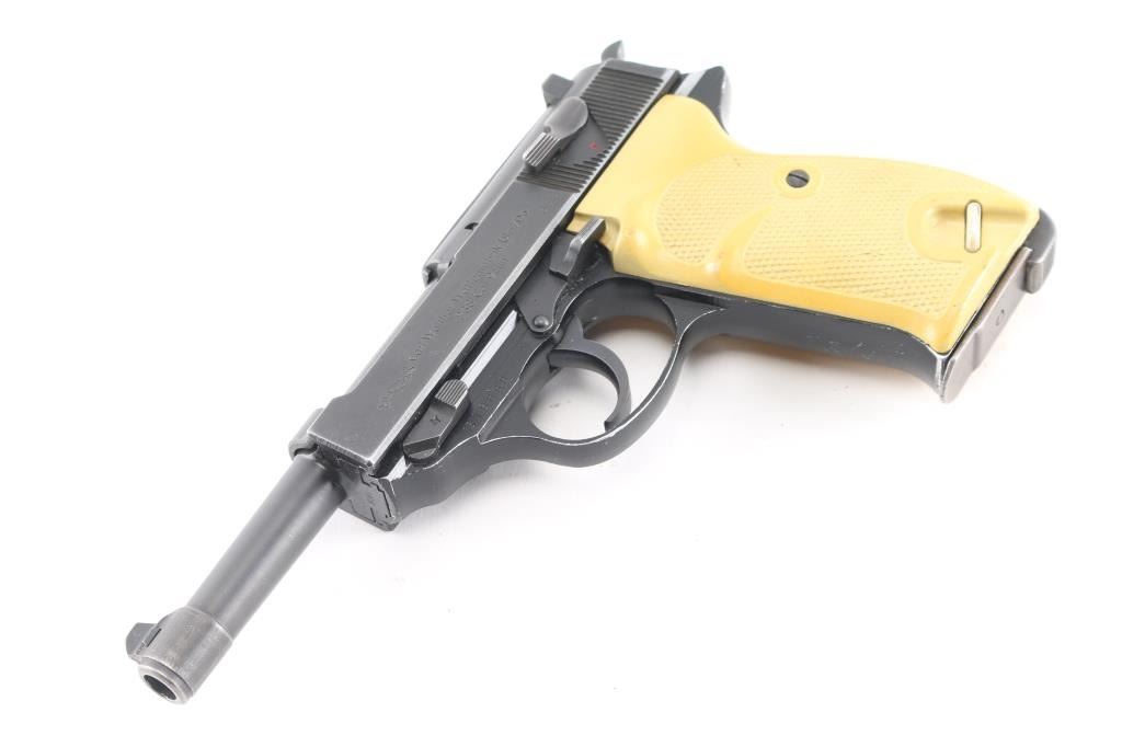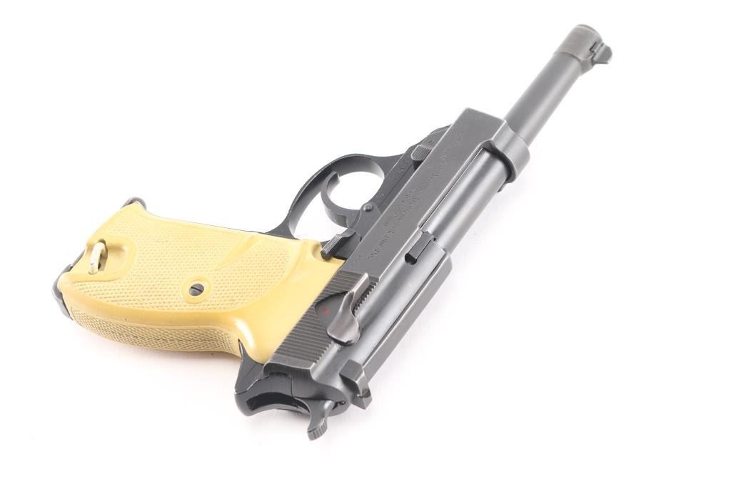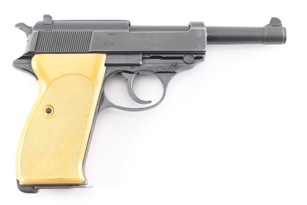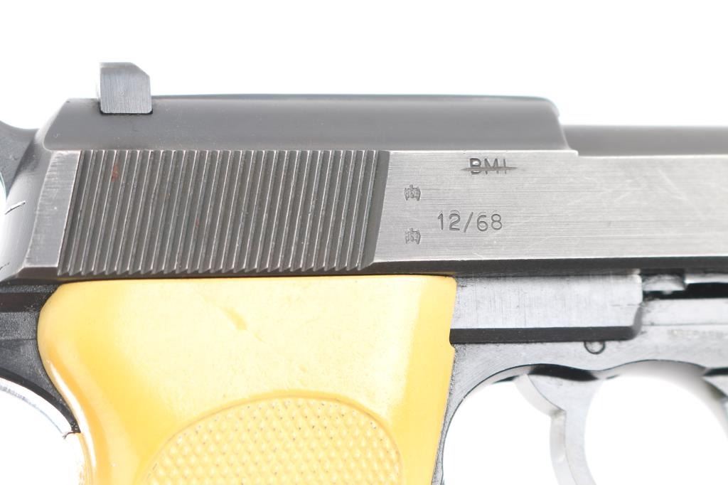 Police issued P-38 dated 12/68, imported by Interarms. The right slide, & frame are marked "BMI", which have been crossed out. The Federal Interior Ministry (Bundesministerium des Innern, BMI) did not issue these guns. They acquired them for the agencies under their administrative jurisdiction. In case of the P38, these pistols were primarily carried by the Border police (Bundesgrenzschutz, BGS); some were also acquired through the BMI for the Readiness Police (Bereitschaftspolizei, Bepo) of some of the West German states. Features approx 4.75" barrel, dovetailed blade front & notch rear sights, single/double action, decocker safety, heel magazine release, aluminum alloy frame. one piece white plastic grip. Bore is excellent/bright, action is smooth, finish is about 94% with some edge wear, grips are very good with some minor scuffs.