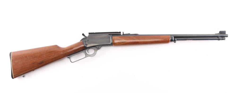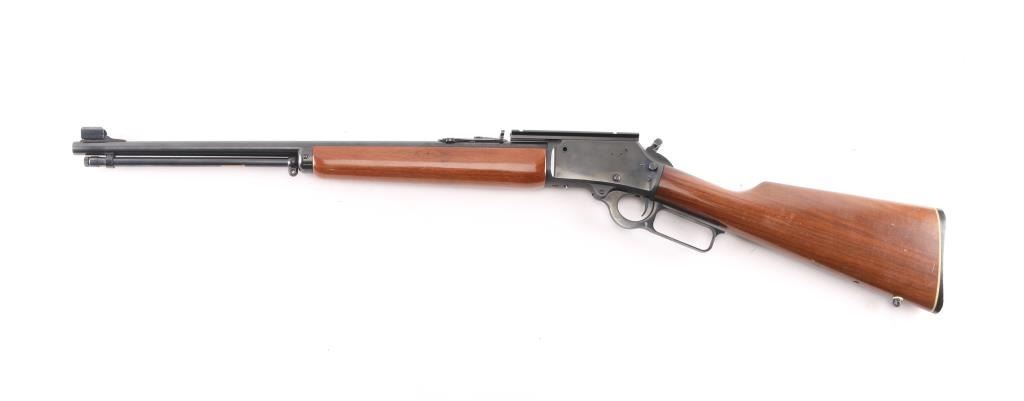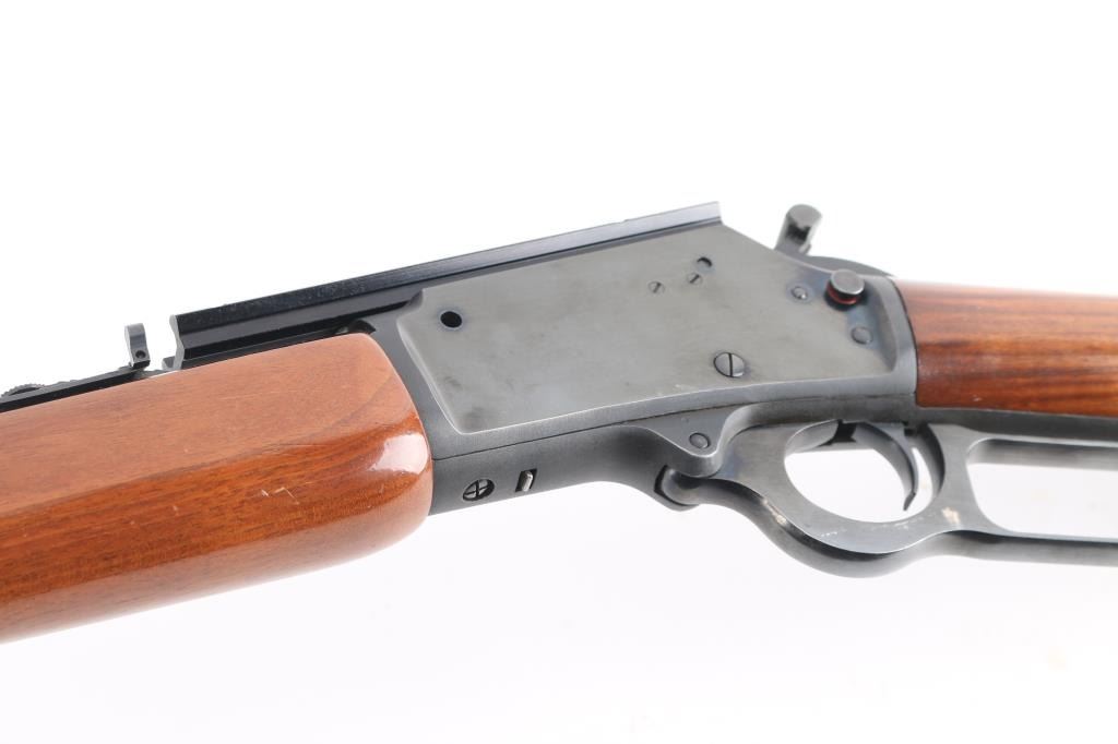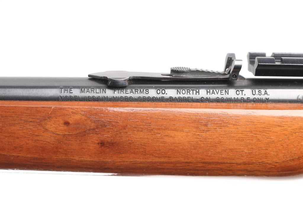 Marlin Model 1894M lever action rifle in .22 W.M.R.F. (Winchester Magnum Rimfire), making this a first year production of this model. This 1894M is in good condition. Features a 20" micro groove barrel with an excellent bore. Also has a "JM" stamp indicating it was made the by the original Marlin firearms team. An elegant rifle chambered for pistol calibers. Its handy size is punctuated by a quick-pointing, straight-grip stock design and Old West-styled, adjustable semi-buckhorn sights, hooded blade/bead front sight. The Model 1894M, manufactured from 1983-1989 is a caliber .22 Magnum lever action with no loading gate and a tubular magazine. Only approximately 12,000 made. Finger extension on hammer spur. Sling studs. Mounted with a scope base on the receiver. Bore is excellent/bright, blue is excellent excellent. wood has a few very minor scratches, lower butt stock has a hole drilled in front of the swivel stud.