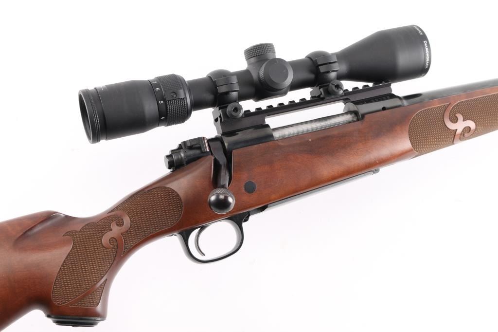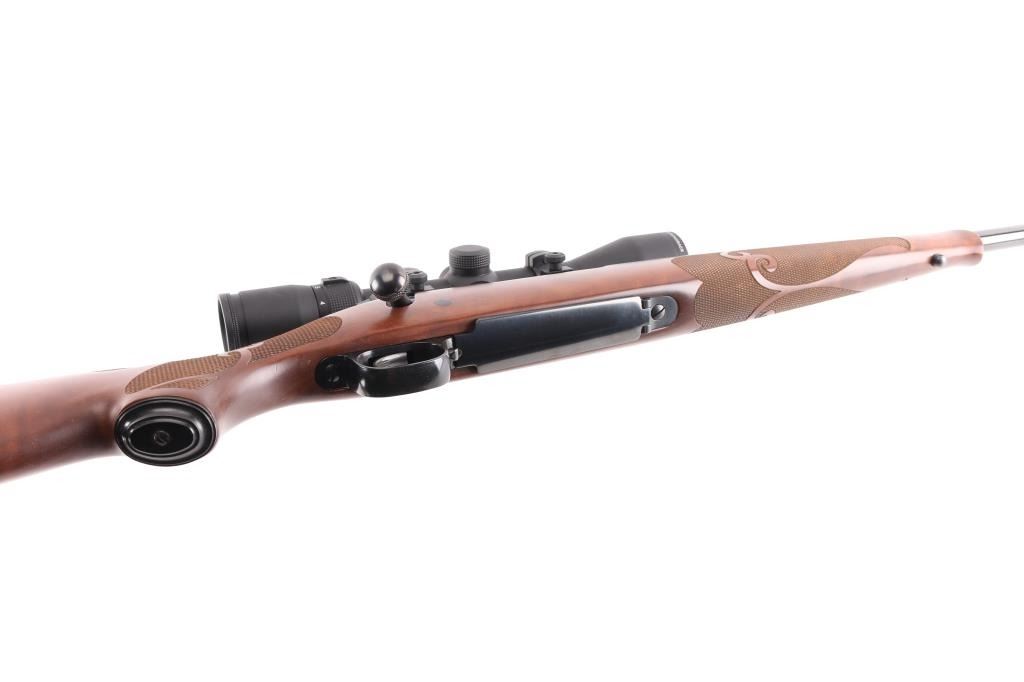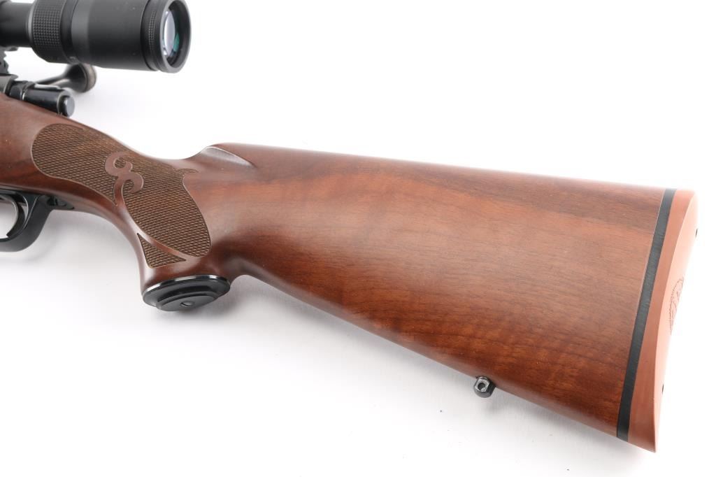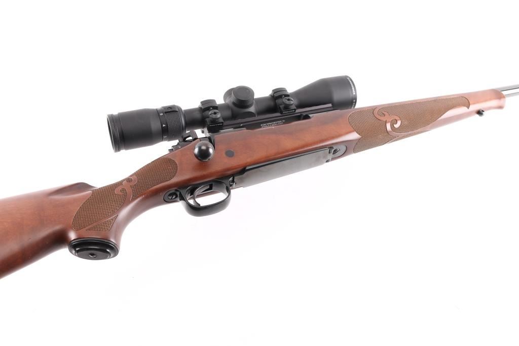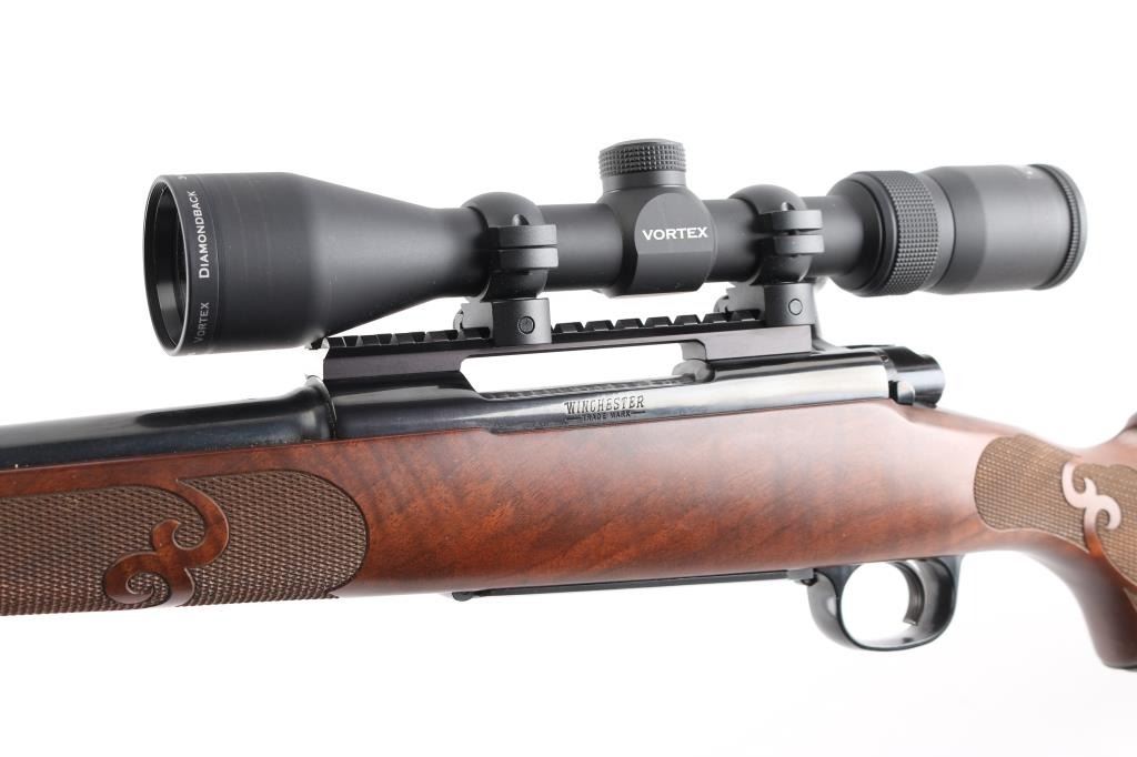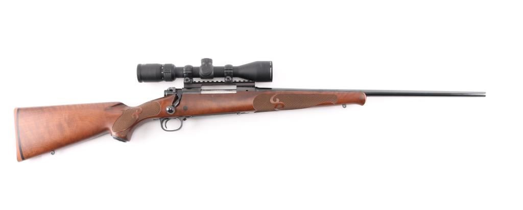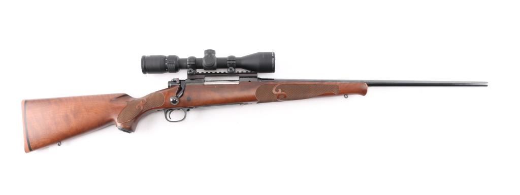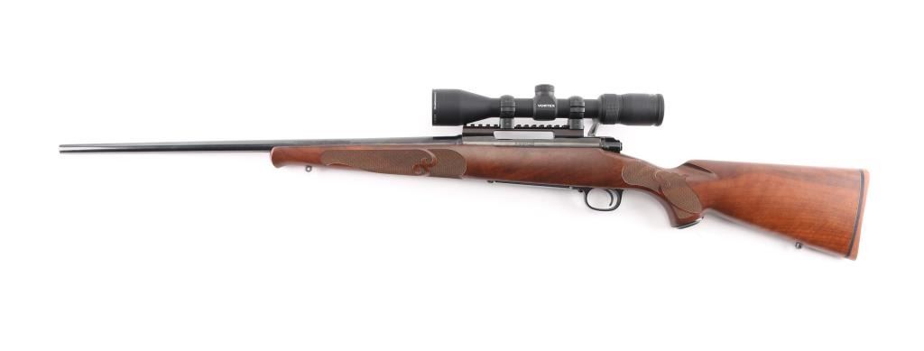 'Classic Featherweight', chambered in 6.5x55mm Swedish. Manufactured 1997-2006. Bolt action rifle features blued finish, wood stock with semi-pistol grip, schnabel forend, factory rubber recoil pad, checkered panels at wrist & forend, black grip cap. 22" sightless barrel, push feed type jeweled bolt, three position manual safety, hinged floorplate, sling studs. Mounted with a Vortex Diamondback 3-9x40 scope, very good condition, clear optics. Bore is very good condition, needs cleaning. Retains 99% bluing with a couple of very minor scratches. Stock is near excellent with a few very minor dents.
