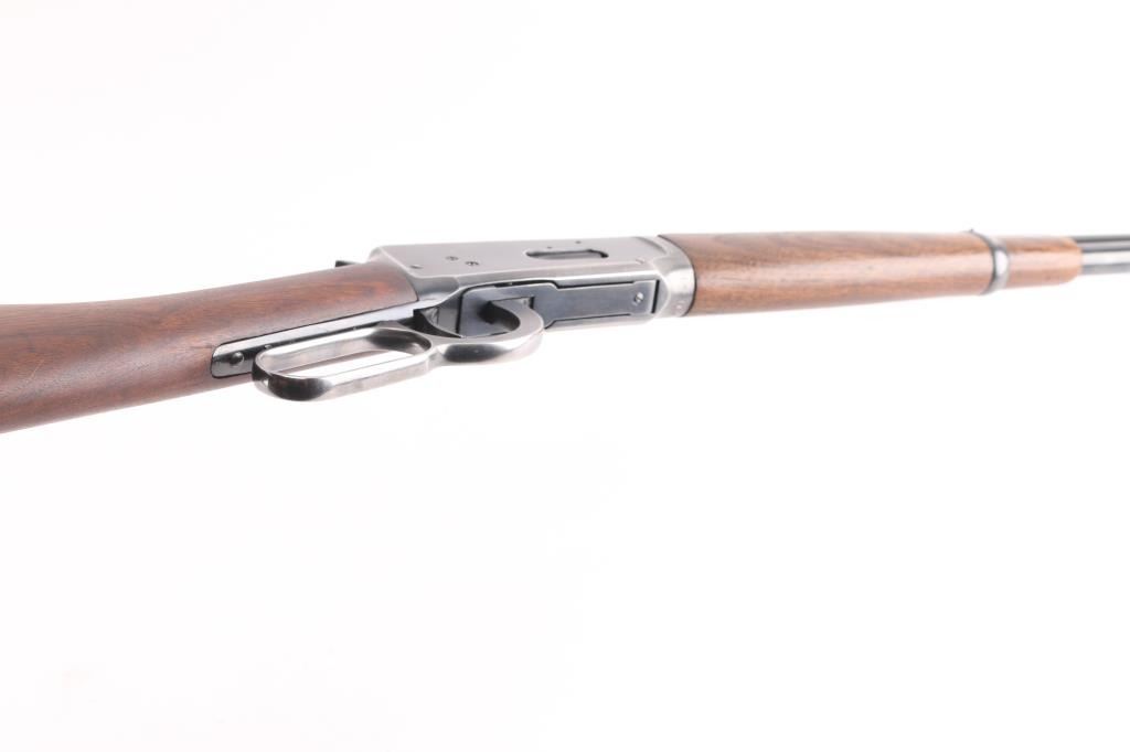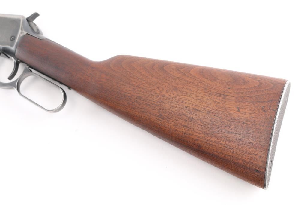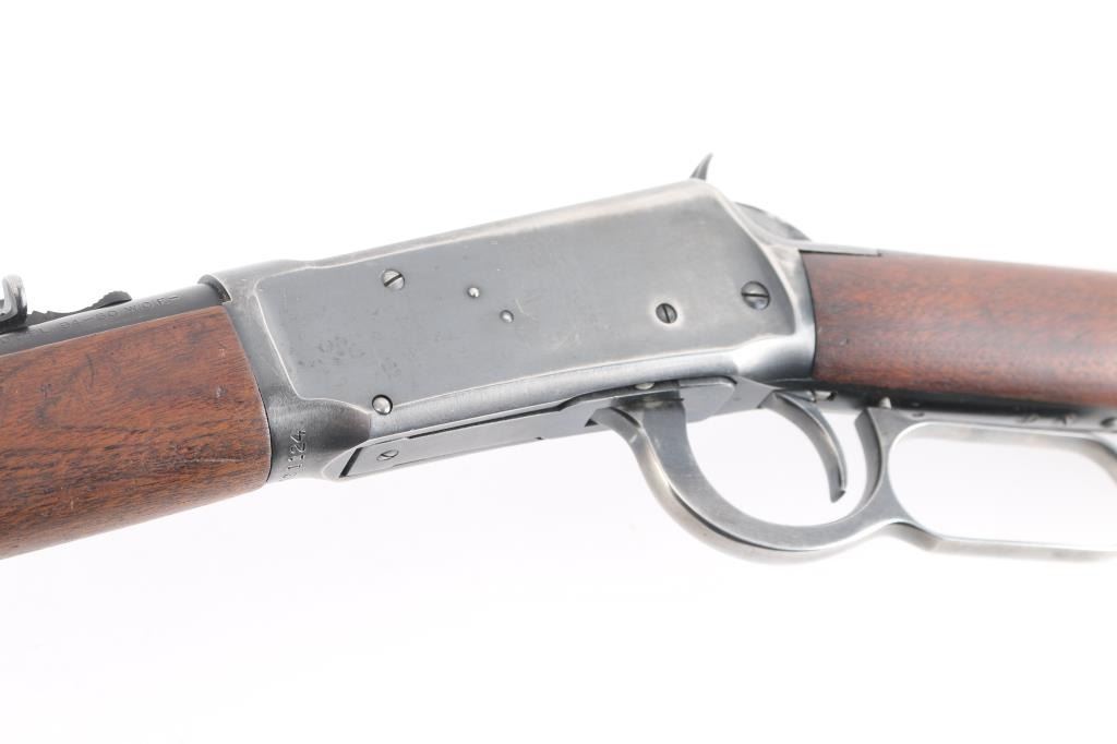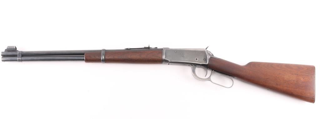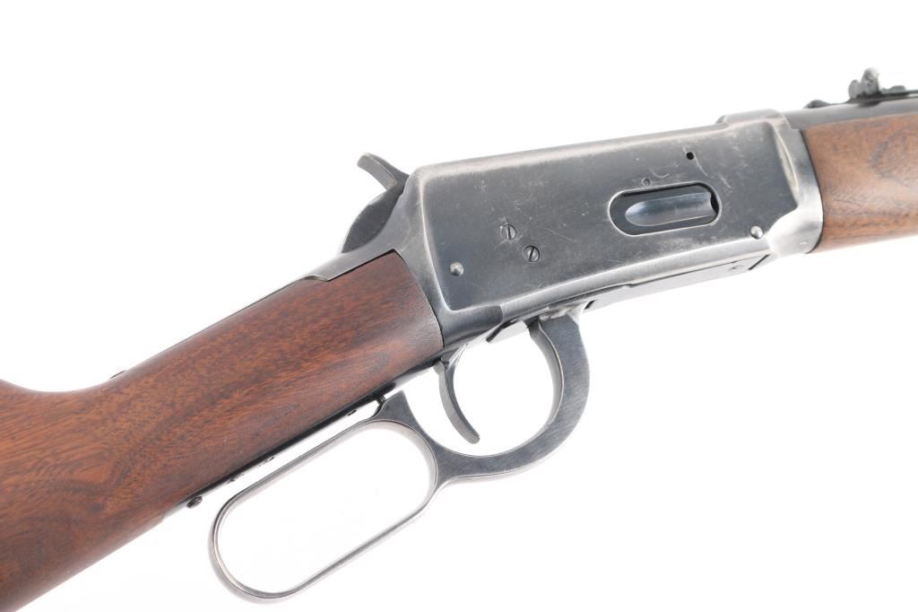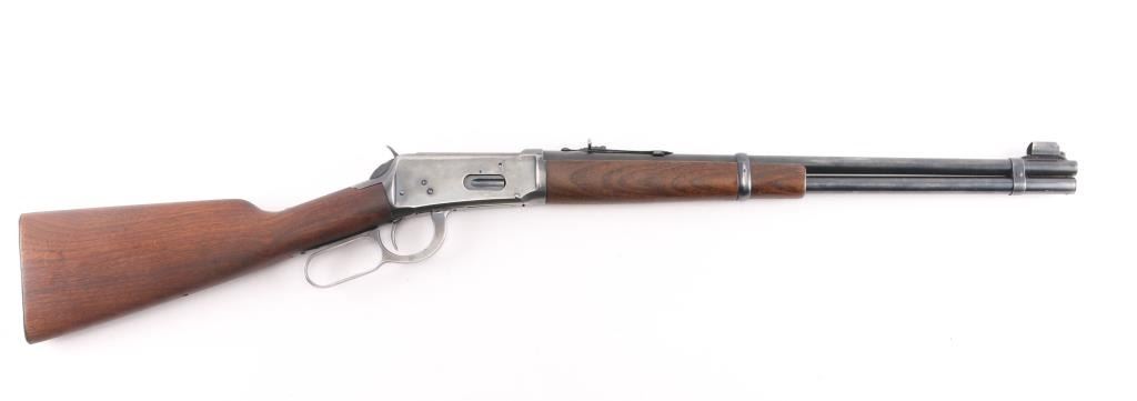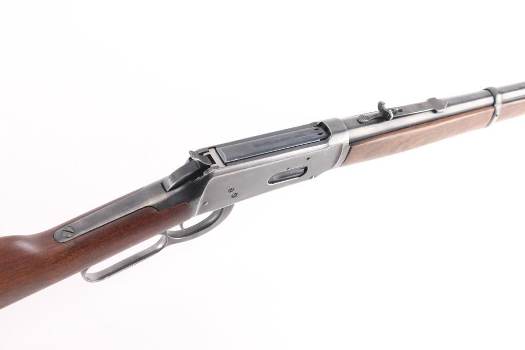 'Pre-64 Eastern Carbine' Lever action repeating rifle manufactured in New Haven, CT circa 1943-48. Features a blued finish, 20" tapered barrel, full-length tube magazine, hooded ramped blade/bead front sight, buckhorn adjustable rear sight, smooth trigger, serrated hammer spur, two barrel bands, smooth walnut forend and straight grip shoulder stock with checkered steel buttplate, hole for sling swivel stud in buttstock. Bore is excellent/bright, strong rifling. Retains about 70% finish with edge losses, scratches, handling loss, mostly on the receiver. Wood is very good condition with minor dents & scuffs, lever action is smooth.