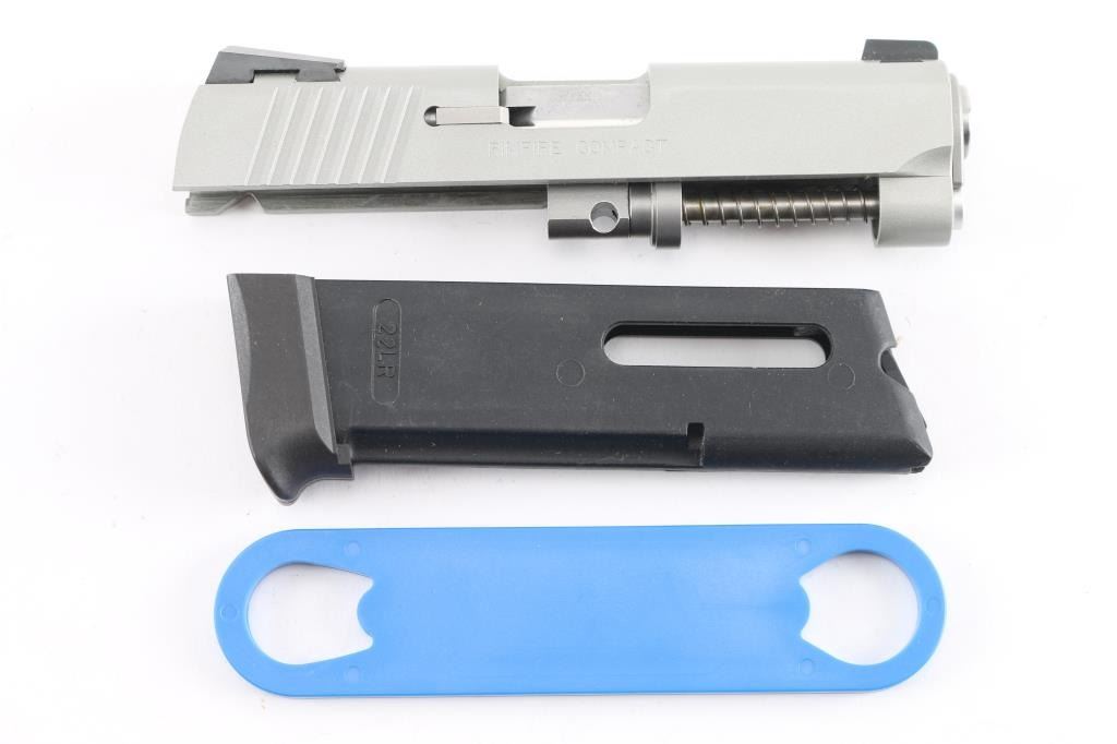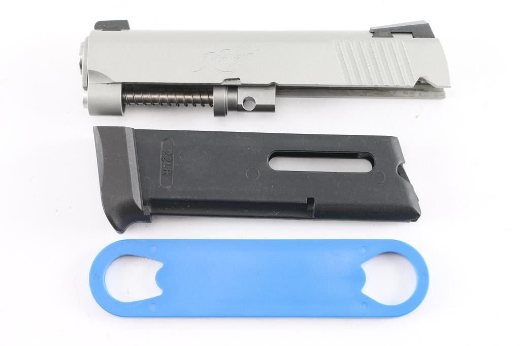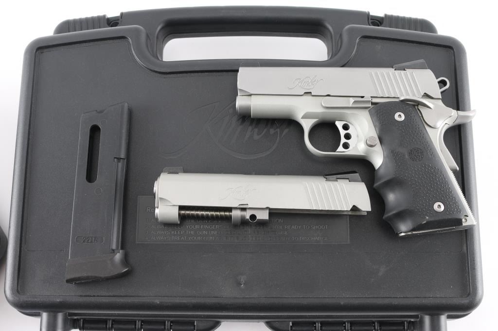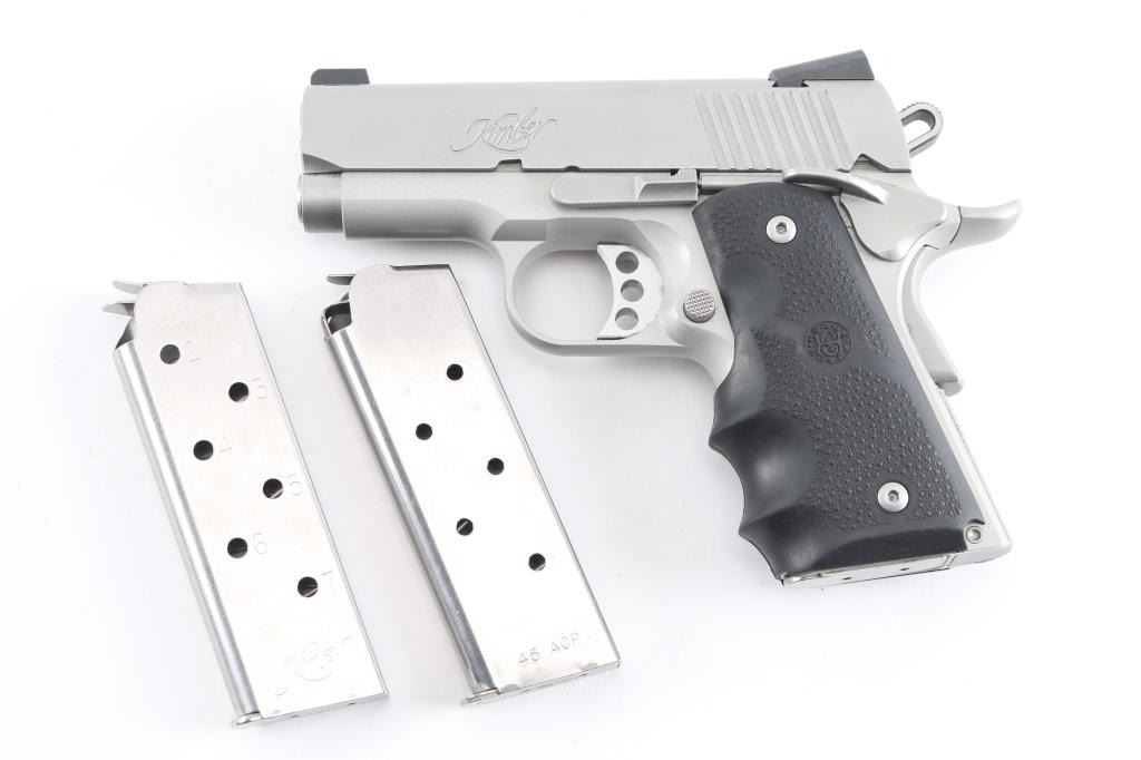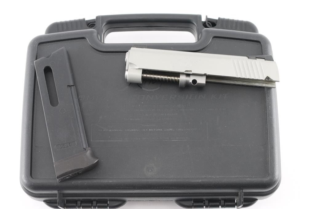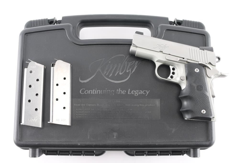 SN: KU295741. High quality 1911A1 style single action semi-automatic compact pistol chambered in .45 Auto. Features matte finished stainless steel construction, bushing-less 3" stainless steel barrel, full-length guide rod, dovetailed 3-dot sights with drift adjustable rear sight, serrated, skeletonized trigger with overtravel adjustment, skeletonized hammer with serrated spur, extended safety on left side of frame, upswept grip safety, push button magazine release, knurled flat mainspring housing. Wrap around black rubber Hogue grips. Bore is excellent. Overall like new with minor handling marks. Original factory hard case with documents. (3) factory 7-round magazines. Also included in this lot is the Kimber compact conversion kit for this pistol in .22 LR. The Kimber Rimfire Compact Conversion Kit turns your Pro, Compact or Ultra .45 into a Compact slide, .22 LR pistol in about one minute. Features slide with match grade barrel, fixed sights, and fitted hard shell case. Also includes one 10-round magazine with spare extended pad for Ultra models, take down tool. Like new condition.
