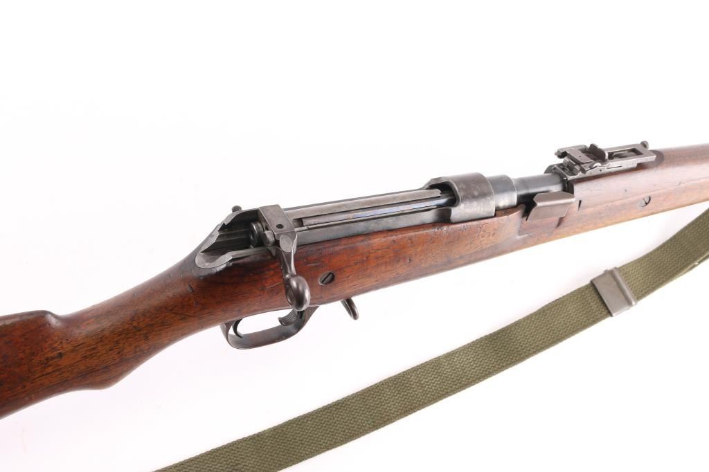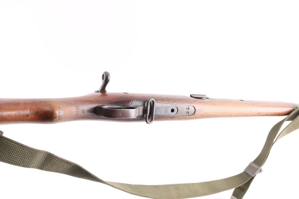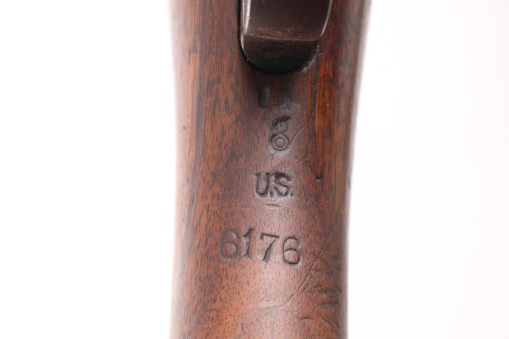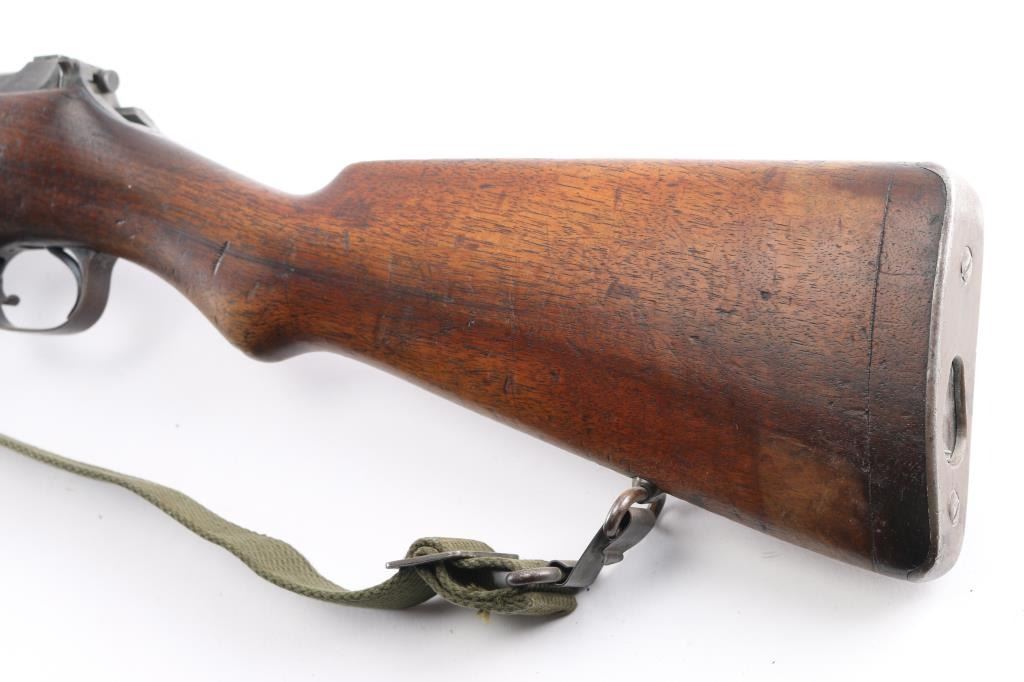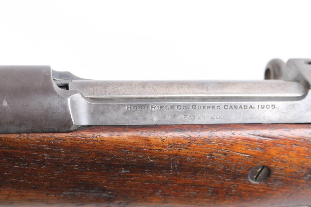 M1905' WW 1 era Canadian military rifle chambered for the 303 British cartridge. Straight pull. Features a right side mounted lever for depressing the magazine follower, bolt catch lever on rear left side of receiver, and a lever in the triggerguard that retracts the cartridge stop to allow rapid unloading. Barrel length is 28 inches, with hooded blade front, and adjustable Pilbald rear sights. Sliding trap door in butt. Bore is ok, with strong rifling, dark frosting in the grooves. Metal finish has thinned with areas turning a gray patina with some scattered areas of light pitting on the chamber. Stock is very good with the usual scratches/dings. Right buttstock has Quebec cartouche with Canadian proofs, 1908 date, unit markings. Left receiver rail marked "Ross Rifle Co. Quebec, Canada, 1905". Action is smooth/tight. The underside of the grip is stamped "U.S." with flaming bomb, and the serial number 6176, Ross rifles did not stamp the SN on metal, just the stock. But for ATF purposes we could not use it. No import marks observed. Comes with green canvass sling. In1917, the U.S. Government purchased 20,000 Ross rifles and bayonets from Canada.