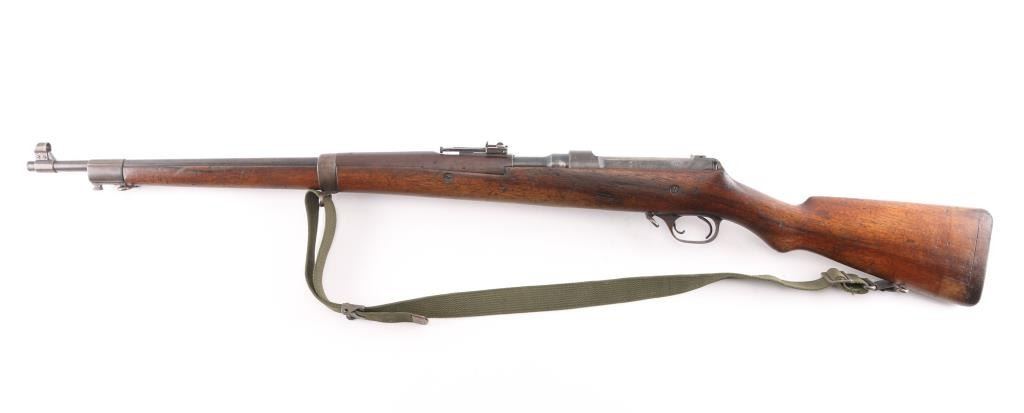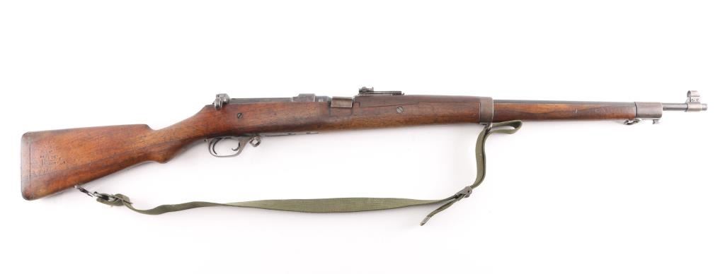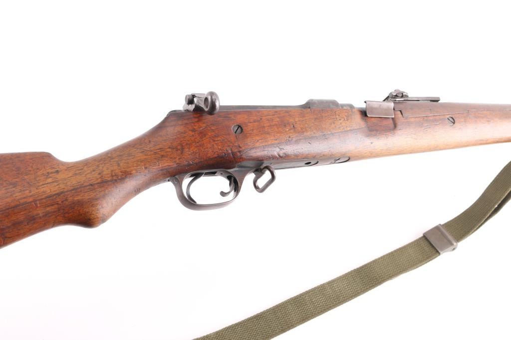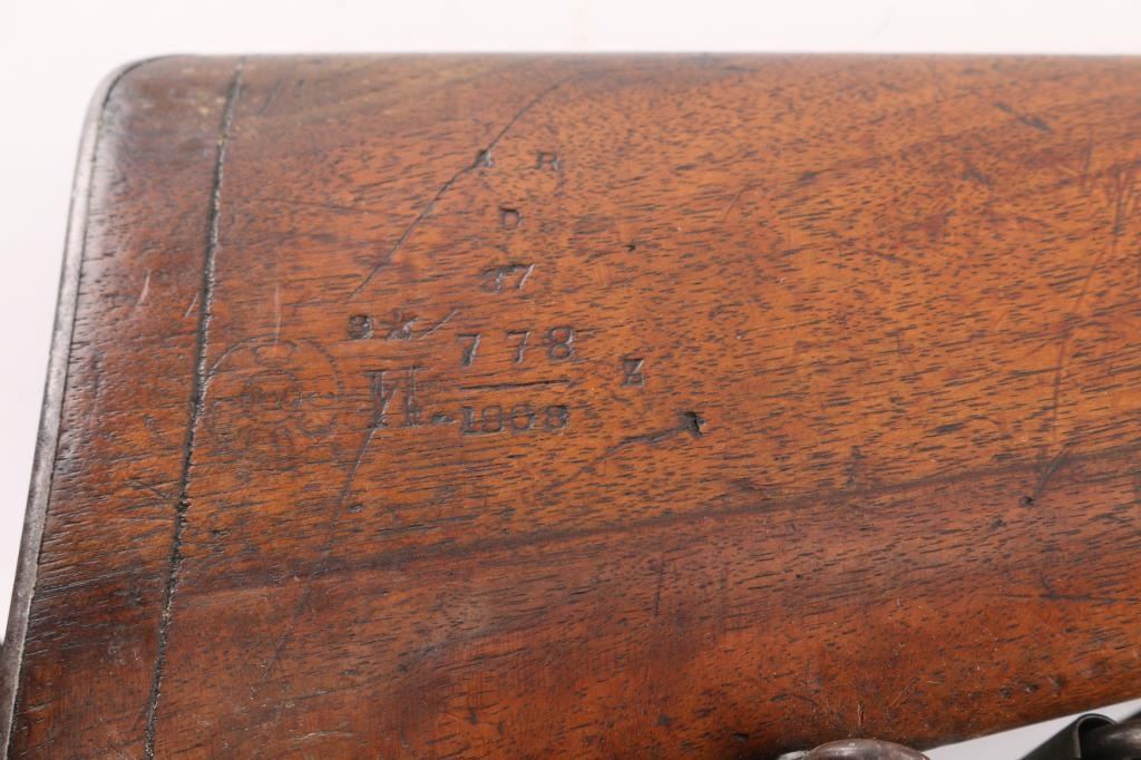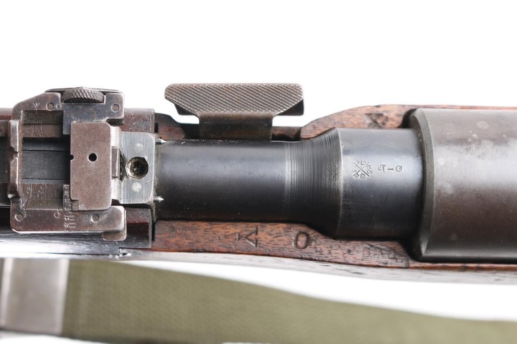 M1905' WW 1 era Canadian military rifle chambered for the 303 British cartridge. Straight pull. Features a right side mounted lever for depressing the magazine follower, bolt catch lever on rear left side of receiver, and a lever in the triggerguard that retracts the cartridge stop to allow rapid unloading. Barrel length is 28 inches, with hooded blade front, and adjustable Pilbald rear sights. Sliding trap door in butt. Bore is ok, with strong rifling, dark frosting in the grooves. Metal finish has thinned with areas turning a gray patina with some scattered areas of light pitting on the chamber. Stock is very good with the usual scratches/dings. Right buttstock has Quebec cartouche with Canadian proofs, 1908 date, unit markings. Left receiver rail marked "Ross Rifle Co. Quebec, Canada, 1905". Action is smooth/tight. The underside of the grip is stamped "U.S." with flaming bomb, and the serial number 6176, Ross rifles did not stamp the SN on metal, just the stock. But for ATF purposes we could not use it. No import marks observed. Comes with green canvass sling. In1917, the U.S. Government purchased 20,000 Ross rifles and bayonets from Canada.