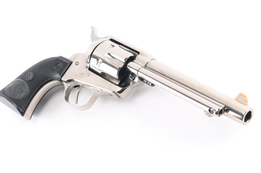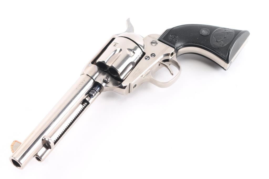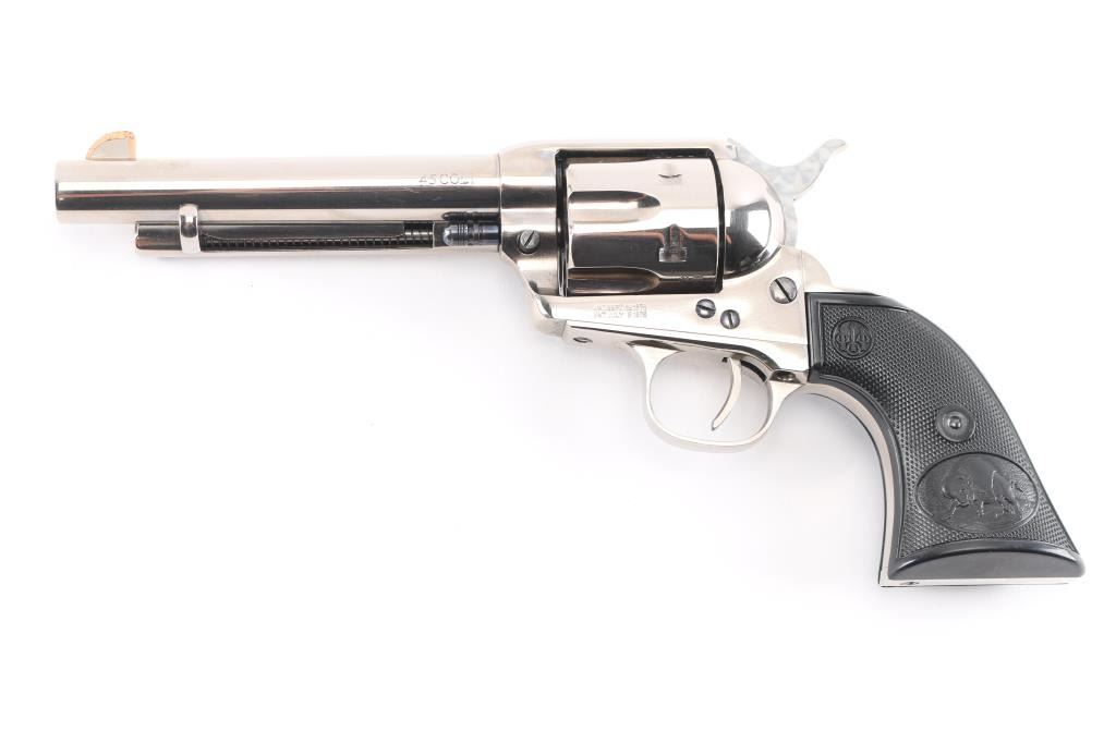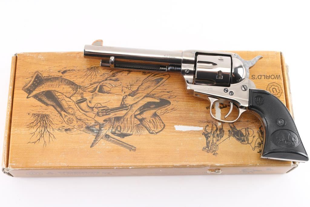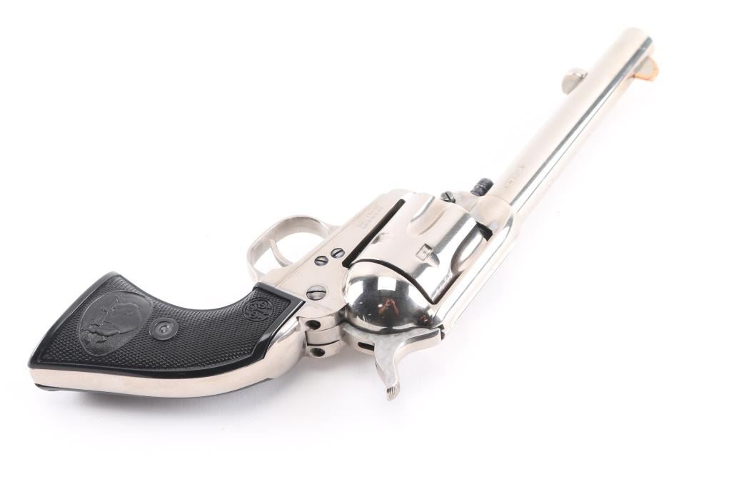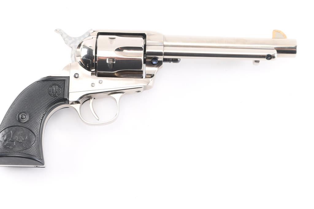 Single-action revolver, manufactured by Uberti in Italy, imported by Stoeger, Accokeek, MD. Stainless steel construction, 5 1/2" barrel, ejector rod, blade front sight with copper trim along the edge for better visibility, square notched rear sight, fluted six-shot cylinder, hammer sides have been jeweled, smooth thin trigger. knurled hammer spur and two piece checkered black plastic grips with charging bison motifs. Metal finish is excellent. Grips are excellent. Bore/cylinders are excellent/bright. Action is smooth/tight. Serial number matched on frame, cylinder, and loading gate. Comes with matching factory cardboard box.