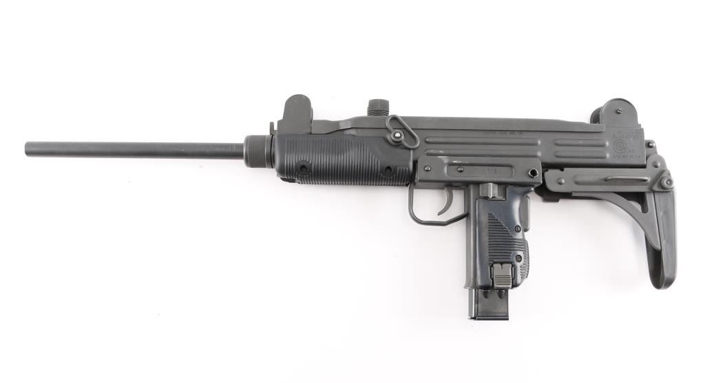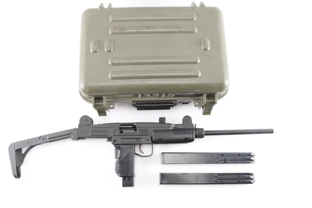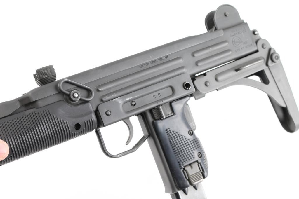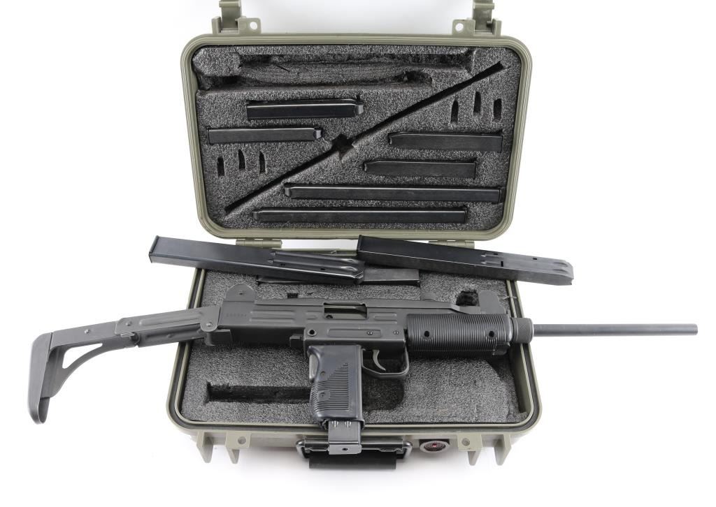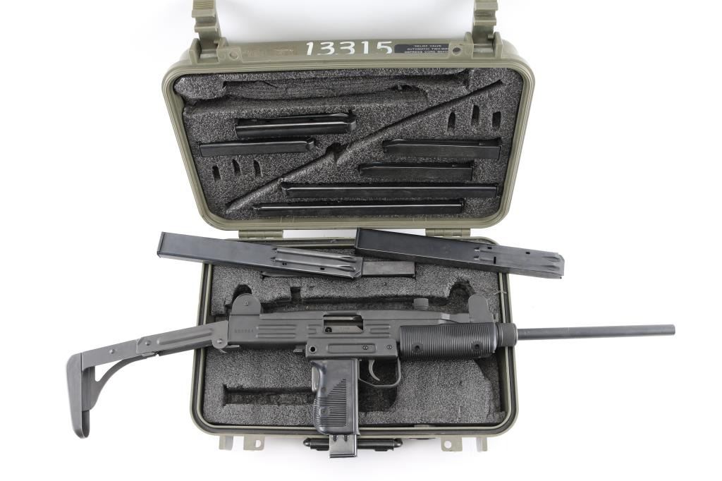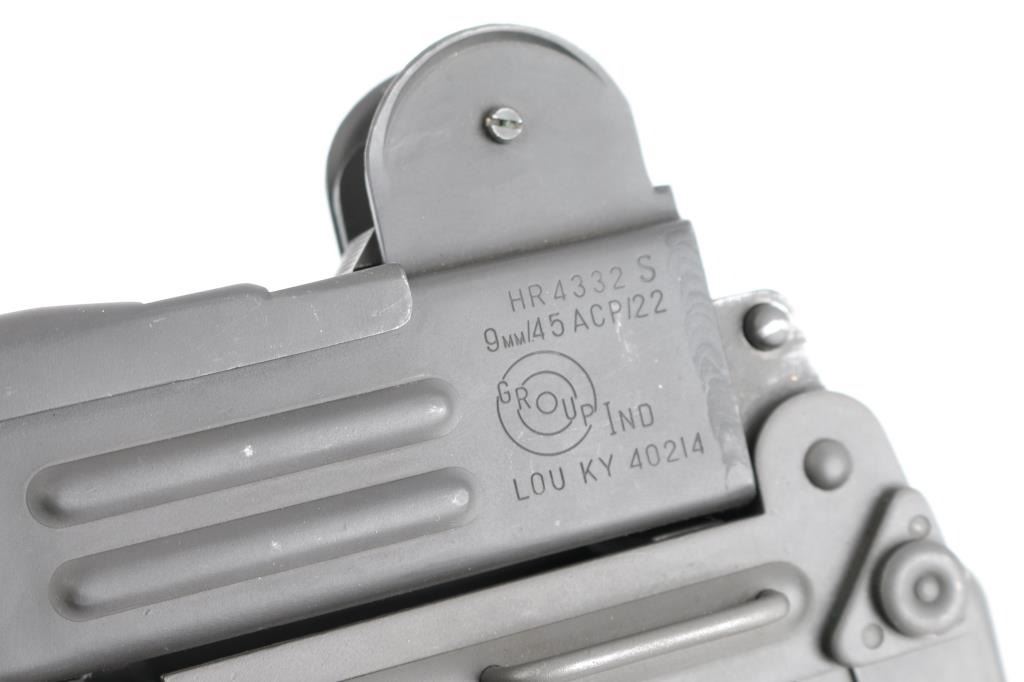 Semi-automatic. version of the classic Uzi sub gun. Manufactured by Vector Arms, Utah using original IMI parts. 16" round barrel, Adjustable front sight post, and 2 aperture rear flip sight for 100 & 200 yards. Both with sight protectors. Magazine well in grip. Gray phosphate finish, with black synthetic pistol grip, and forearm. Fold under stock. Left receiver marked, Vector Arms, NSL. UT. and Group Industries Model HR4332 markings. Includes four 22 round magazines, five 10 magazines, and one pre-ban IMI marked 16 round magazine. All contained in a US Army Military AN/PVS-7B Night Vision Goggles Lockable Carrying Case (15X12X6) with form fitted black styrofoam for the gun, barrel, and magazines. Bore is excellent/bright, action is smooth, finish has a couple of minor rubs.