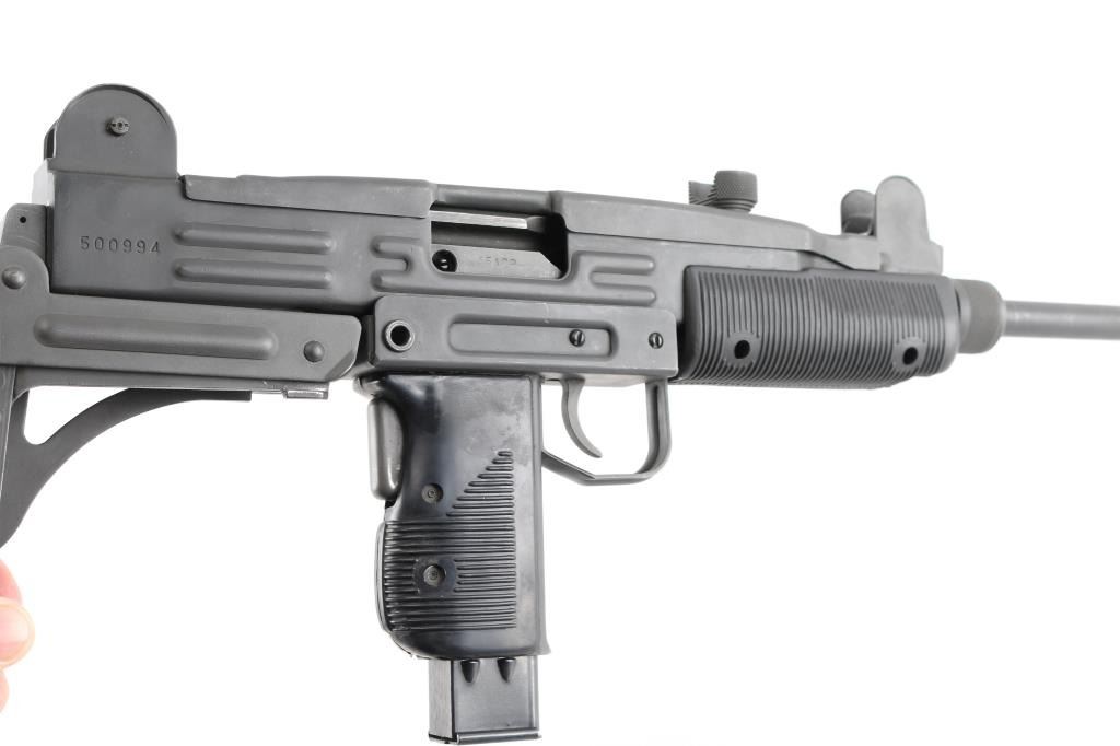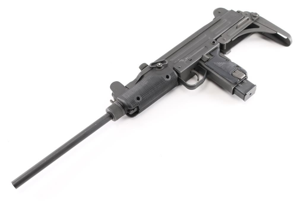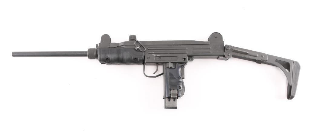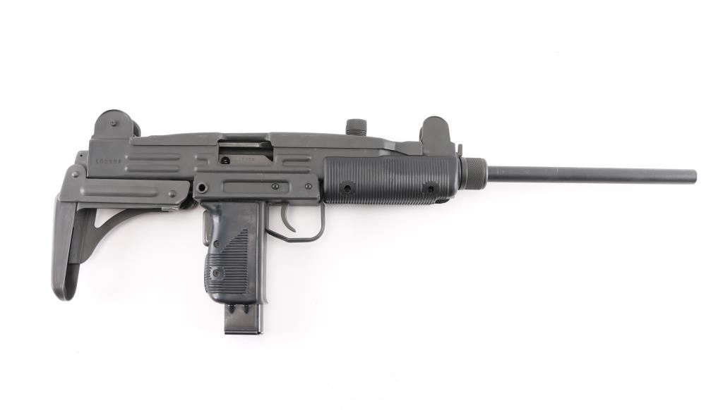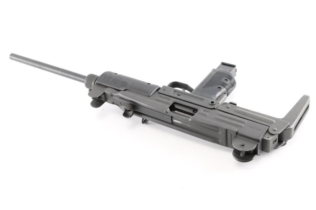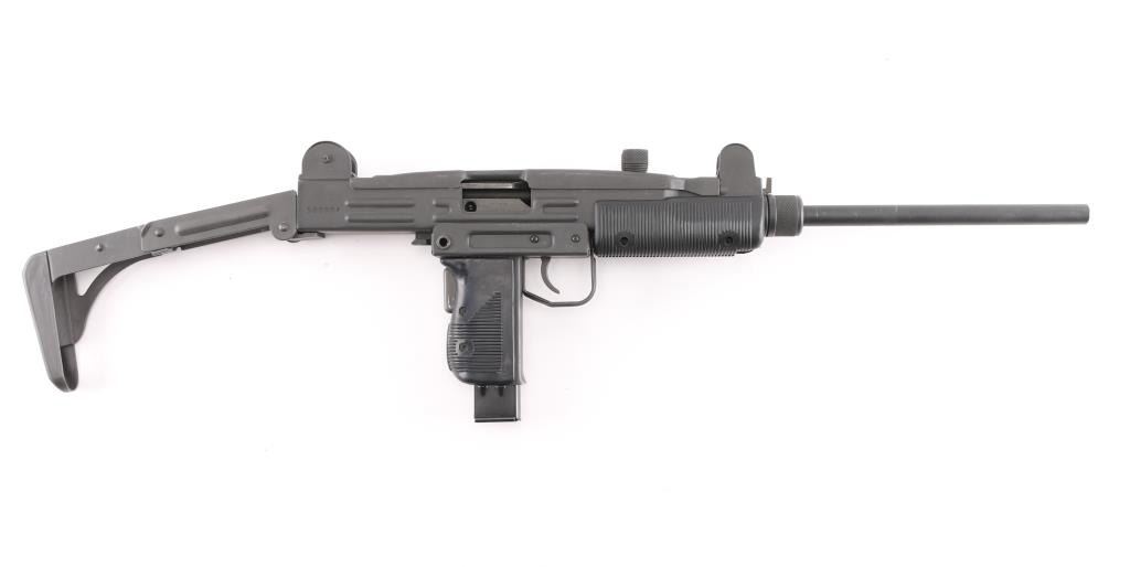 Semi-automatic. version of the classic Uzi sub gun. Manufactured by Vector Arms, Utah using original IMI parts. 16" round barrel, Adjustable front sight post, and 2 aperture rear flip sight for 100 & 200 yards. Both with sight protectors. Magazine well in grip. Gray phosphate finish, with black synthetic pistol grip, and forearm. Fold under stock. Left receiver marked, Vector Arms, NSL. UT. and Group Industries Model HR4332 markings. Includes four 22 round magazines, five 10 magazines, and one pre-ban IMI marked 16 round magazine. All contained in a US Army Military AN/PVS-7B Night Vision Goggles Lockable Carrying Case (15X12X6) with form fitted black styrofoam for the gun, barrel, and magazines. Bore is excellent/bright, action is smooth, finish has a couple of minor rubs.