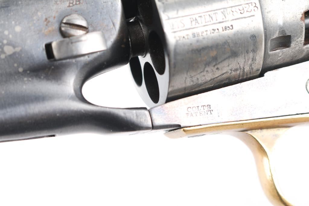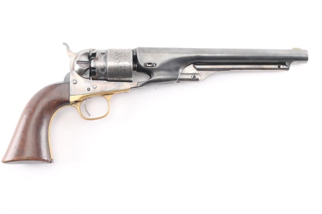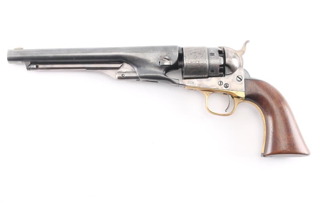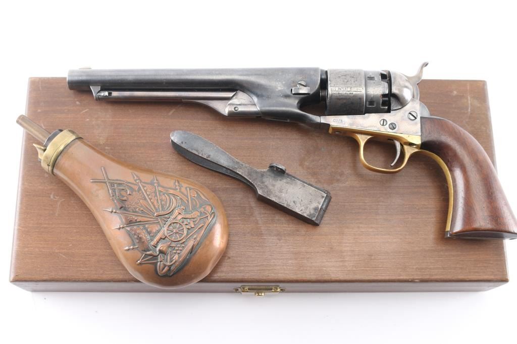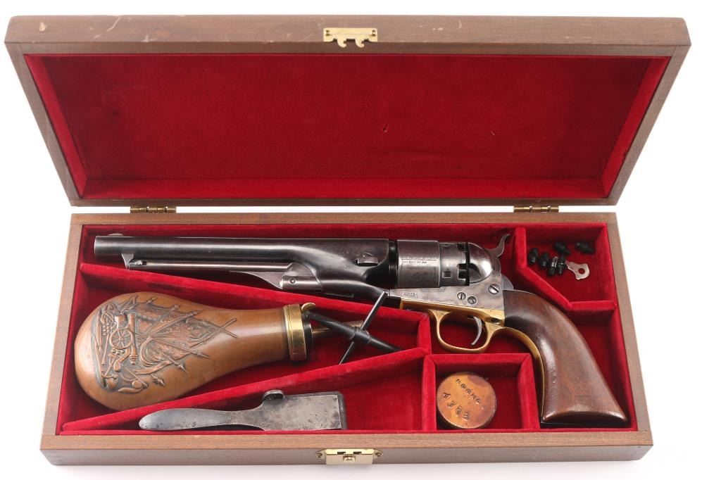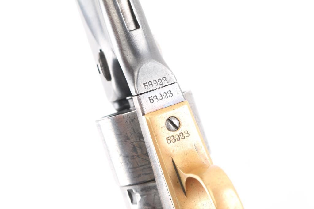 Single action percussion revolver. Shipped to Washington Arsenal c/o Lt. G.D. Ramsay on Aug 14, 1862 in a shipment of 1000 w/ blued finish & wood grips. The revolver shows approx 50% to 70% old arsenal refinish. Very good condition grip shows outlines of cartouches on both sides. Traces of case hardening on frame and lever. Good markings, about 30% to 40% fight scene on cleaned cylinder. Address is light but visible. Good frame markings. "ST" stamped on bottom of grip frame. Tight action and matching visible numbers. A reproduction case, flask, & nipple wrench are included, as well as a fair condition original mold. Factory letter is included.
