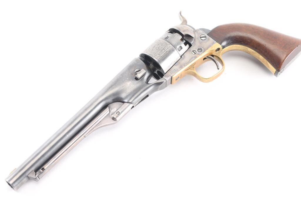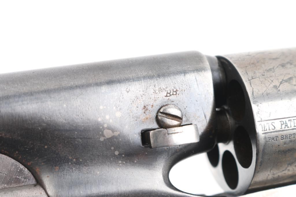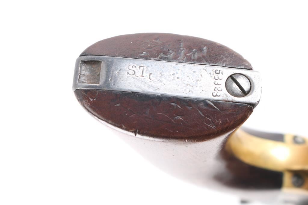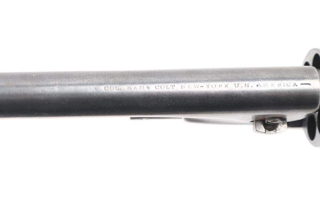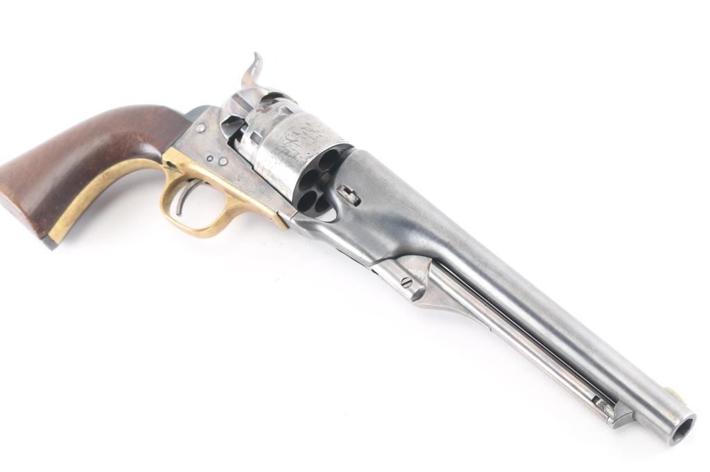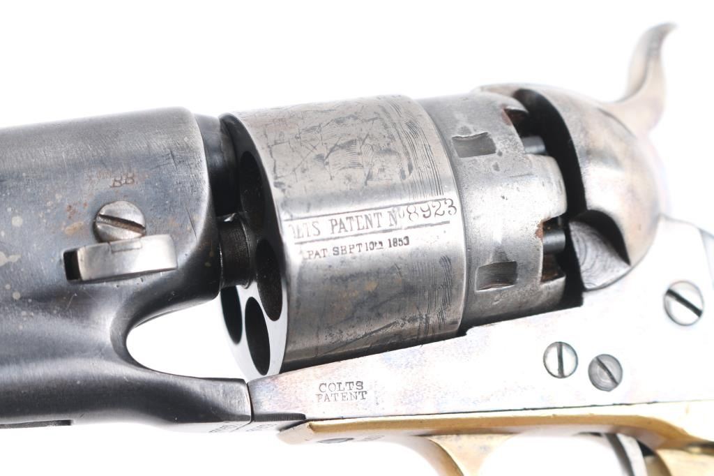 Single action percussion revolver. Shipped to Washington Arsenal c/o Lt. G.D. Ramsay on Aug 14, 1862 in a shipment of 1000 w/ blued finish & wood grips. The revolver shows approx 50% to 70% old arsenal refinish. Very good condition grip shows outlines of cartouches on both sides. Traces of case hardening on frame and lever. Good markings, about 30% to 40% fight scene on cleaned cylinder. Address is light but visible. Good frame markings. "ST" stamped on bottom of grip frame. Tight action and matching visible numbers. A reproduction case, flask, & nipple wrench are included, as well as a fair condition original mold. Factory letter is included.