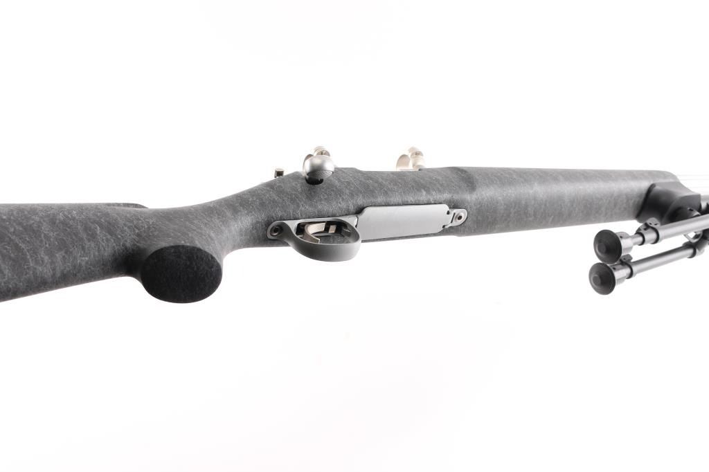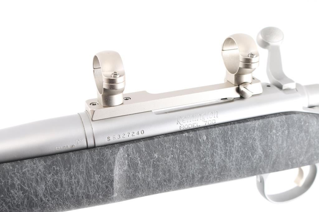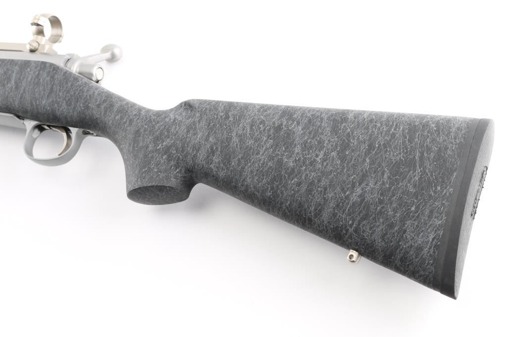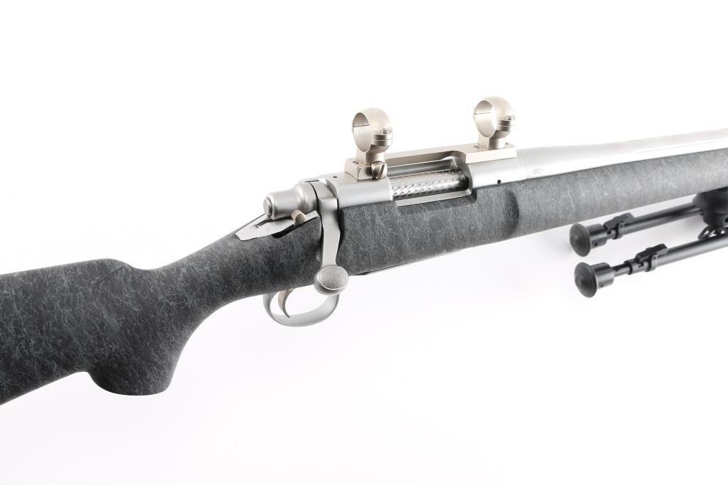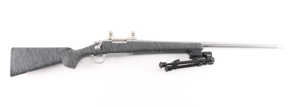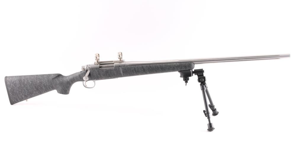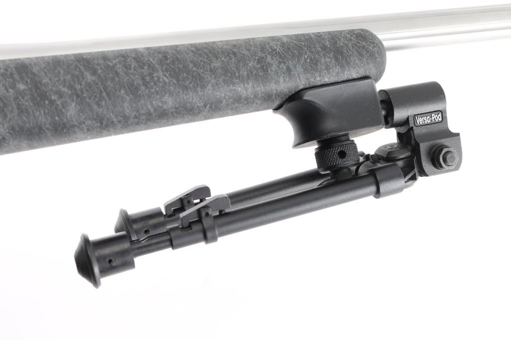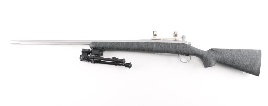 Bolt action target or varmint rifle features stainless steel construction, black composite stock with gray drizzle highlights, 24" fluted heavy barrel, hinged floorplate, manual safety, sling studs, solid rubber Remington marked butt pad, Leupold stainless one piece base with rings (no optic). Stock is a high quality composite, similar to H-S Precision or other better quality stocks. Bore is very good condition. Matte stainless finish is very good with few small blemishes. Stock is near perfect. Includes a folding adjustable Versa-Pod bipod (with integral hand stop and QD socket with installed sling swivel).