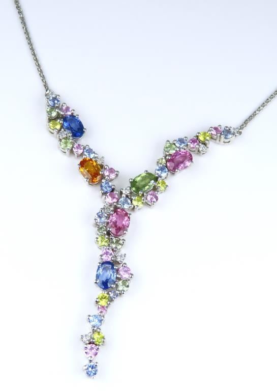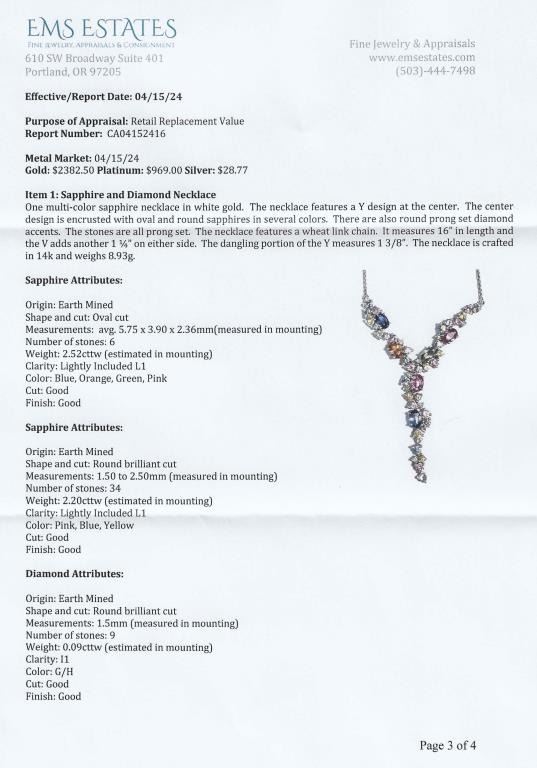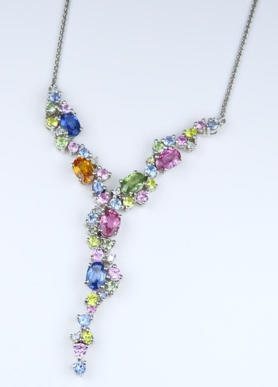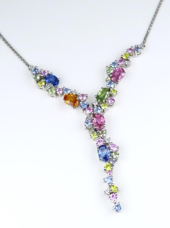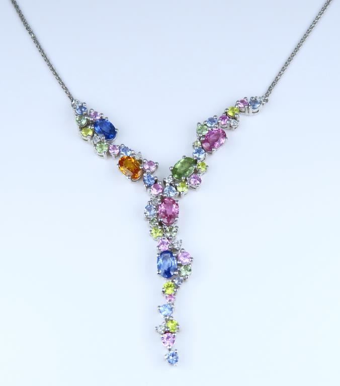 Necklace featuring 40 natural oval and round cut Sapphires in Blue, Pink, Orange, Green and Yellow accented with 9 Diamonds with a total Gem weight of approx. 4.81 carats. Gems are set in a beautiful cascading design impeccably crafted in 14 karat white gold. Full Retail Appraisal - $10,000.00