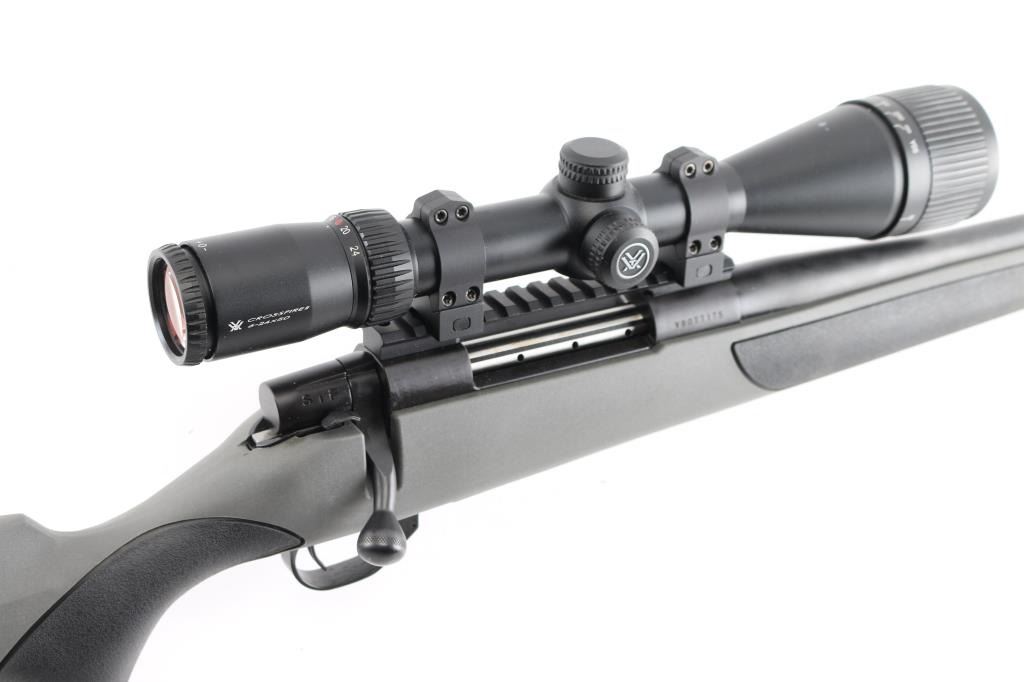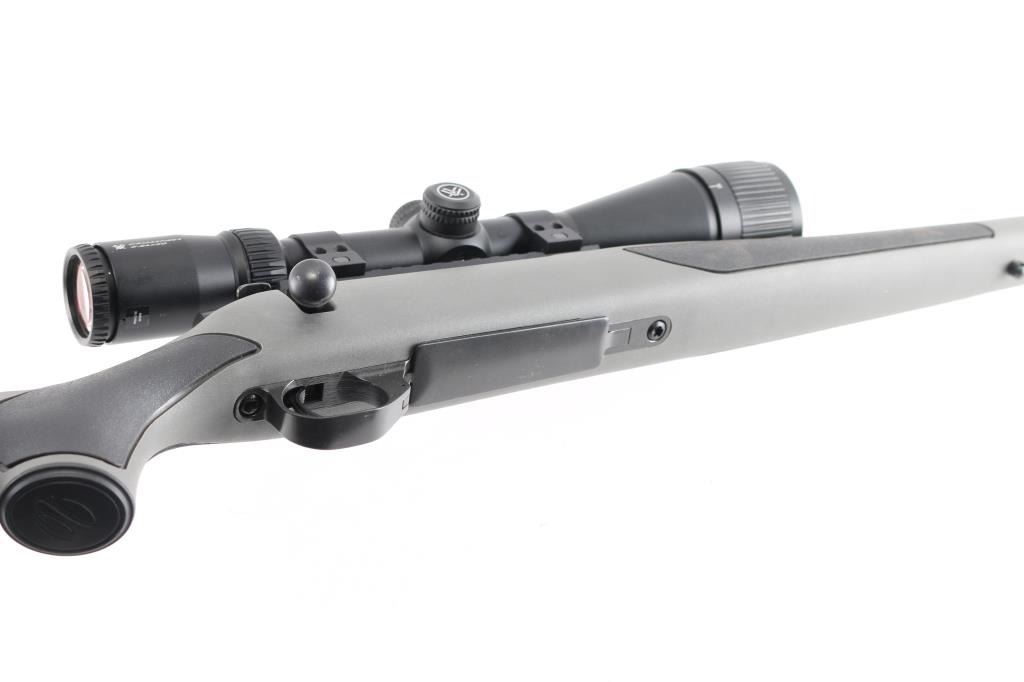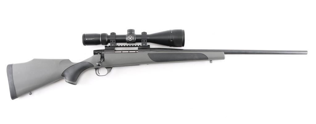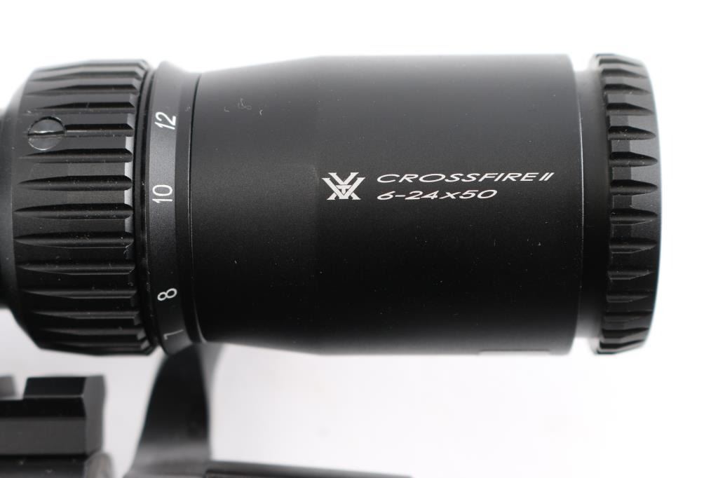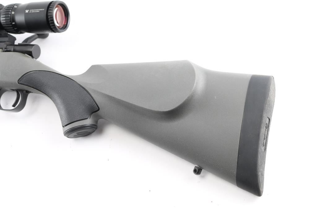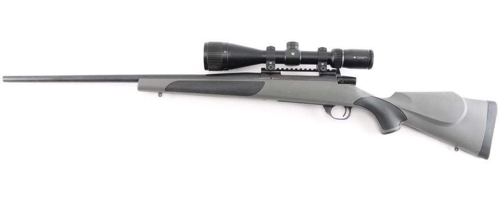 SN: VB07717. Japanese made bolt action rifle imported by Weatherby. Features matte blue finish, 24" barrel, no sights, manual safety, hinged floorplate, sling studs, solid rubber recoil pad, right hand cheek piece. Green polymer stock with black rubber inserts on grip, & forearm. Mounts a very good condition Vortex Crossfire II 6-24x50 scope, clear view. Bore is pristine. Retains 98% finish, with a minor scratch on floorplate. Stock is near excellent, with a few very minor scratches.