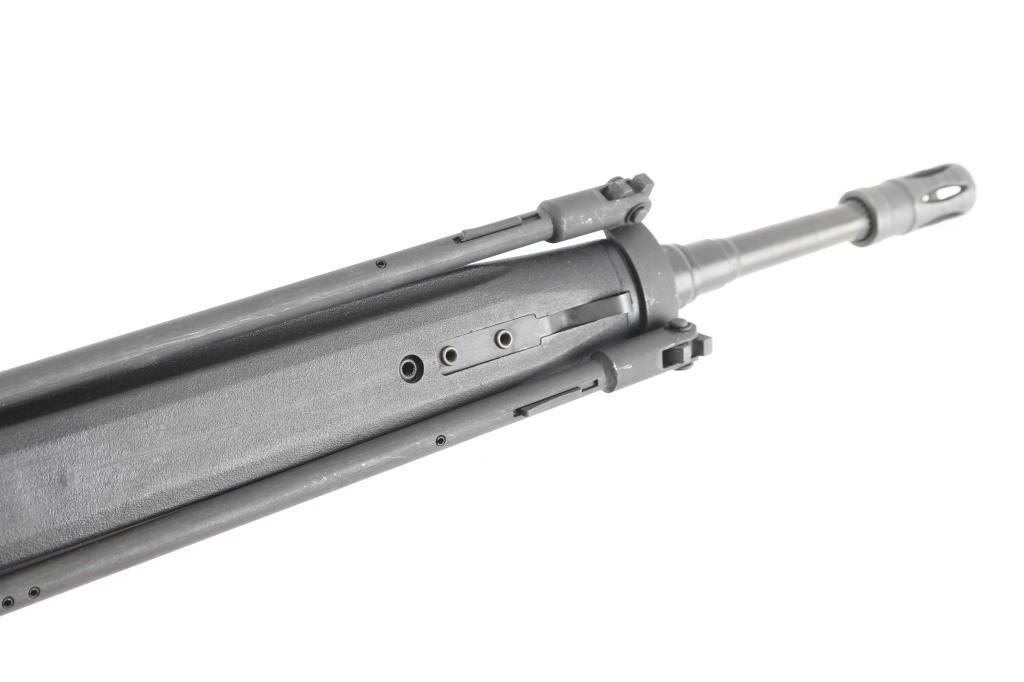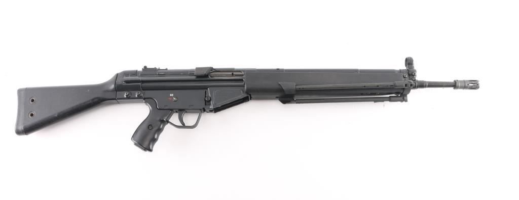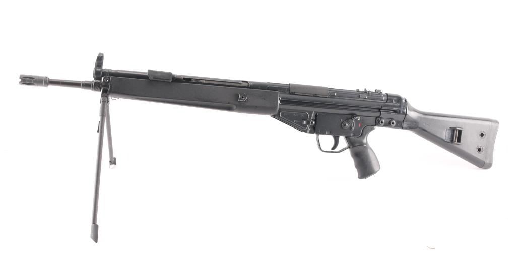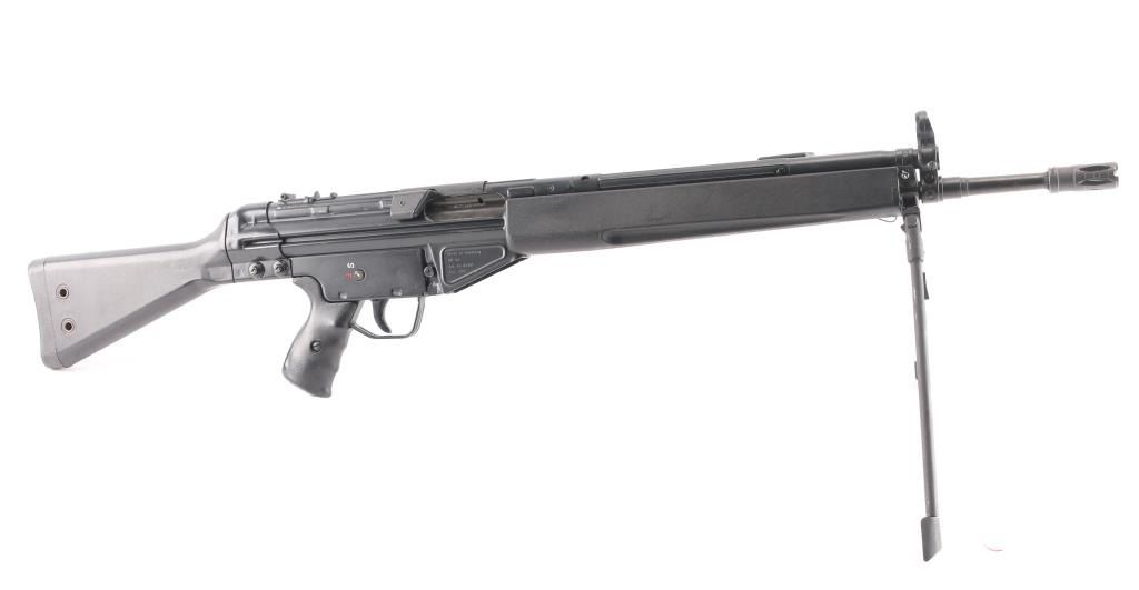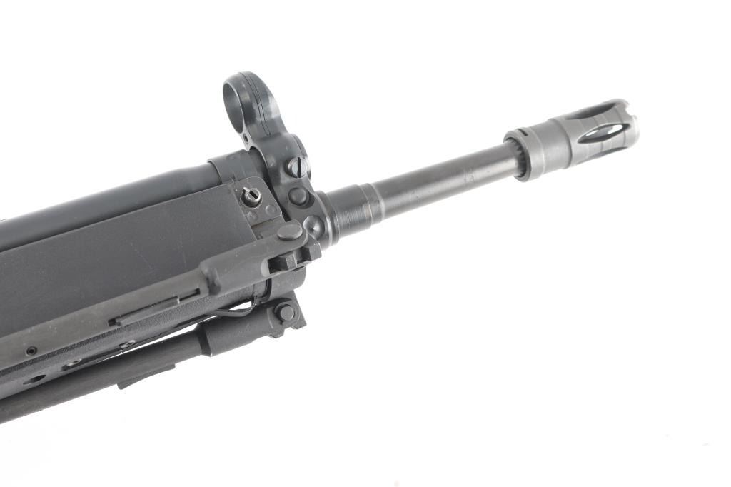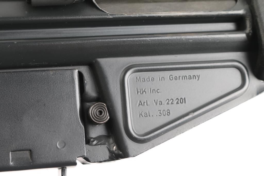 German semiautomatic rifle chambered in 308 Winchester, imported by HK Inc, Arlington VA. Manufactured circa 1979. Features a dark grey/black finish, black plastic furniture, protected post front sight, rear sight removed (missing), manual safety, threaded muzzle with flash suppressor, 17.7" barrel. Charging lever is replaced with an oversized aftermarket part, original part is included. Has folding bipod and an ejection port buffer installed. Bore is excellent. Finish is 95% with some scratches and edge losses. Plastic furniture is excellent condition with minor handling marks. Includes two aluminum bodied 20 round magazines.