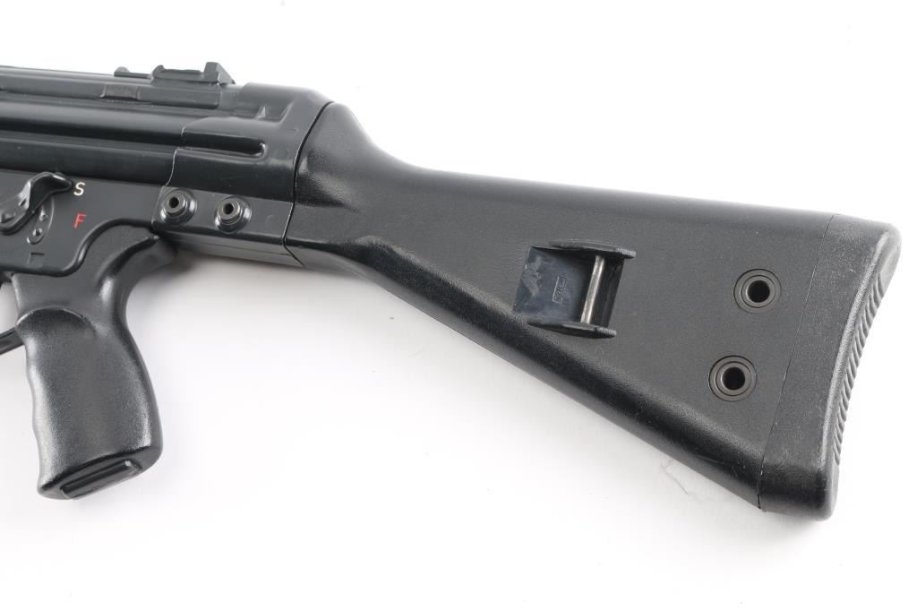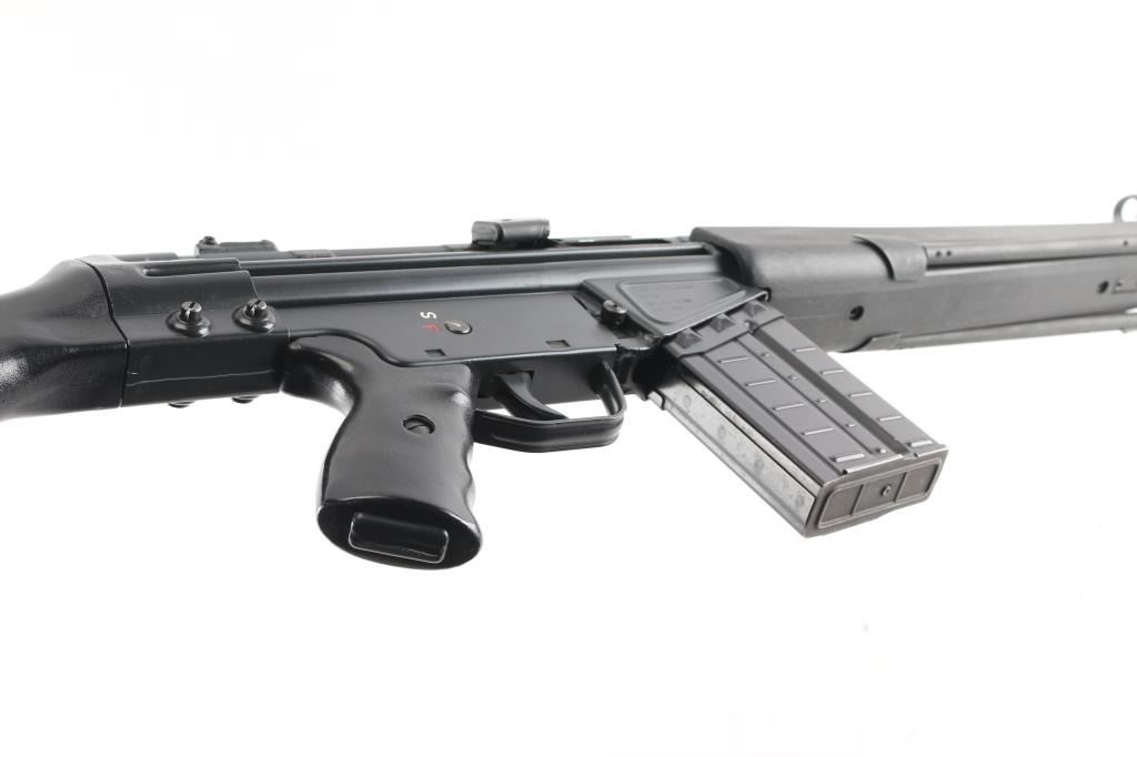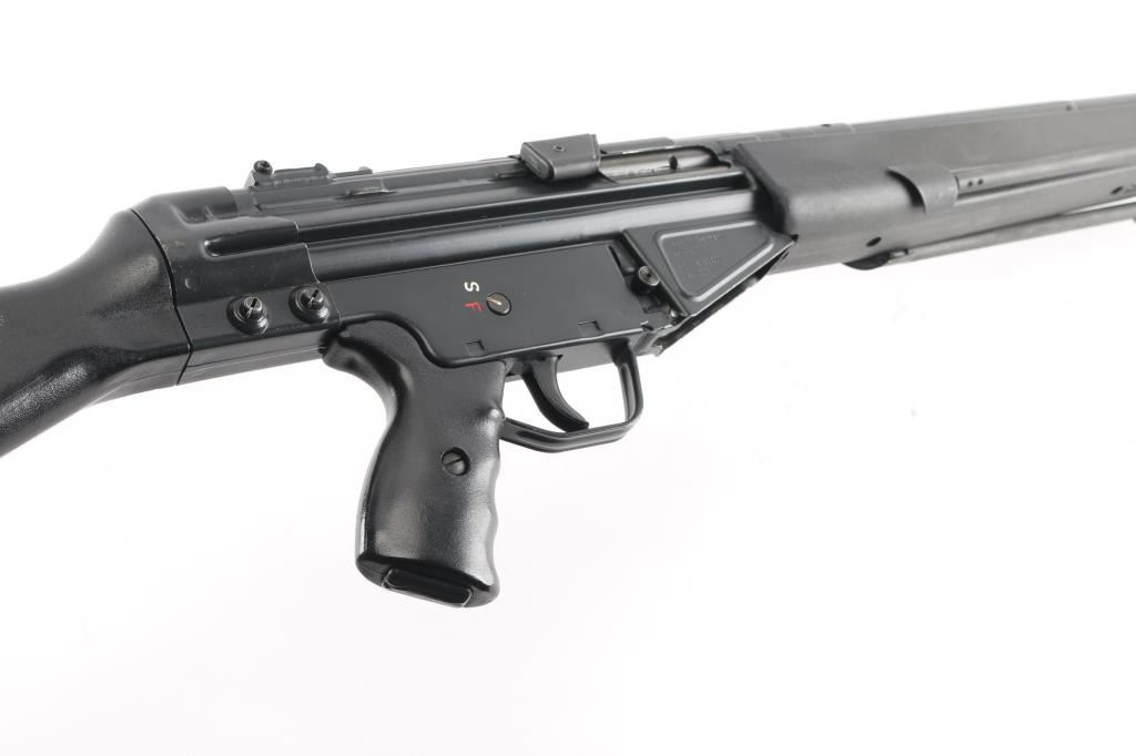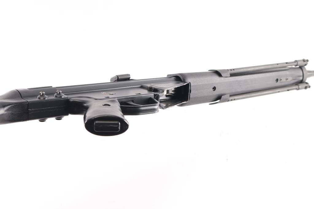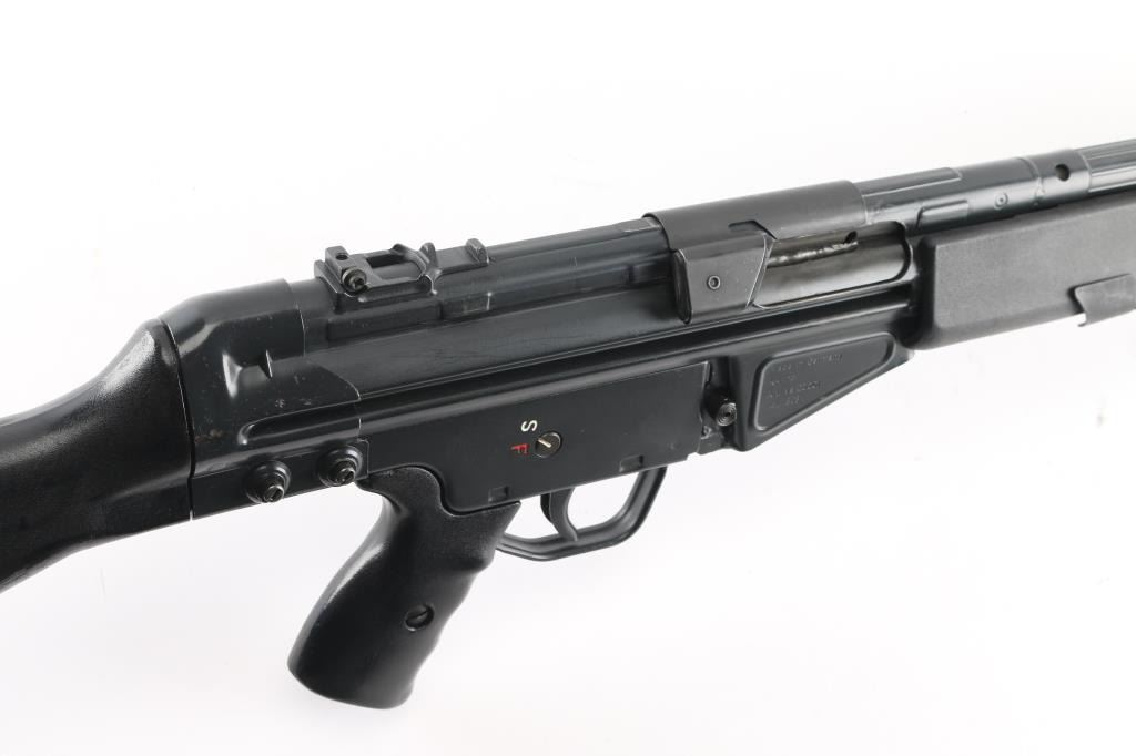 German semiautomatic rifle chambered in 308 Winchester, imported by HK Inc, Arlington VA. Manufactured circa 1979. Features a dark grey/black finish, black plastic furniture, protected post front sight, rear sight removed (missing), manual safety, threaded muzzle with flash suppressor, 17.7" barrel. Charging lever is replaced with an oversized aftermarket part, original part is included. Has folding bipod and an ejection port buffer installed. Bore is excellent. Finish is 95% with some scratches and edge losses. Plastic furniture is excellent condition with minor handling marks. Includes two aluminum bodied 20 round magazines.