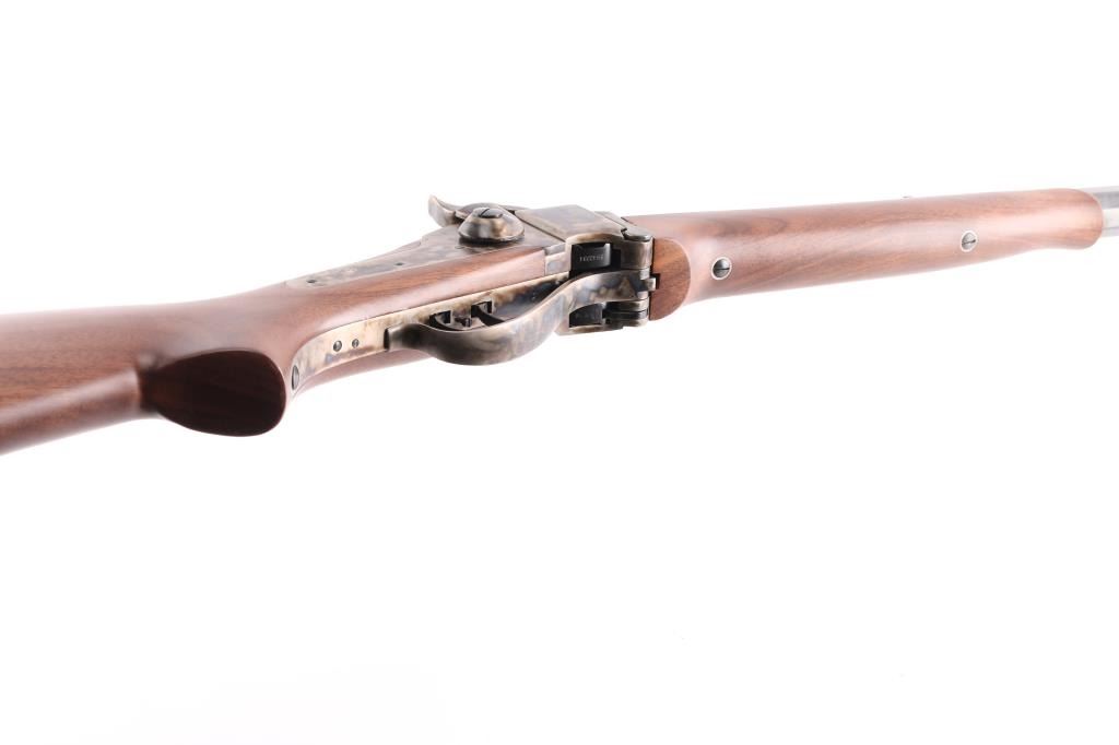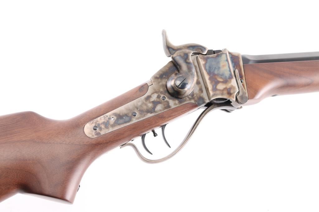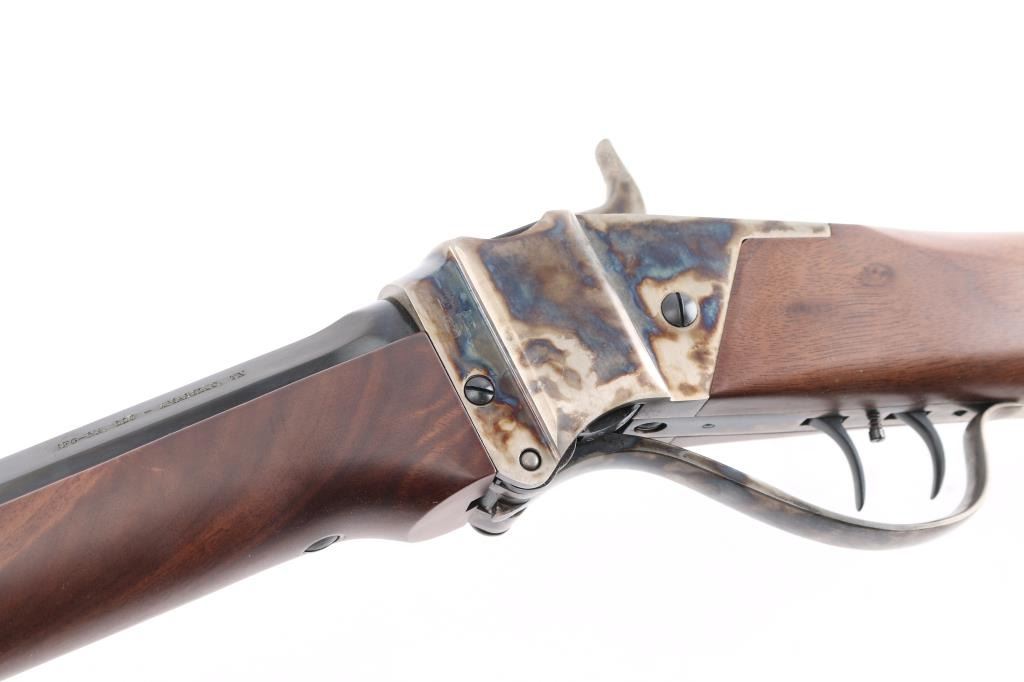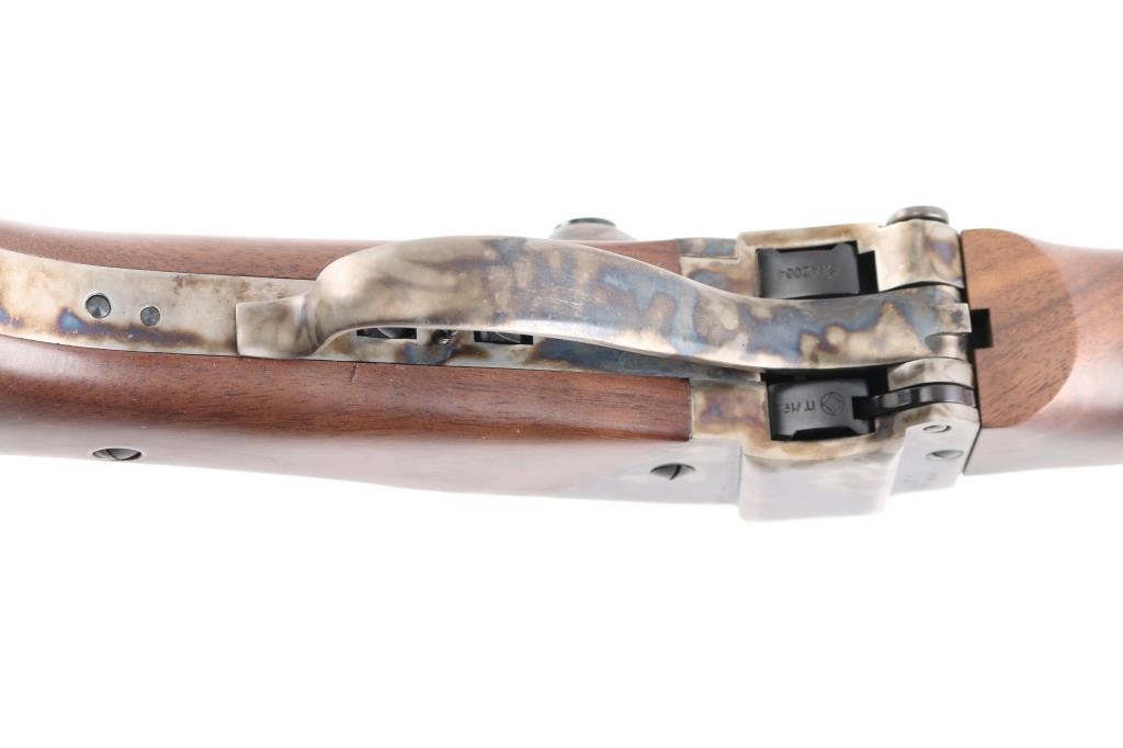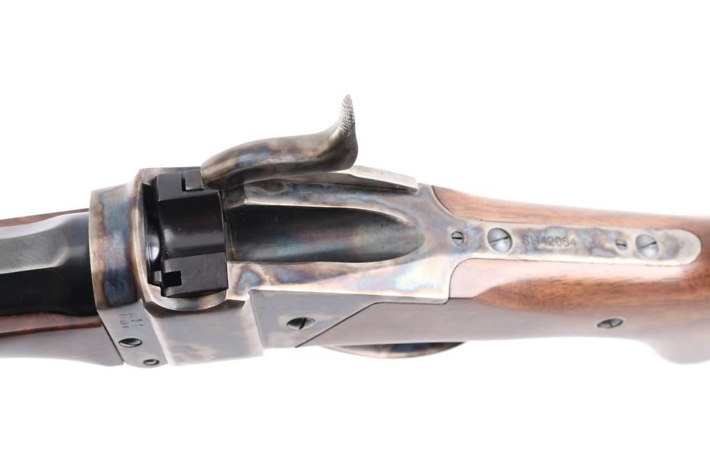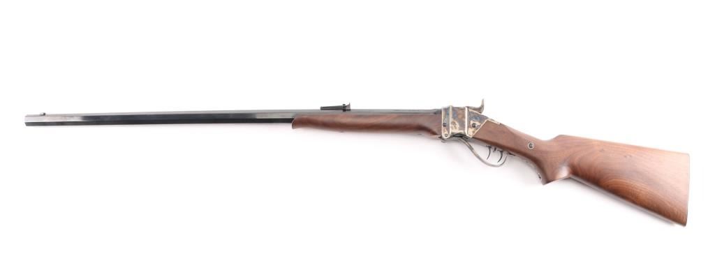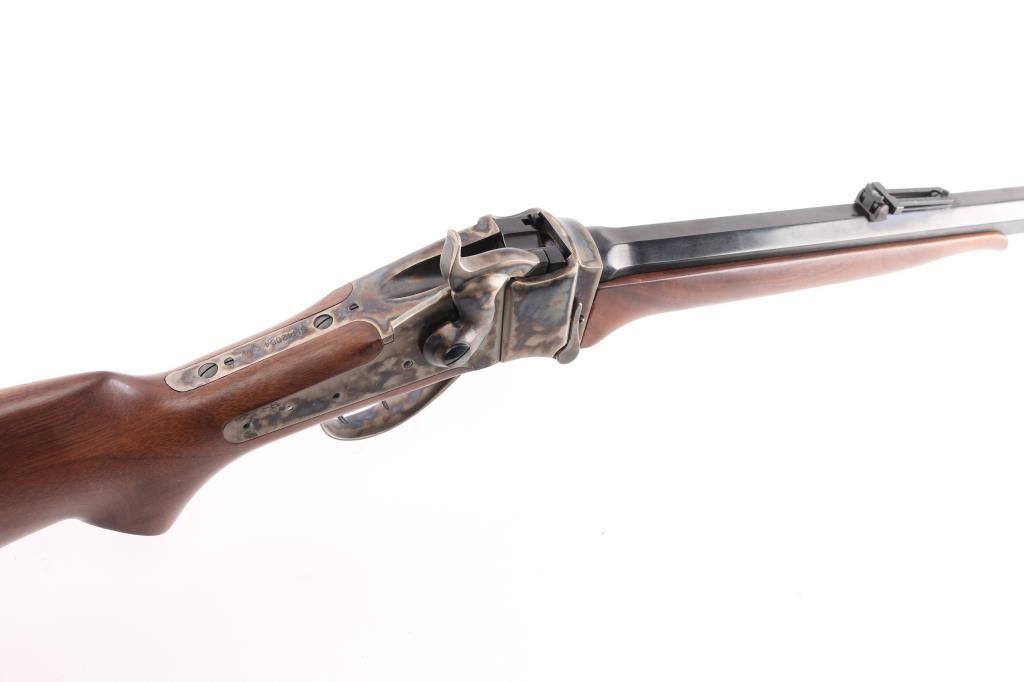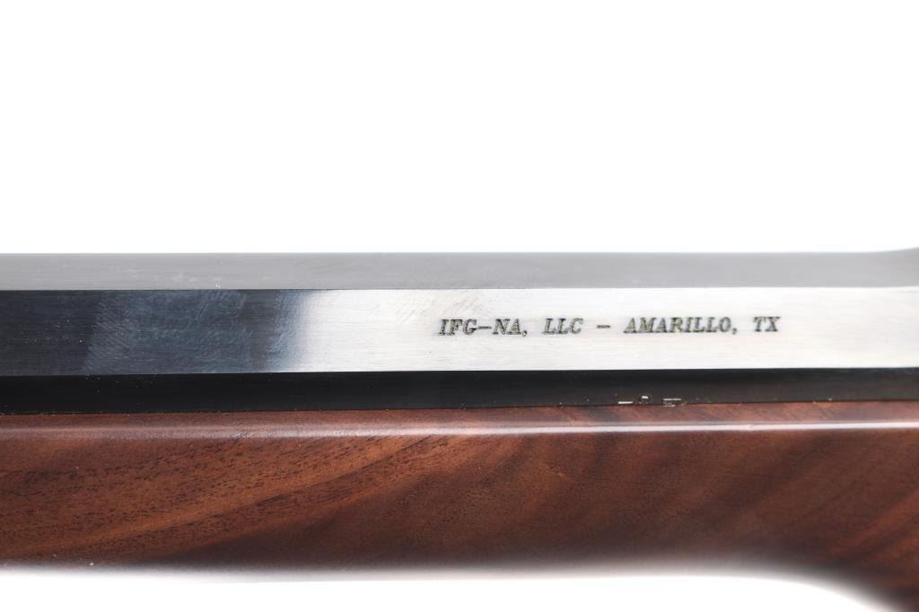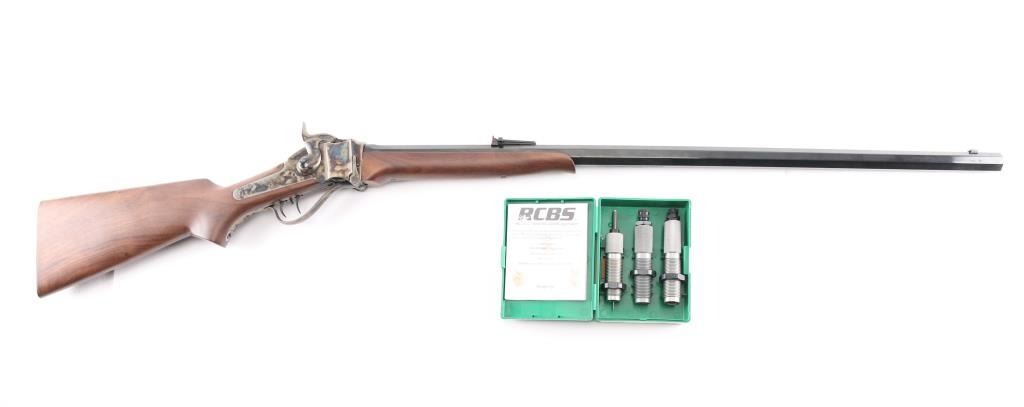 Made in Italy, imported by IFG-NA, Amarillo, TX. This is a reproduction of the Sharps 1852 Long range rolling block rifle. Manufactured 2020. ( Italian date code CZ) It has a blued 32" octagon barrel, Case colored receiver, lever, and tang. It has a nickel blade front sight with, a ladder rear sight. It has very nice smooth wood stocks with a schnabel forend, double set triggers. Bore is pristine. Metal finish and wood stocks are excellent. Tight lock-up. Like new condition. Comes with a RCBS 3 die steel 45-90 2.4 Sharps set, and a fringed leather rifle Scabbard. Black powder only.