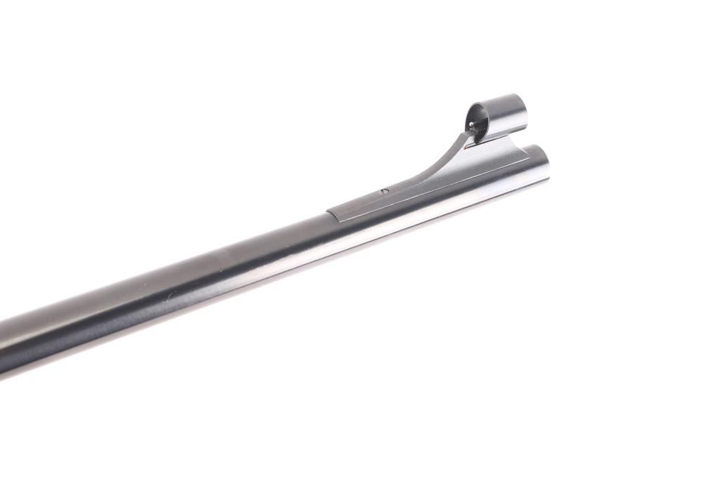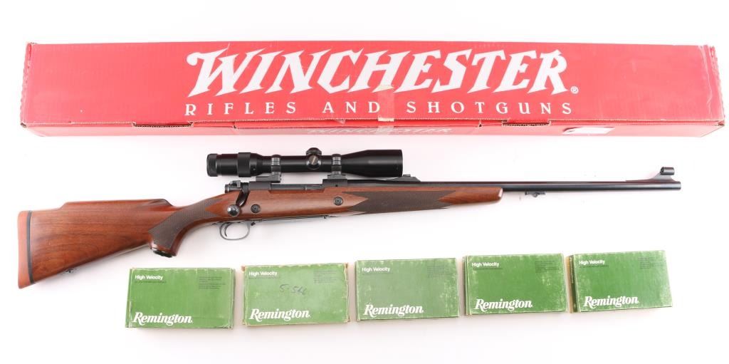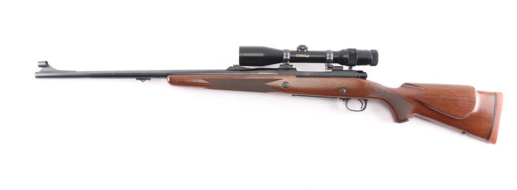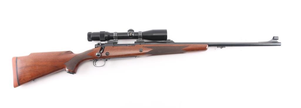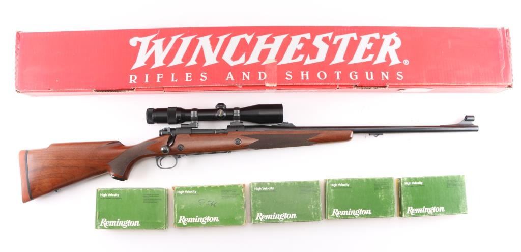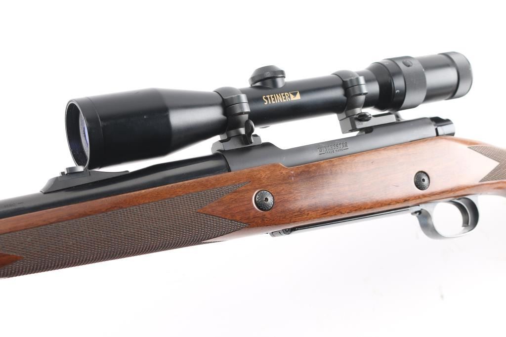 SN: G152180 "Classic" controlled round feed bolt action Safari Magnum rifle. Features blued finish (bright polished blue on most metal, receiver is matte blue), walnut stock with checkered panels at wrist & forend, right hand cheekpiece, solid rubber recoil pad (13-3/8" LoP), 24" barrel with sling swivel stud soldered to bottom, dual steel recoil cross bolts, ramp front sight base with bead top blade in dovetail & hood, island type express rear sight mid barrel with folding adjustable leaf, hinged floorplate, three position safety, rear swivel stud. Two piece lever throw quick detach bases mount a Steiner "Penetrator Infrared" 1.5-6x42mm scope with "7B" (Euro type duplex) reticle. This scope is designed with optics coatings that maximize transmission of light in the red part of the spectrum, to assist in identifying game animals and reducing the visibility of green foliage. Bore is very good condition. Metal retains 90% finish with handling marks, some edge losses, some scratches. Stock is very good condition with few small scratches and dents. Recoil pad is very good. Floorplate marked "SUPER EXPRESS". Includes original Winchester & Steiner boxes, approx 100 rds Remington factory ammo in factory boxes.