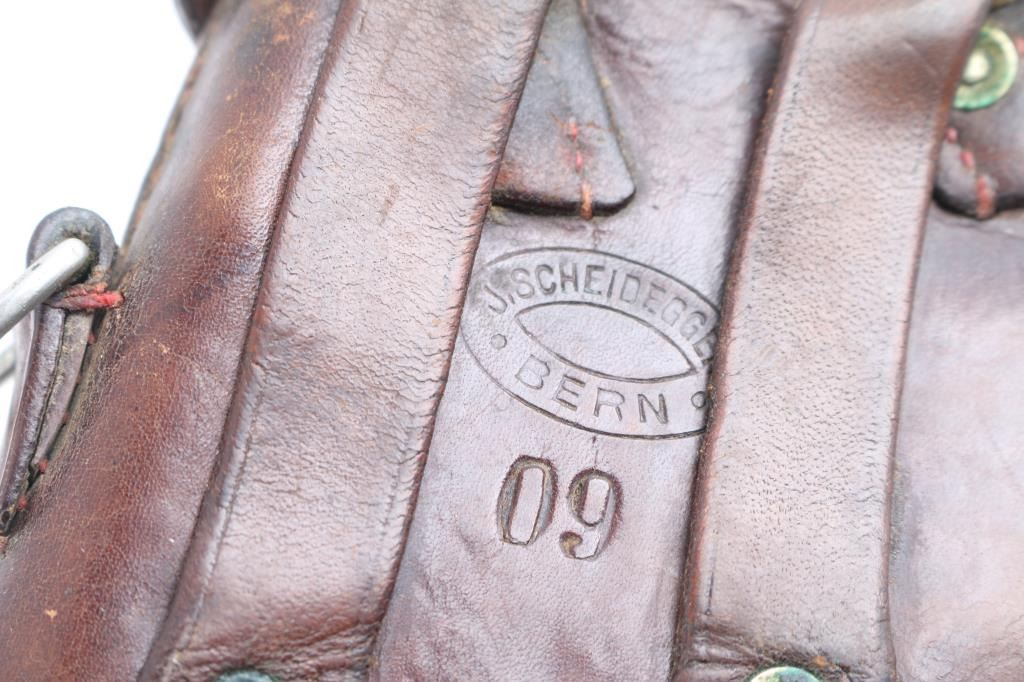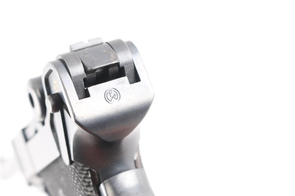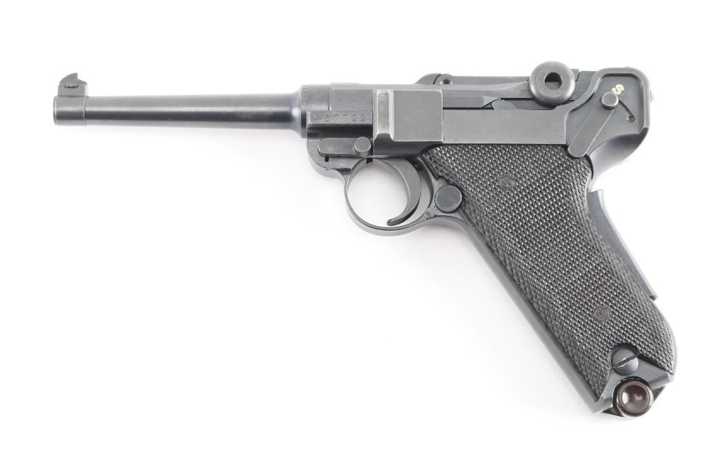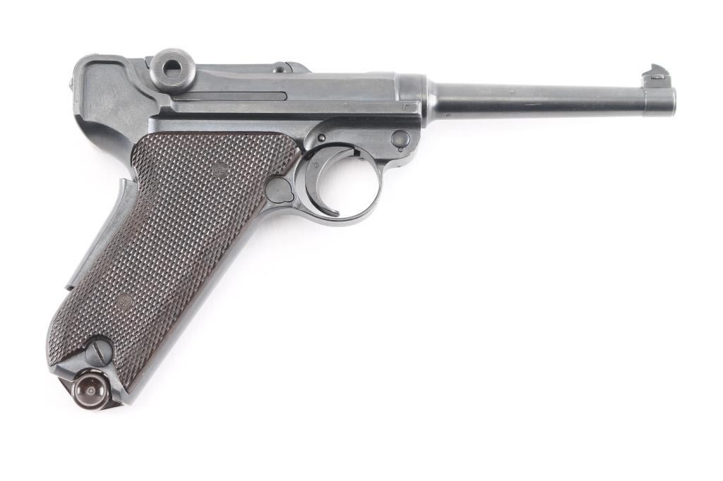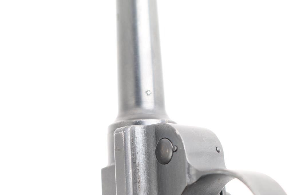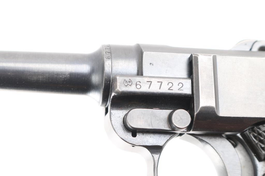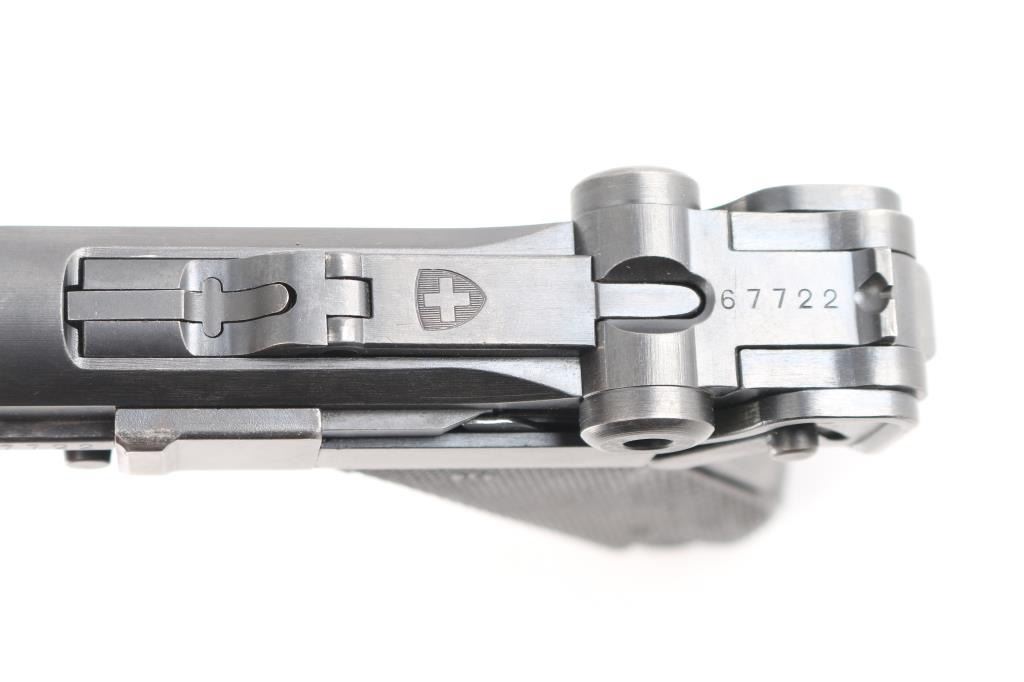 SN: 67722. This is an excellent example of a late 1929 Swiss Military contract Luger made at the factory in Bern. This model has the distinctive, straight grip frame angle with the grip safety and fast taper profile barrel of the Swiss Lugers. It also has serrated toggle knobs, with the "S" marked upper safety area highlighted in white. This specific serial number falls into the early military contract serial number range (50001-77941) and lacks the commercial "P" serial number prefix. The left side of the frame rails has the small "k/+" Swiss Army inspection and or acceptance proof inside the stylized "W" along with the a "F/+" proof on the back side of the frame, and on the left frame. The top of the front toggle has the correct military Swiss Cross in a Shield logo with the full serial number stamped on the rear portion of the toggle assembly, frame & barrel. These Lugers have the distinctive dark brown, checkered plastic grips with the mold numbers/marks on the outside of each grip panel. These Lugers have a dark almost flat rust blued finish and it is fitted with a correct nickel plated magazine with the dark brown plastic base. The back of the magazine body has the small script "P" proof, and a bakelite base. "P" is stamped on the front of the frame, indicating release from military inventory, and the underside of the frame bears the import markings "C.K.C. Ports, OH". Very Faint/Discreet. Comes in a Swiss brown leather military holster stamped "J. Scheidegger, Bern", and "09" Bore is excellent, overall excellent, with a very minor scratch, and ding on the right barrel. Holster is very good/sound.