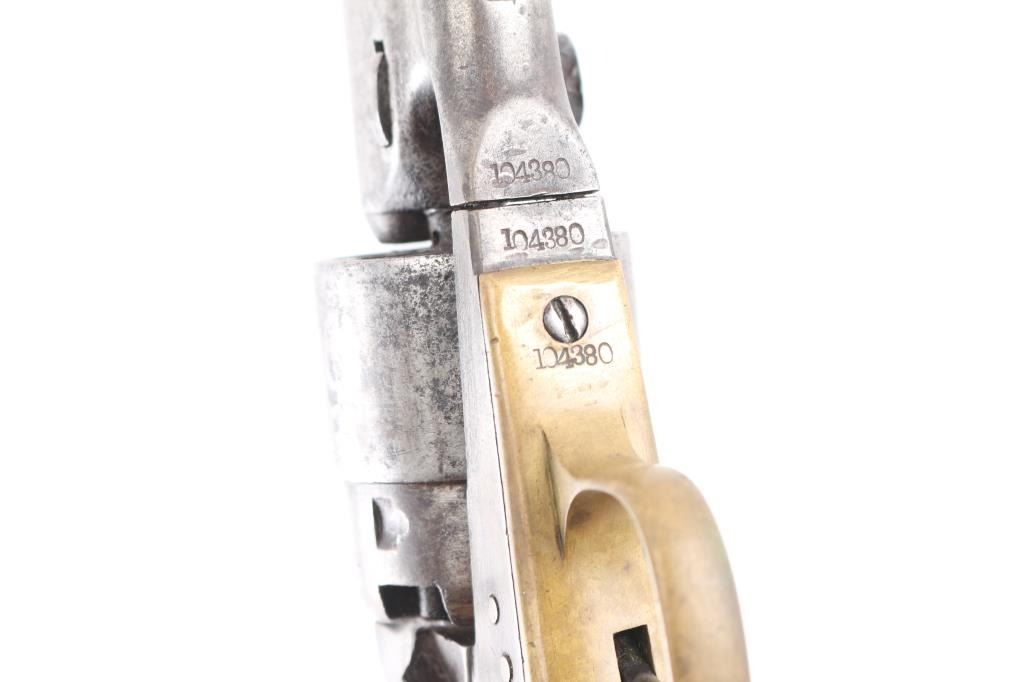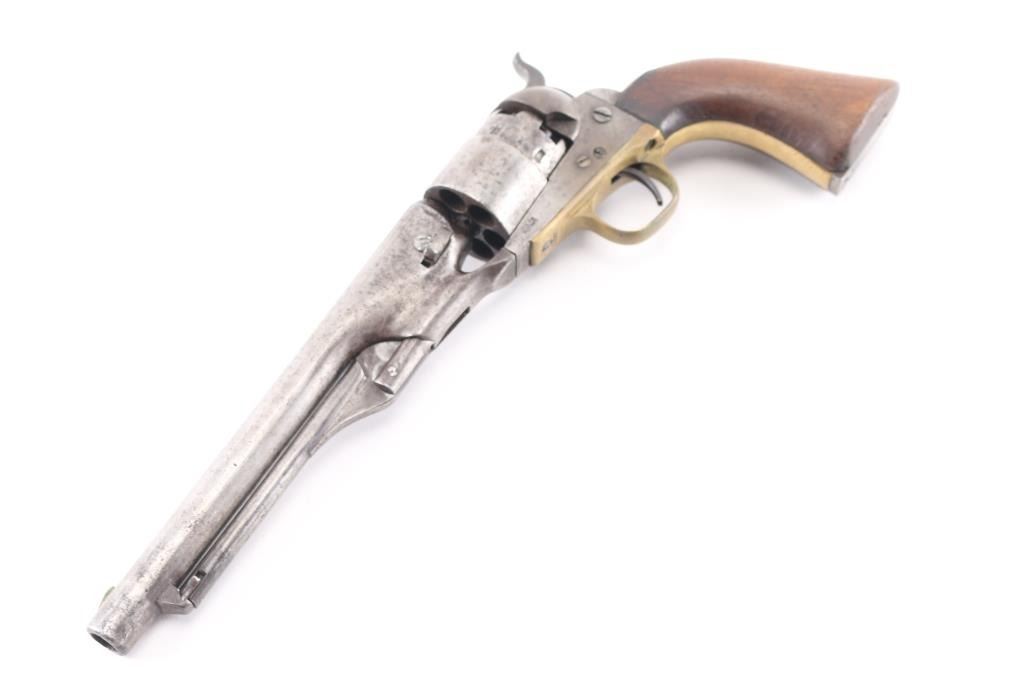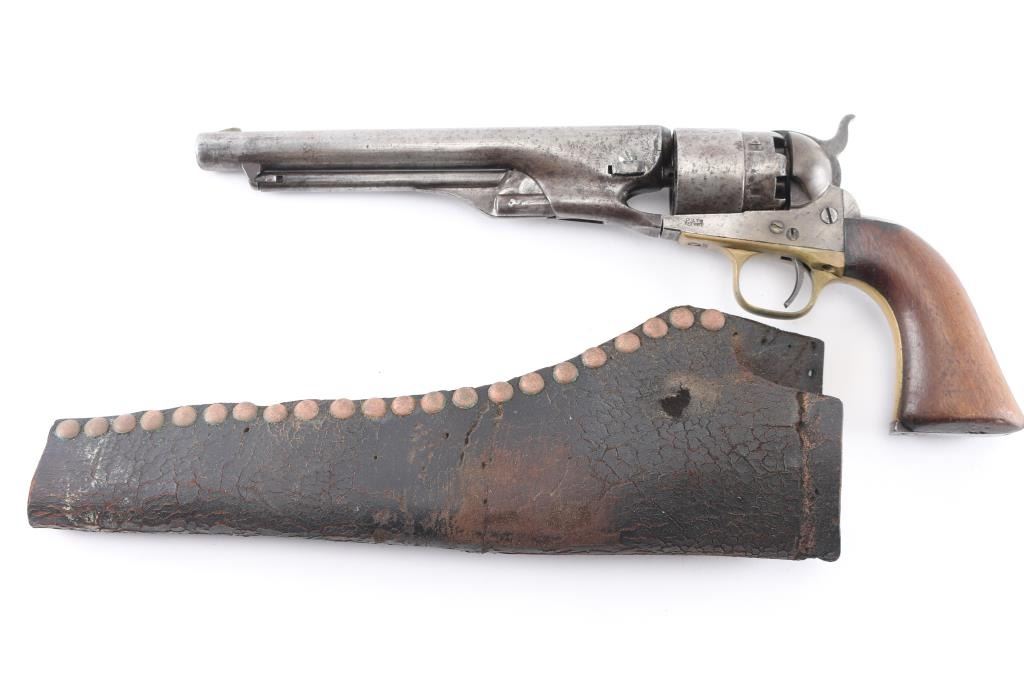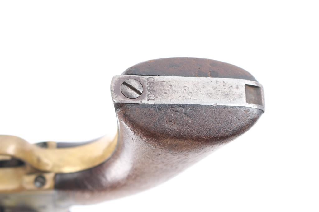 Single action cap and ball black powder percussion revolver, manufactured circa 1863. 8" barrel, blade front sight, "V" notch rear sight on hammer nose, 6 shot unfluted rebated cylinder, round brass triggerguard, steel back strap, one piece smooth walnut grip. Bore is poor to fair, visible rifling, light rust throughout. Charge holes show slightly rough texture. Metal surfaces show mottled dark grays and lighter bare metal tones, tiny pits throughout, appears lightly cleaned at some point in the past. Numbers match on frame, barrel, straps. Faint "380" and partial patent date on cylinder, cylinder scene absent. Barrel a bit loose to frame. Some screws appear to be replacements. Action sound with good lock-up. Grips are good, eroded at points of toe & heel, good fit to frame. Includes a poor to fair condition brown leather "slim jim" type belt holster, brass or copper rivets along seam, no loops or straps, cracked, small hole visible in the frame area.