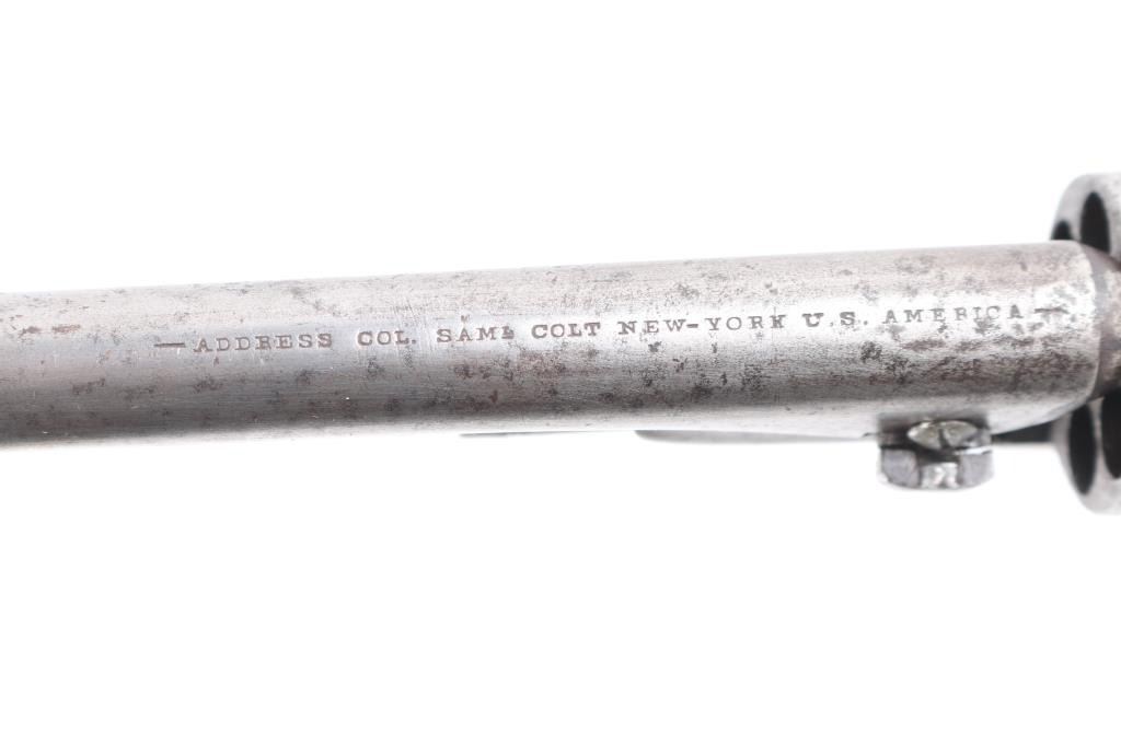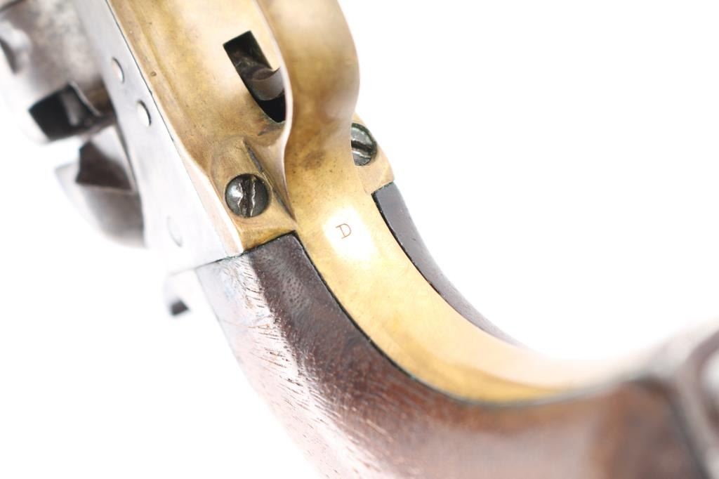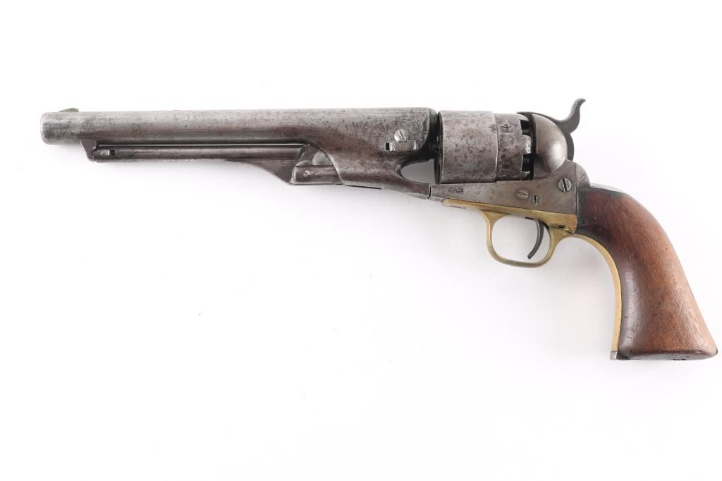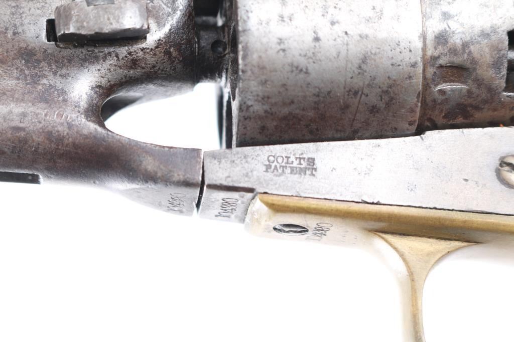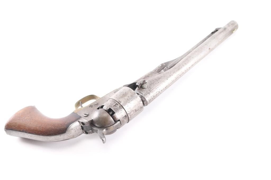 Single action cap and ball black powder percussion revolver, manufactured circa 1863. 8" barrel, blade front sight, "V" notch rear sight on hammer nose, 6 shot unfluted rebated cylinder, round brass triggerguard, steel back strap, one piece smooth walnut grip. Bore is poor to fair, visible rifling, light rust throughout. Charge holes show slightly rough texture. Metal surfaces show mottled dark grays and lighter bare metal tones, tiny pits throughout, appears lightly cleaned at some point in the past. Numbers match on frame, barrel, straps. Faint "380" and partial patent date on cylinder, cylinder scene absent. Barrel a bit loose to frame. Some screws appear to be replacements. Action sound with good lock-up. Grips are good, eroded at points of toe & heel, good fit to frame. Includes a poor to fair condition brown leather "slim jim" type belt holster, brass or copper rivets along seam, no loops or straps, cracked, small hole visible in the frame area.