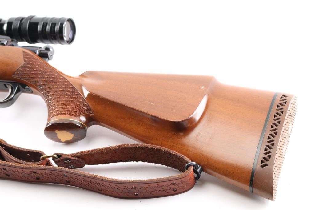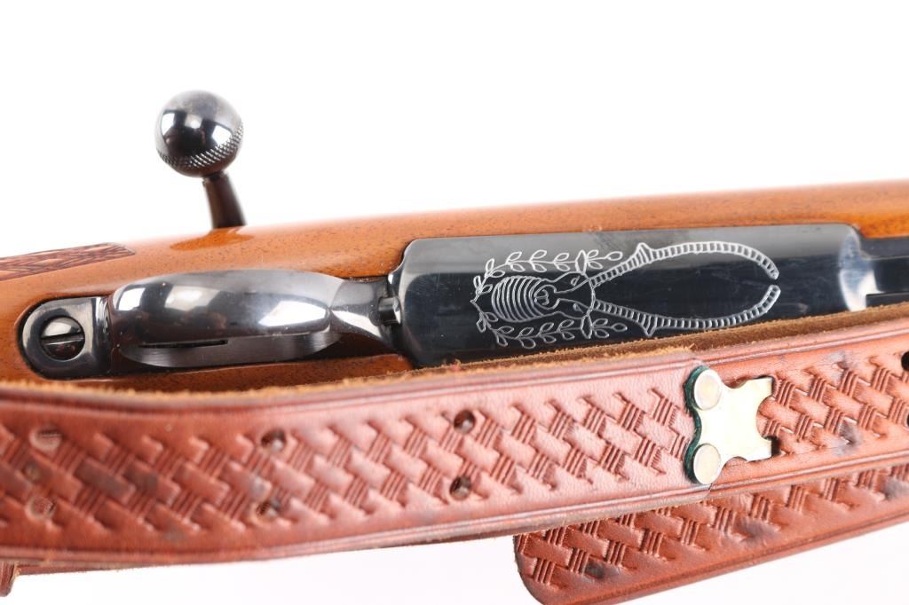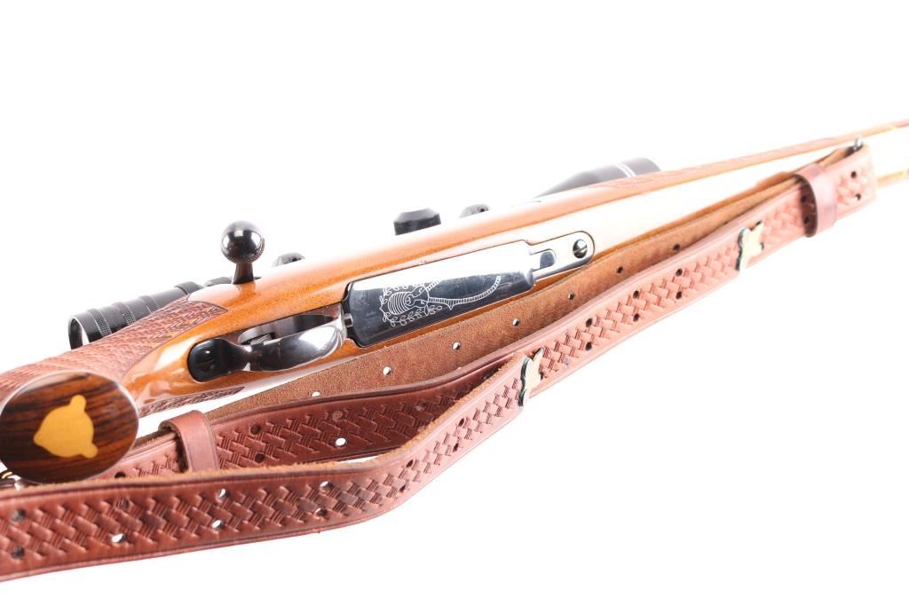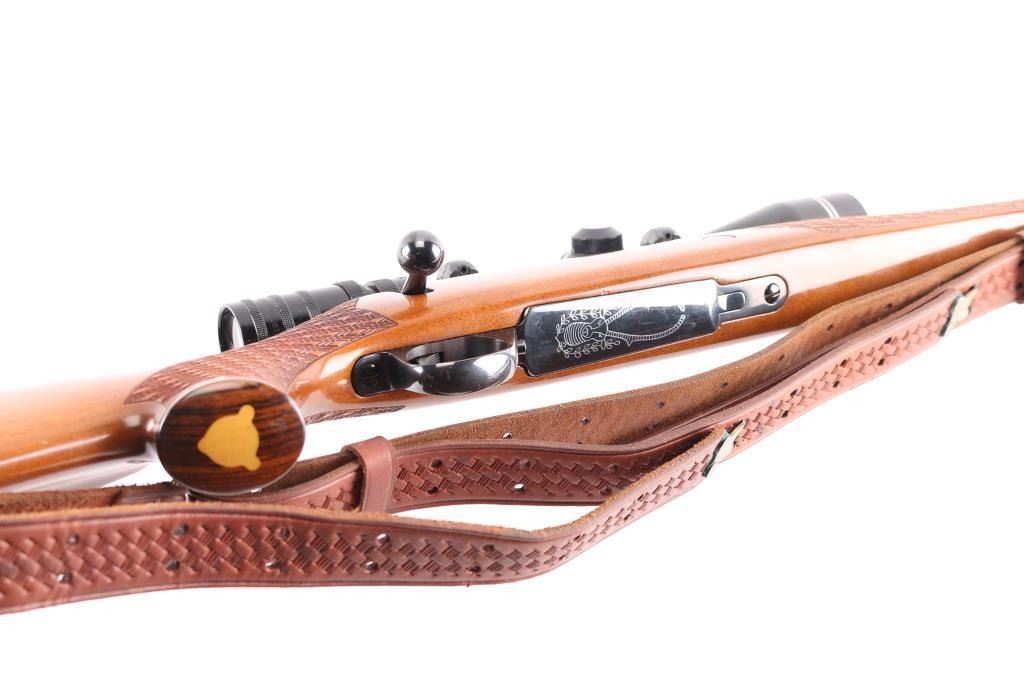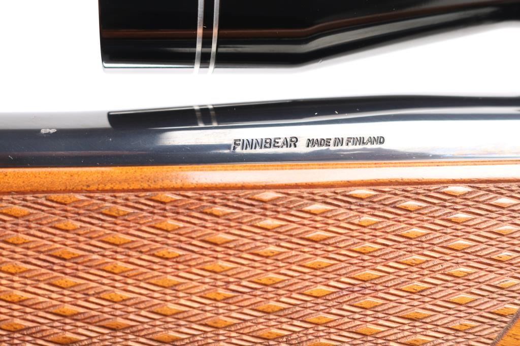 Finnish bolt action rifle, manufactured circa 1971, imported by Garcia Corp, Wash DC. Importer stamp on bottom of barrel forward of forend. Features blued finish, wood Monte Carlo stock with raised comb, right hand cheek piece, ventilated rubber recoil pad, checkered panels at forend & curved wrist, contrasting darker wood forend tip & grip cap (grip cap has inset bear logo in lighter color wood), sling swivels, 24" barrel, no sights, hinged floorplate, manual safety on right side of action, flat top receiver with dovetail rails, Redfield two piece scope bases & rings. Mounts a Mauser brand 3-9x40mm scope with duplex reticle. Engraved and silver color filled engraving of horned game animal on floorplate. Bore is very good condition. Retains 95% dark bluing with handling marks, several scuffs or dings on barrel. Stock is very good condition with dings and scrapes, good figure visible on right side of butt. Includes very good condition brown basket weave leather sling.