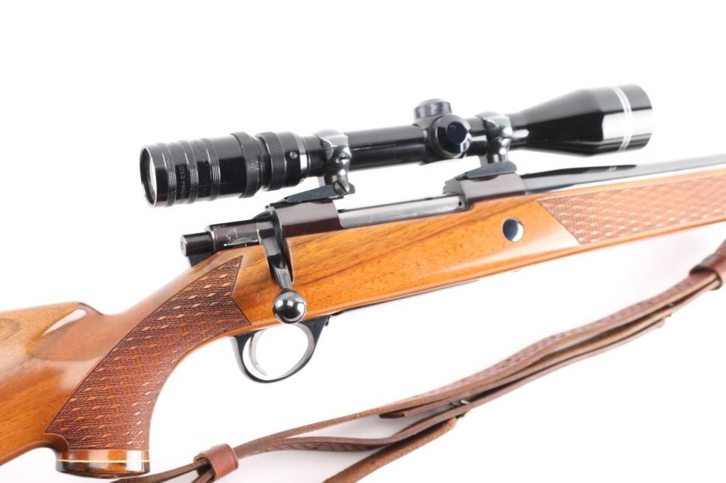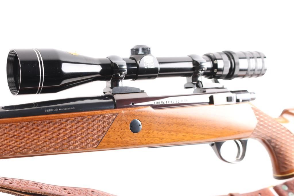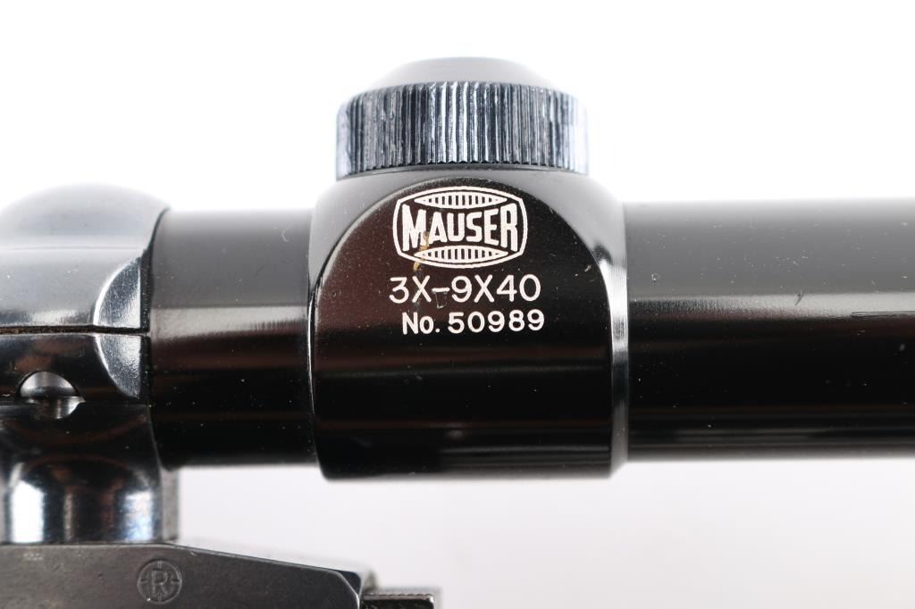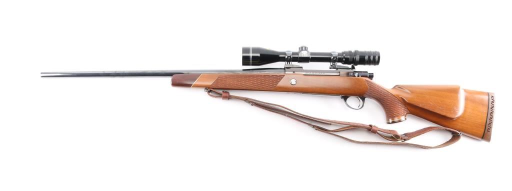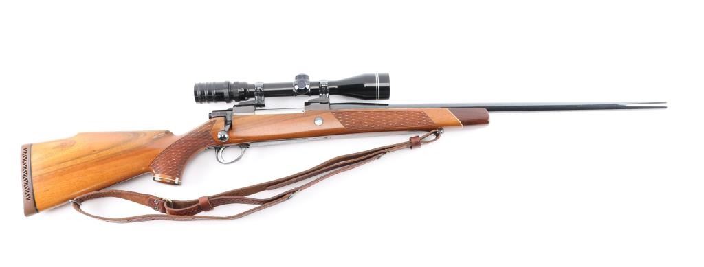 Finnish bolt action rifle, manufactured circa 1971, imported by Garcia Corp, Wash DC. Importer stamp on bottom of barrel forward of forend. Features blued finish, wood Monte Carlo stock with raised comb, right hand cheek piece, ventilated rubber recoil pad, checkered panels at forend & curved wrist, contrasting darker wood forend tip & grip cap (grip cap has inset bear logo in lighter color wood), sling swivels, 24" barrel, no sights, hinged floorplate, manual safety on right side of action, flat top receiver with dovetail rails, Redfield two piece scope bases & rings. Mounts a Mauser brand 3-9x40mm scope with duplex reticle. Engraved and silver color filled engraving of horned game animal on floorplate. Bore is very good condition. Retains 95% dark bluing with handling marks, several scuffs or dings on barrel. Stock is very good condition with dings and scrapes, good figure visible on right side of butt. Includes very good condition brown basket weave leather sling.