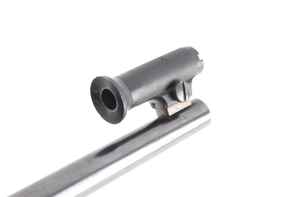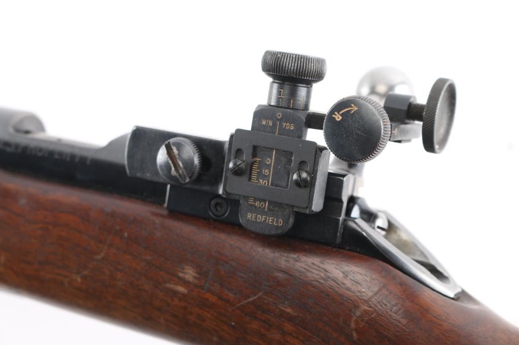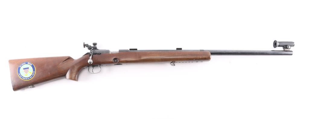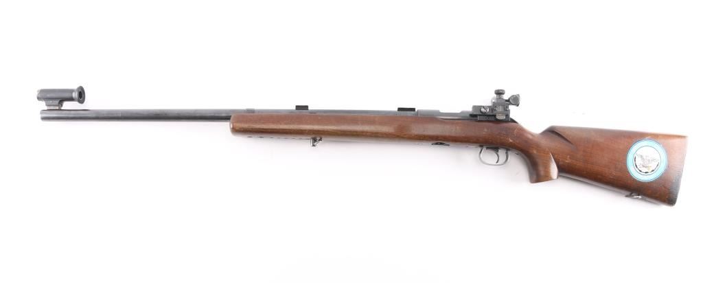 '52C Target' Desirable bolt action target rifle chambered in .22 Long Rifle, manufactured circa 1956. The model 52 is regarded by many as one of the finest small-caliber rifles ever built. It features a blued finish, 28" heavy bull barrel, Redfield International Match globe front sight, and a Redfield International Match peep sight mounted on the left side of the receiver, installed scope blocks, wide serrated trigger, manual safety on the right side of the receiver, polished bolt, push button magazine release, factory 5 round magazine, knurled metal buttplate and smooth walnut bench rest type pistol grip shoulder stock with inlayed accessory rail in the forend, sling swivels. Bore appears very good, needs cleaning. Retains 80% finish, much of it fading or thinning, showing mostly bare metal on bolt knob. Mag release button is mostly brown patina. Stock is very good with small dents and creases, DCM and other stickers on the side of the butt.