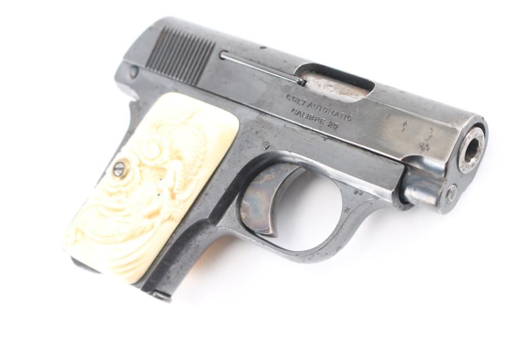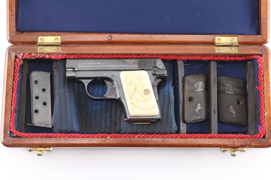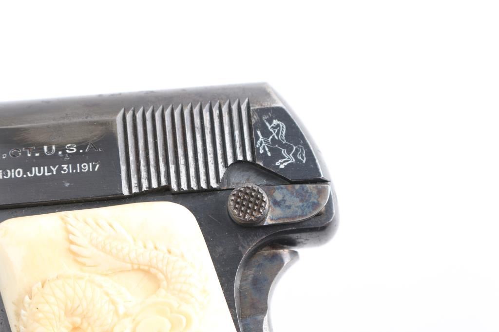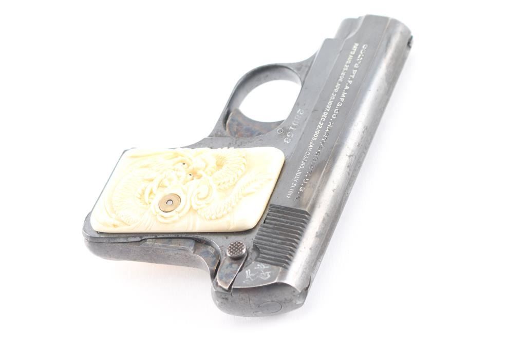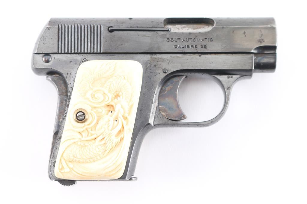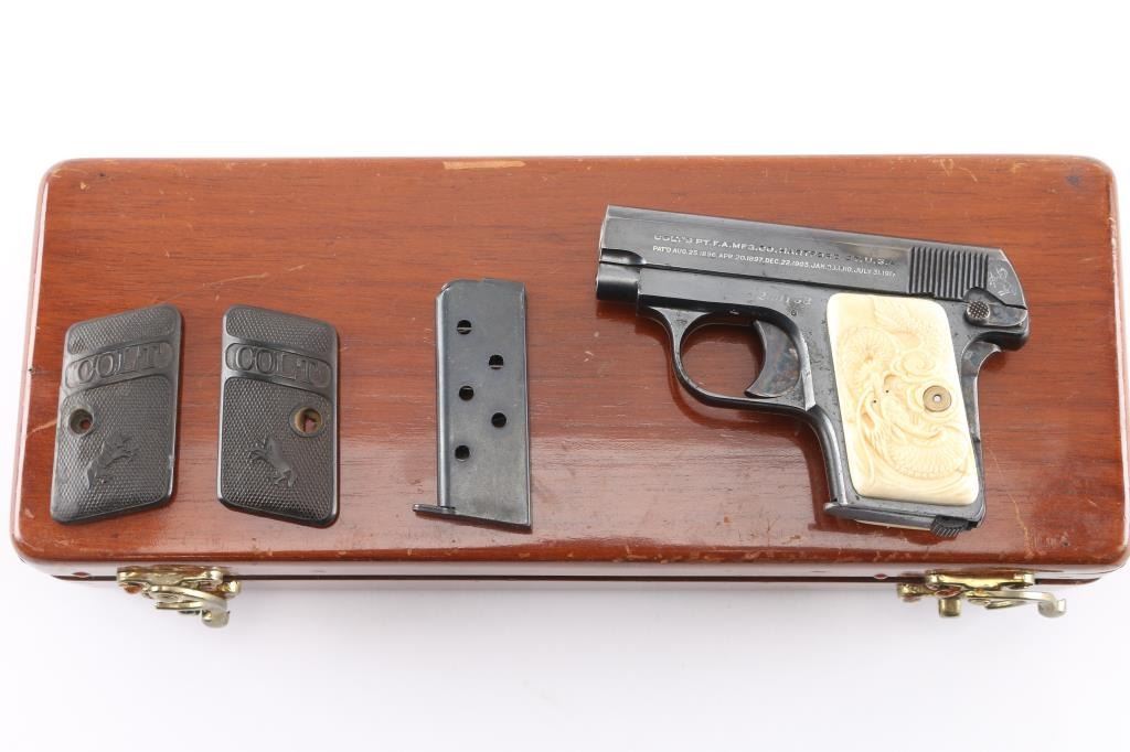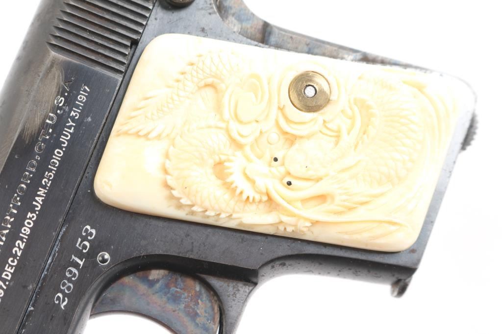with superb carved ivory grips featuring dragons in high relief on both sides. Pocket pistol manufactured circa 1921, features blued finish, 2" barrel, fixed sights, rear cocking serrations on the slide, smooth case hardened trigger, thumb safety, grip safety, 6 round factory magazine with heel release. Bore is very good. Retains 85% original finish with some losses from carry and cleaning, scattered pinprick patina. Includes original factory hard rubber grips and a spare magazine, in a WWII era wood presentation case with fitted compartments. This Colt was sold more than 25 years ago for Ray Hastey, who was a WWII Army Air Corps officer and liaison to the Flying Tigers in China. Mr. Hastey achieved the rank of full Colonel after WWII, where his duties in China brought him in contact with the O.S.S. and the highest ranking Chinese politicians, warlords, and mercenaries. This pistol was presented to him by a Chinese politician who had a master carve the grips in Hong Kong. "Little John" Gangel knew Mr. Hastey from he 1960's when he operated "The We Shoppe" on Main Street in Huntington Beach CA. Letter from Little John included to the successful bidder.