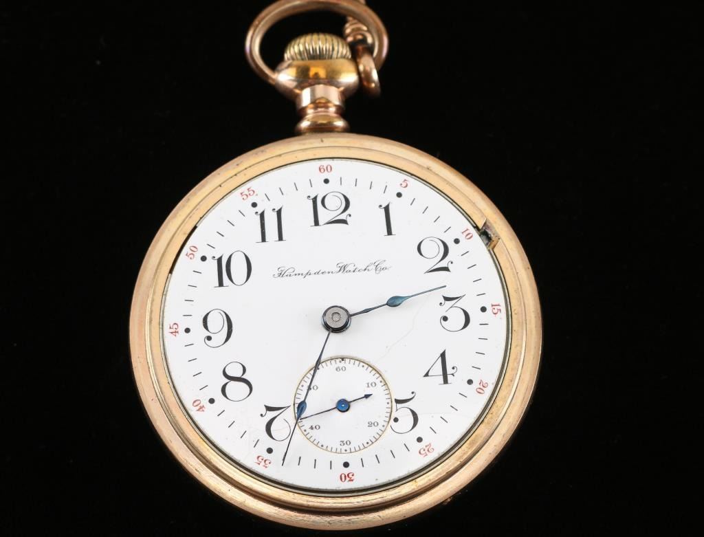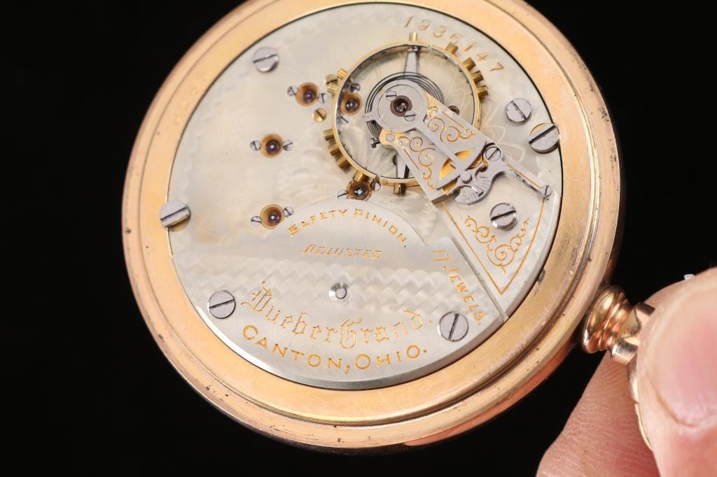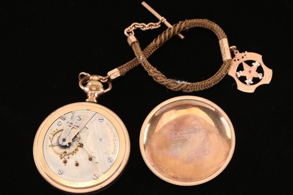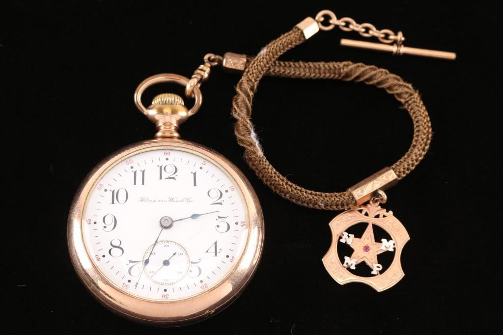 NM Mounted Police Charm on human hair braided watch fob .Open face, rolled yellow gold case. Size 18, Model Dueber Grand SN 1936147.
