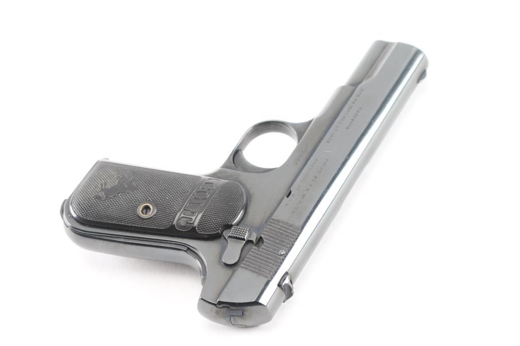 Vintage semi-automatic pistol manufactured circa 1916. Features a blued refinish, 3.75" barrel, low-profile round blade front sight, dovetailed 'u' notch rear sight, two-line/two-block address & patent marking on the left side of the slide, concealed hammer, smooth curved trigger, thumb safety, grip safety, heel magazine release, unmarked 7 round magazine, and checkered black hard rubber grips with embossed "COLT' & [Rampant Colt] insignias. Pistol exhibits an old good quality re-blue which remains in very good condition. The action appears mechanically sound, the bore appears serviceable and the hard rubber grips show edge wear.