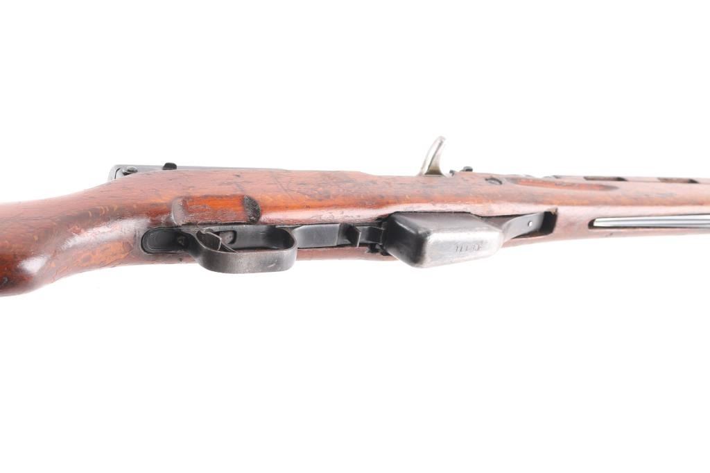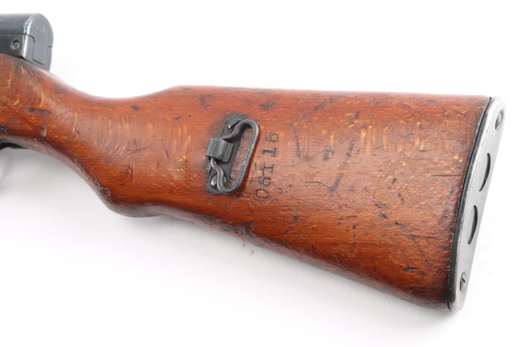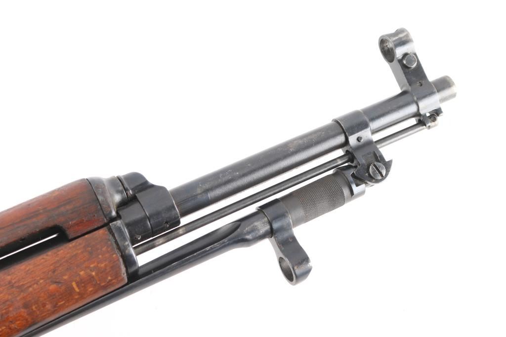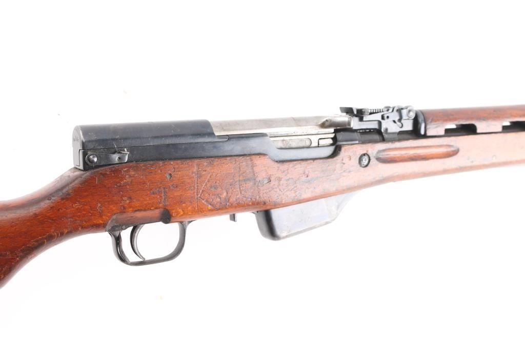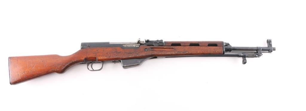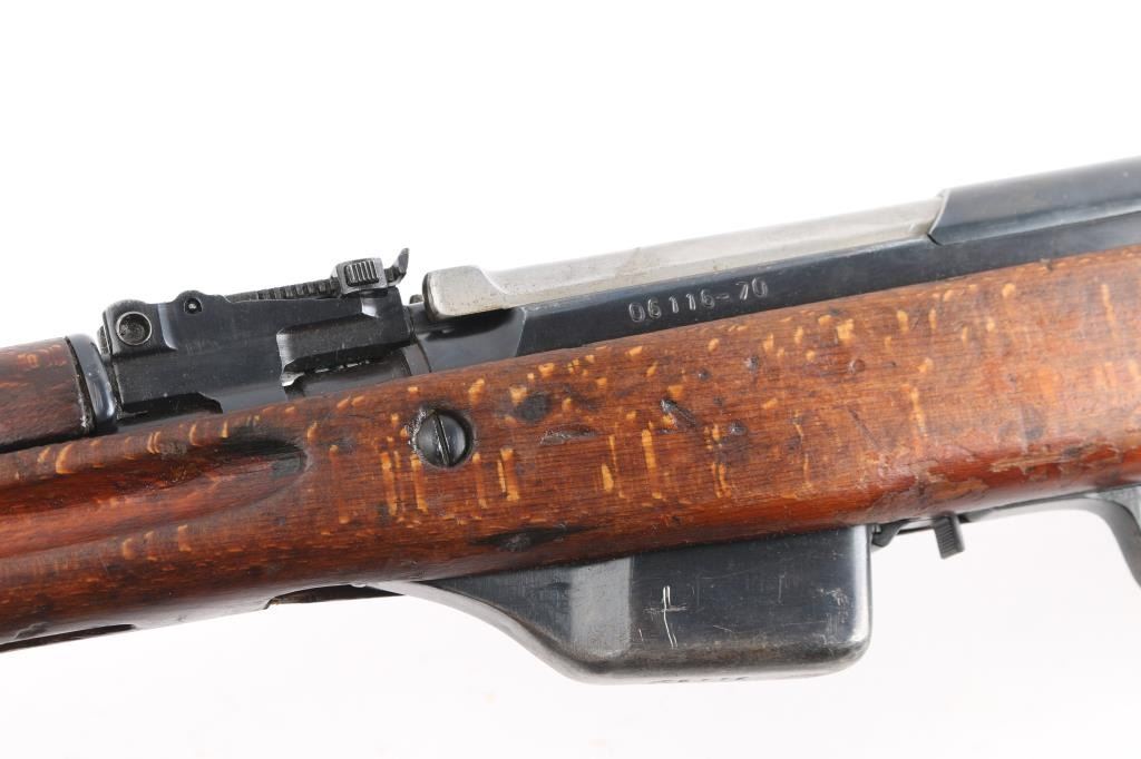 Imported by TG, Knoxville TN. Rare Albanian SKS rifle made in 1970. The Albanian SKS is the rarest of the mass-produced SKS' outside of North Korean, North Vietnamese, and East German made rifles. The Albanian SKS is different from other models as they made some changes like the AK style bolt handle, and the elongated stock and handguard for the gas system. 20.5" barrel, 11" folding spike bayonet, two trapdoors in butt plate for cleaning gear. Serial numbers matched on the receiver, magazine, bolt cover, and stock. Dated 1970, Bore is excellent/bright, blue finish is mostly all there, with scratches, edge/handling wear, and a area of very light pitting on the cover, action is smooth, the wood is sound, with numerous scratches/dings, some finish loss. Someone has carved "EM" in the right butt stock.