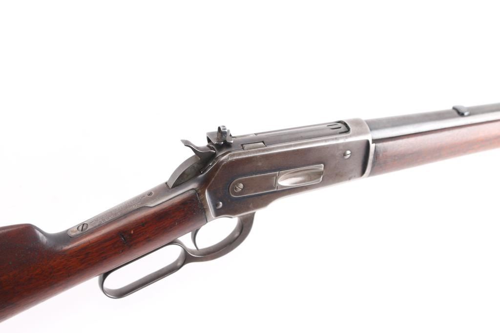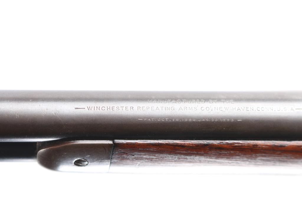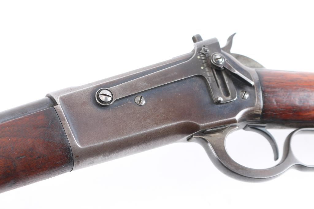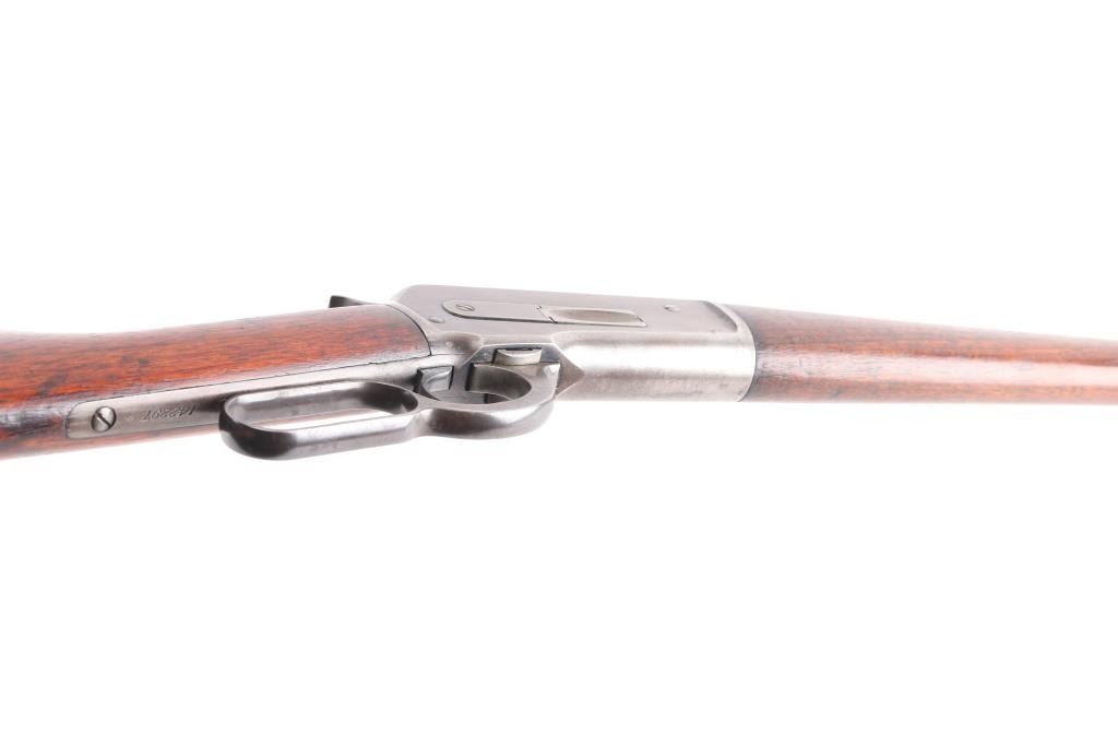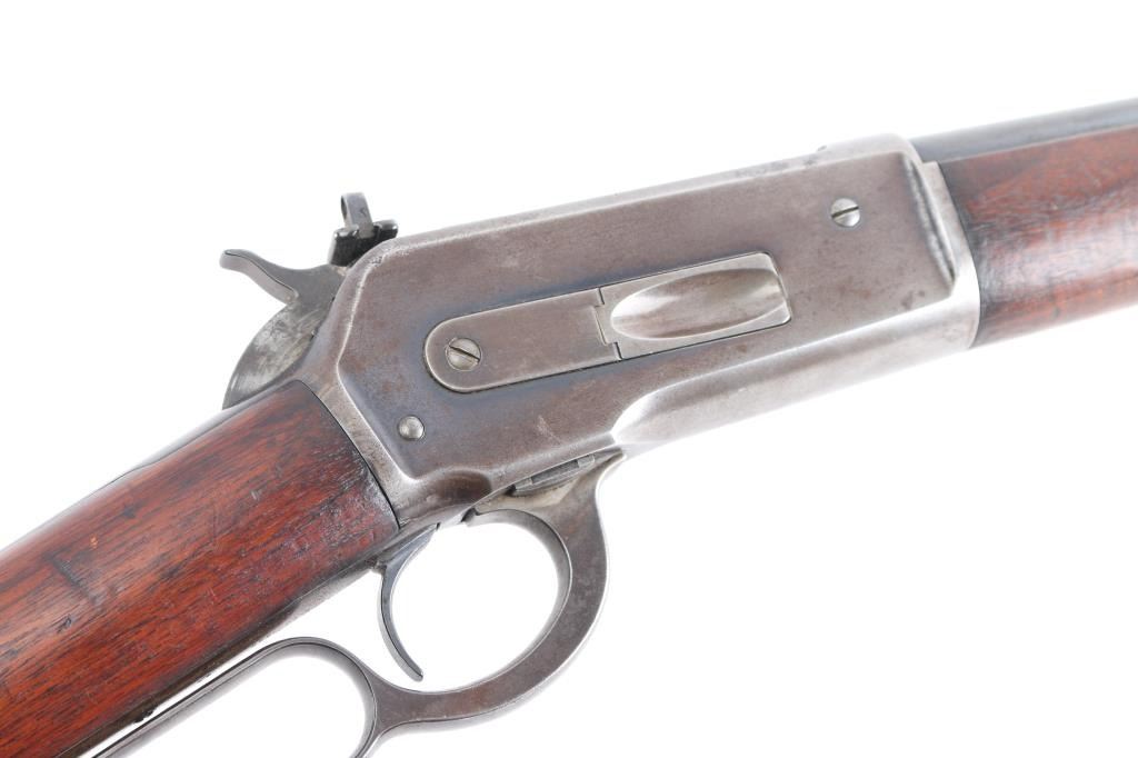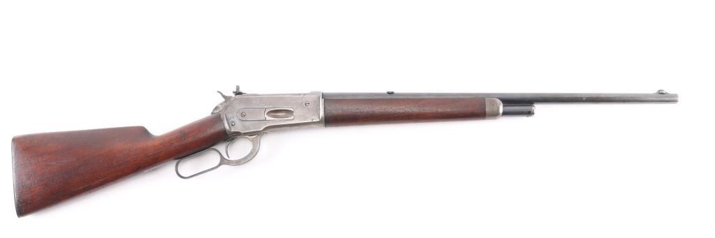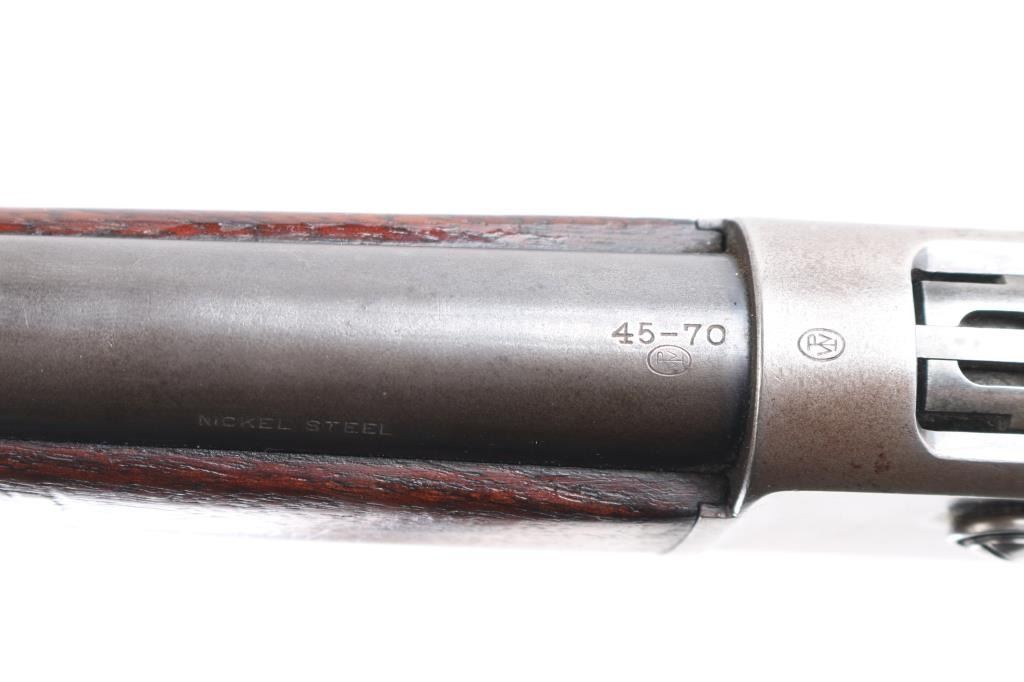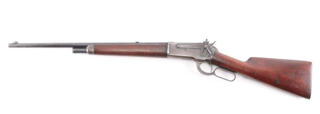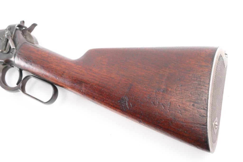 Scarce lever action repeating rifle chambered in .45-70 Government. Manufactured in New Haven, CT circa 1911. Features a blued finish, 22” round tapered barrel (outside diameter @ the muzzle measures .645”), 2/3 length magazine, low profile front sight base with Lyman round blade front sight with ivory insert, blank inserted into the rear sight dovetail, Lyman 21 receiver mounted sight, smooth curved trigger, checkered hammer spur, smooth straight grain walnut forend with metal cap and straight grip shoulder stock with shotgun metal buttplate. No factory info available on barrel length but crown and front sight base appear correct. Rifle retains approximately 50-70% of its original blued finish with the balance of the metal surfaces drifting to natural patina. The action is sound/tight, the rifling appears good but is full of dried grease (may clean well), the marking & edges are sharp and the walnut stocks are good to very good with minor dings, mars & scratches consistent with normal carry & use.